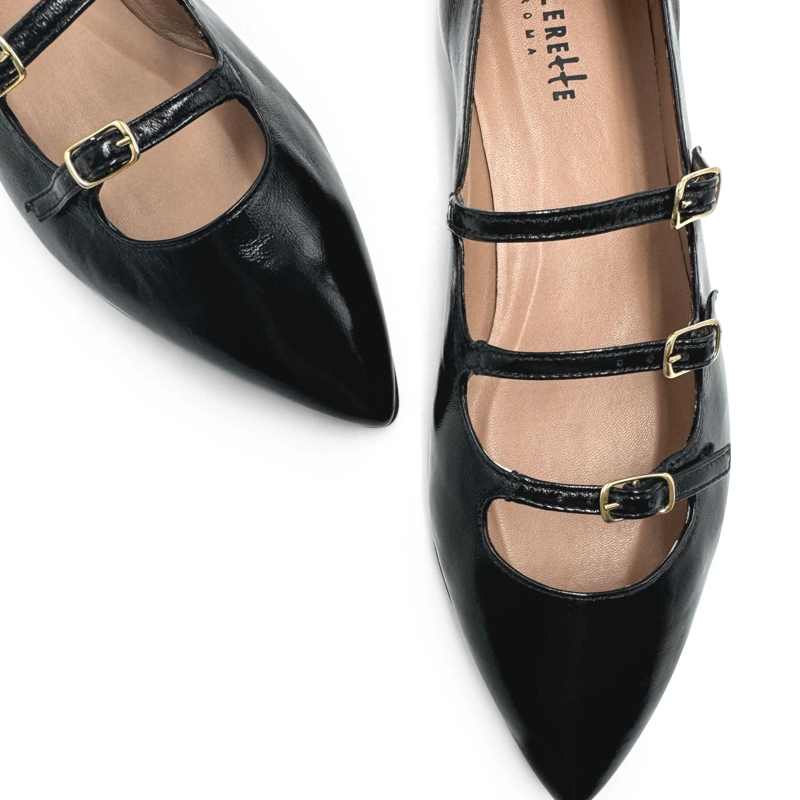 Eleganti, dalla forma affusolata e dal look attualissimo, le ballerine Arenula sono un modello a punta con tre cinturini ad accompagnare il piede e metalleria oro. Disponibili in una scintillante e morbida pelle nera, sono interamente foderate in pelle.