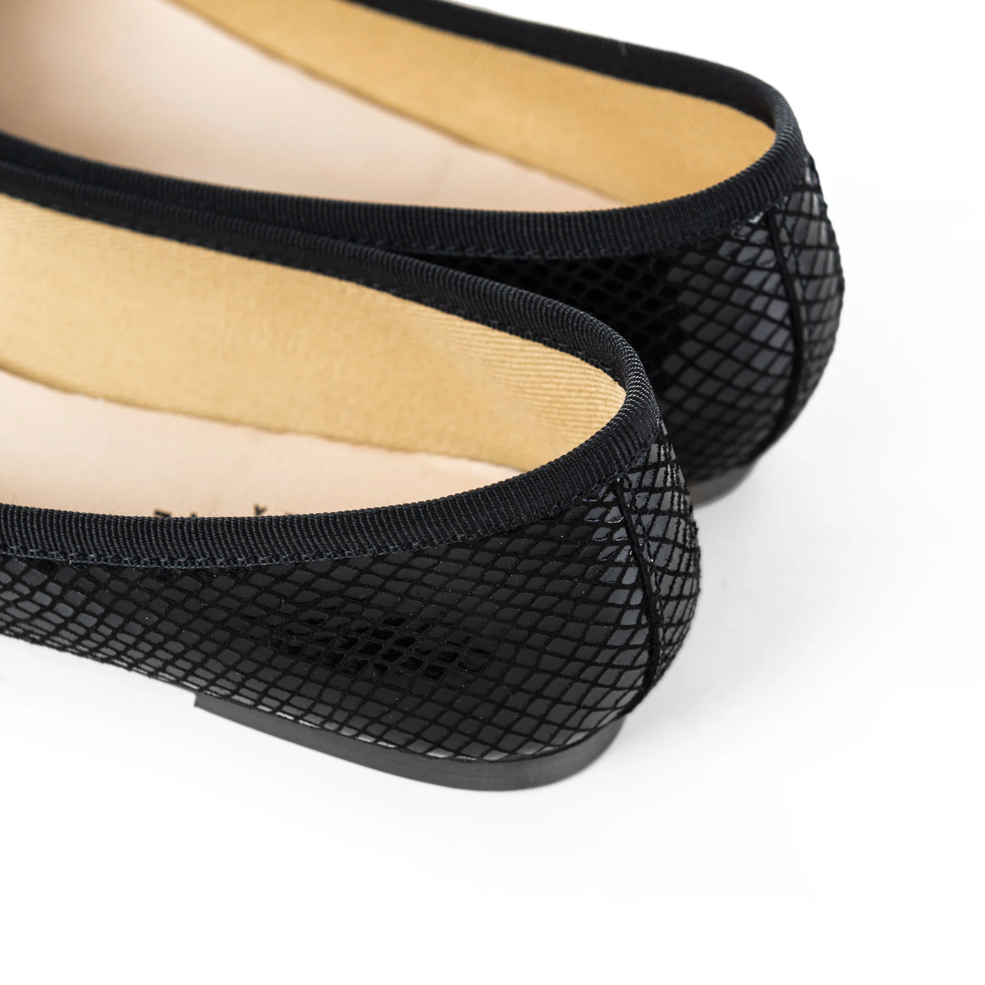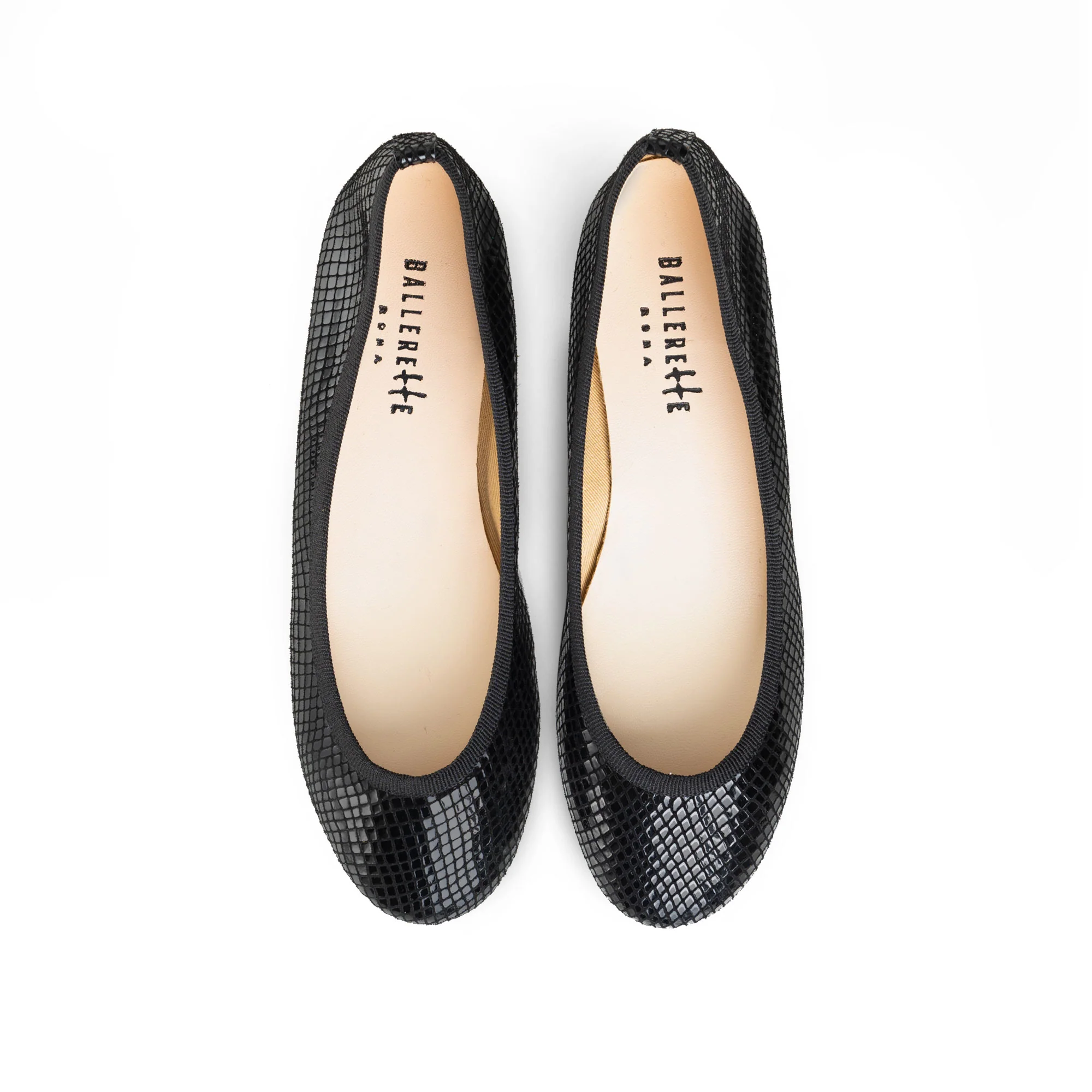 Minimal ed eleganti, il modello Colonna sono ballerine nere con punta tonda e scollo classico. Il bordo è profilato in gros grain tono su tono e la scarpa è realizzata in camoscio laminato nero con stampa laminata a effetto pitone creando piccole zone di luce. Morbide da calzare e molto femminili sono rifinite con sottopiede in pelle e fodera in cotone. Il tacco 0,5 cm di altezza. Le ballerine Colonna sono, in questa versione total black, un modello da indossare quotidianamente sia di giorno che di sera, per il loro stile semplice e ricco allo stesso tempo. Un passepartout che può accompagnare un look sportivo come una serata dalle esigenze più eleganti e tutto l’arcobaleno di colori e materiali. Perfette anche per accompagnare e illuminare la semplicità di un abito nero.