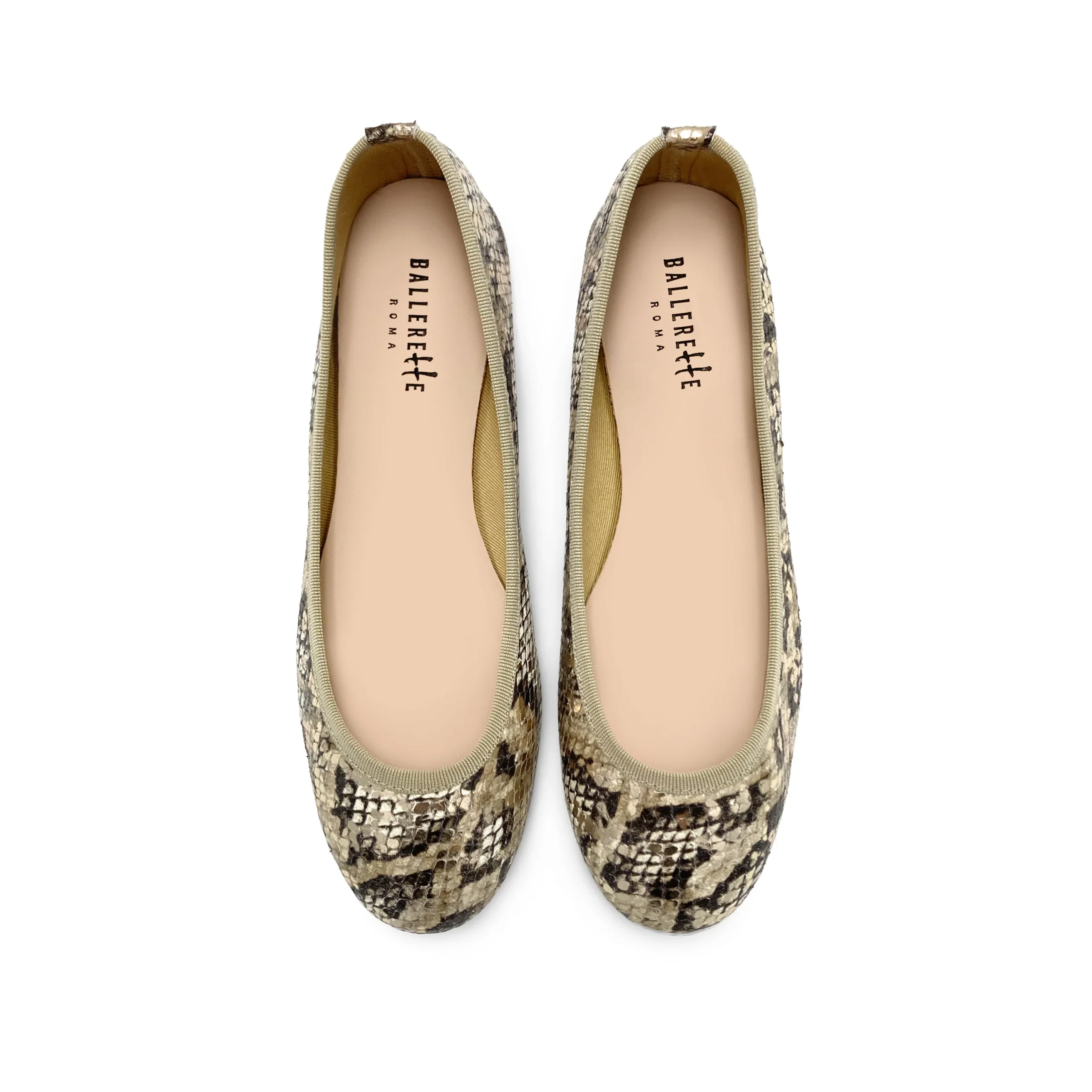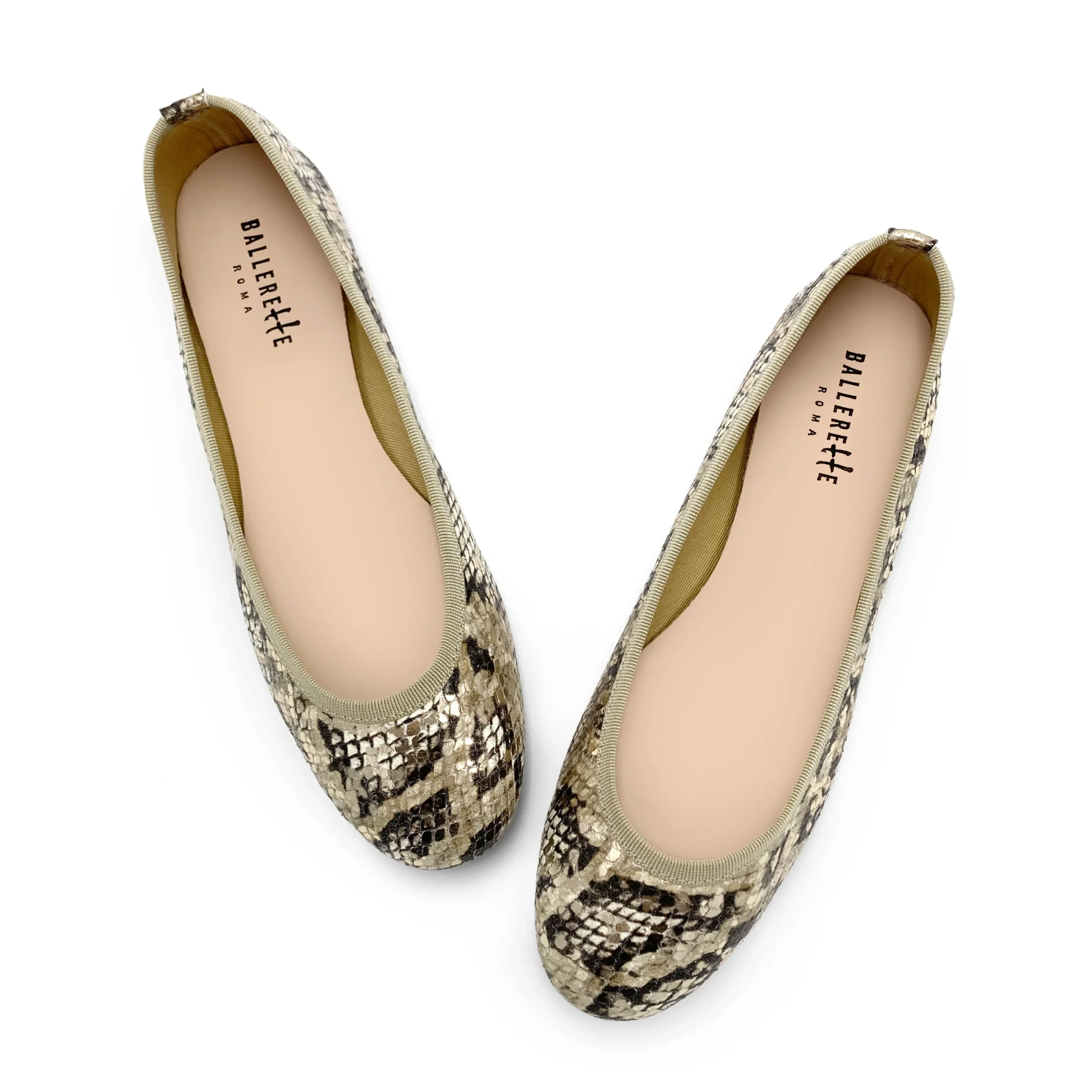 Le Colonna sono ballerine classiche a punta tonda, scollo regolare e suola bassa con un piccolo tacco di 0,5 cm di altezza. Realizzate in pelle con stampa snake sui colori naturali del terra, marrone, beige e avorio, hanno dettagli in lamina oro per dare un tocco di ricercata eleganza. Da indossare di giorno come di sera, queste scarpe basse pitonate sono foderate in cotone e con sottopiede in pelle. La scollatura è bordata in gros grain in tinta. Puoi abbinare il modello con tinte neutre come il tortora o il beige o a contrasto con colori accesi dal rosso al verde bosco. Che tu scelga di indossarle con abiti o pantaloni, le tue ballerine animalier sapranno rendere unico e indimenticabile il tuo look.