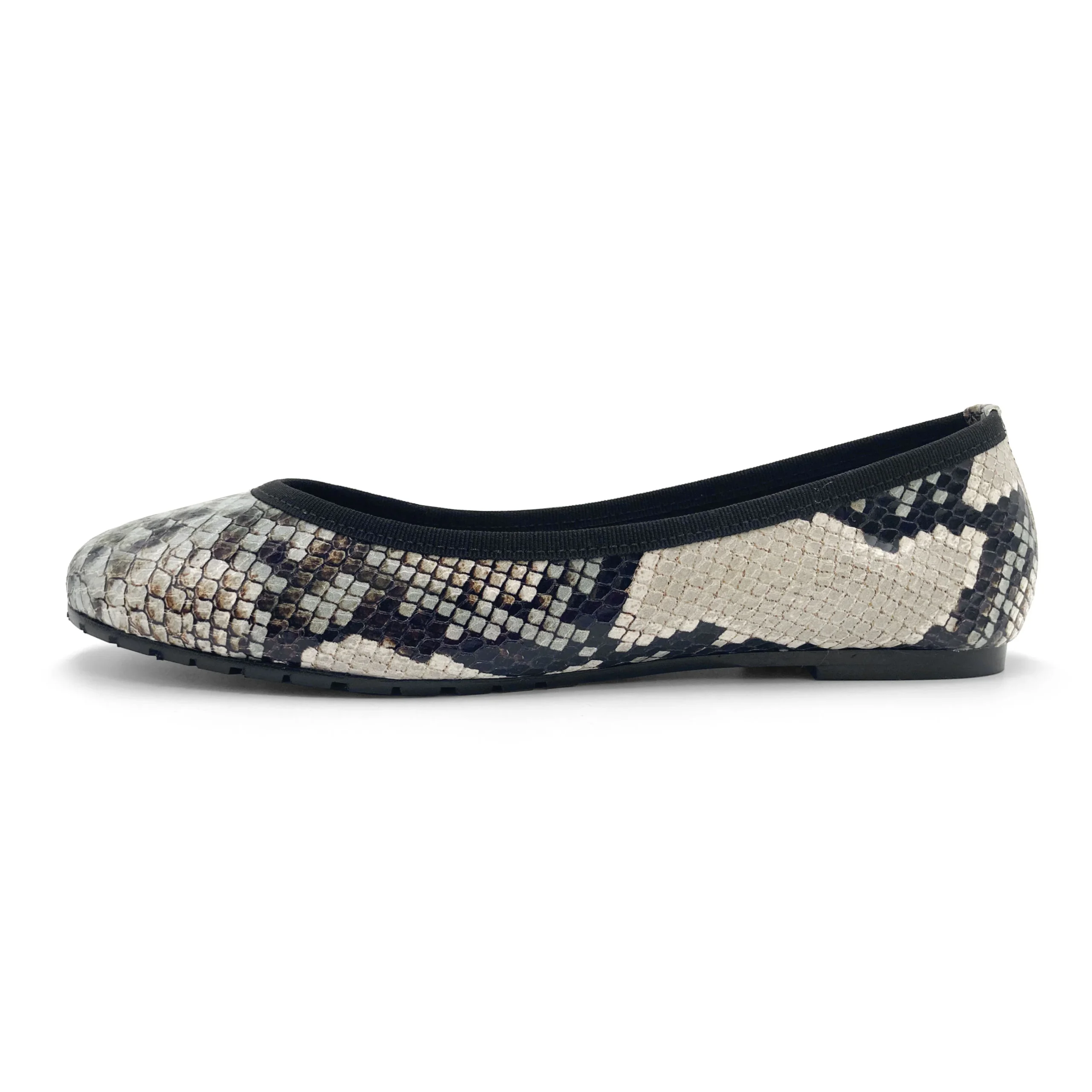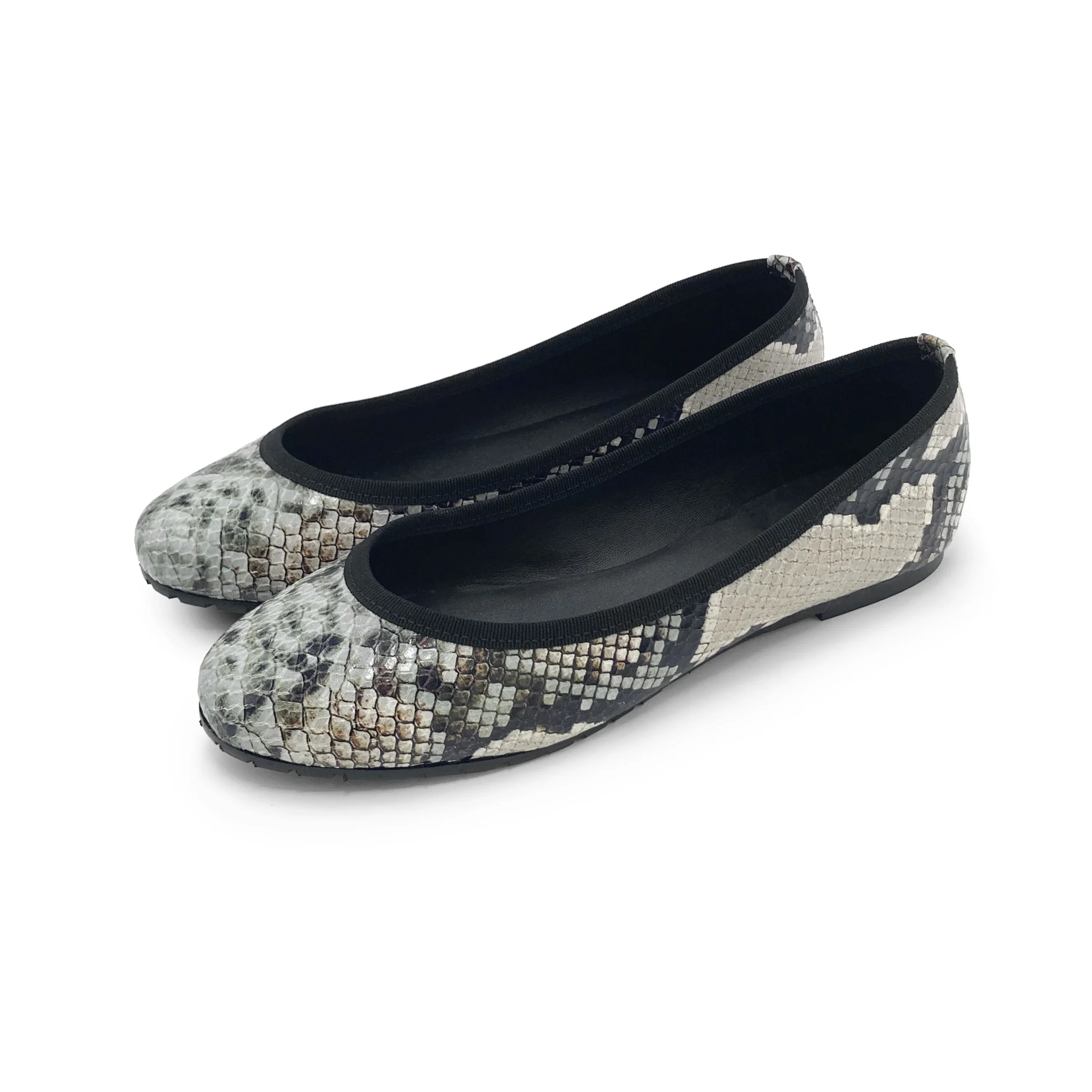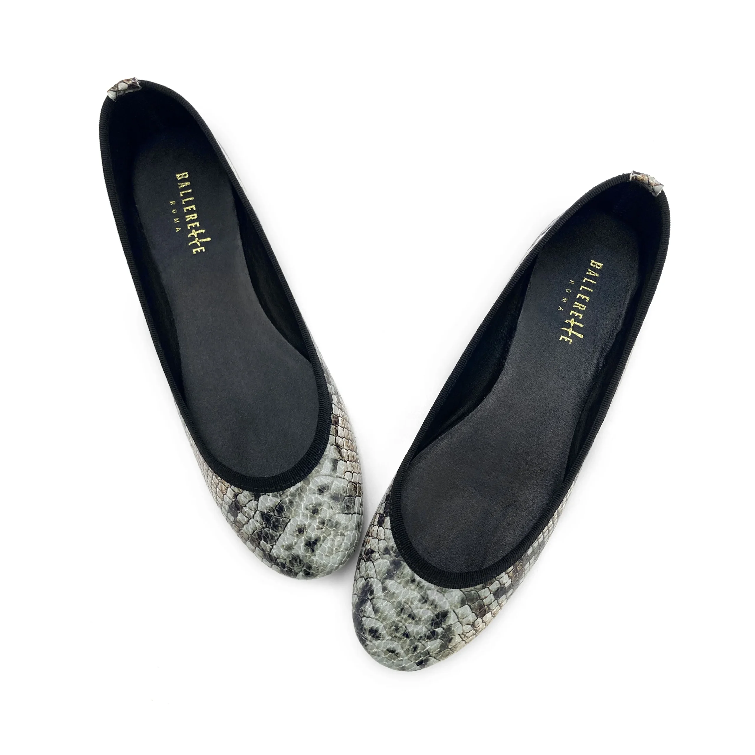 Le ballerine a punta tonda modello Colonna si caratterizzano per una silhouette minimale, capace di conferire un’eleganza sobria e attuale a chi le indossa. Ideali per chi desidera una scarpa raffinata e facile da integrare nel guardaroba quotidiano, questa versione realizzata in pelle con stampa pitonata nei toni dell’azzurro cerulo, grigio e nero si distingue per il suo look sofisticato e neutro, perfetto per aggiungere personalità senza eccessi. Oltre al forte impatto visivo, garantisce un’eccellente comodità grazie alla suola leggera e flessibile e alla qualità dei materiali. La tomaia in pelle pitonata è impreziosita da una delicata finitura opaca che ne esalta la texture, mentre il profilo in gros grain nero rifinisce con discreta eleganza la linea dello scollo. All’interno, il sottopiede e la fodera in pelle assicurano comfort anche nei mesi più freschi. La para leggera offre una camminata stabile senza compromettere la leggerezza e la flessibilità complessiva della scarpa. Le ballerine Colonna in pelle animalier snake sono una scelta distintiva per chi ama uno stile curato ma versatile: perfette con pantaloni cropped e una camicia in seta bianca per un look da ufficio moderno, si abbinano con facilità anche a gonne midi in denim, jumpsuit nei toni del sabbia o abiti strutturati blu o grigio antracite. Per la sera, valorizzano con stile un completo sartoriale nero, una tuta fluida navy o un abito lungo in seta perla. Pensate per chi cerca un equilibrio tra praticità, ricercatezza e versatilità in un’unica calzatura.