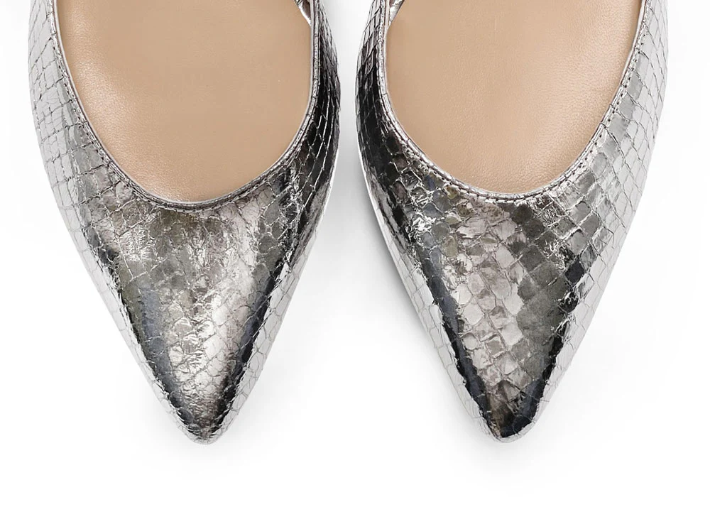 Le Murat sono ballerine estive con scollo laterale e una forma moderna e affusolata con punta e tacco di 2 cm. Il pellame ha una particolare lavorazione laminata a trama pitonata che dona un prezioso luccichio al modello. La scarpa è foderata in pelle. Puoi scegliere se indossare queste scarpe basse aperte di giorno, per dare un tocco di luce a un abito monocromatico o ad un tailleur rigoroso, o di sera con un abito di seta bianco o un coraggioso sparkling total look argento.