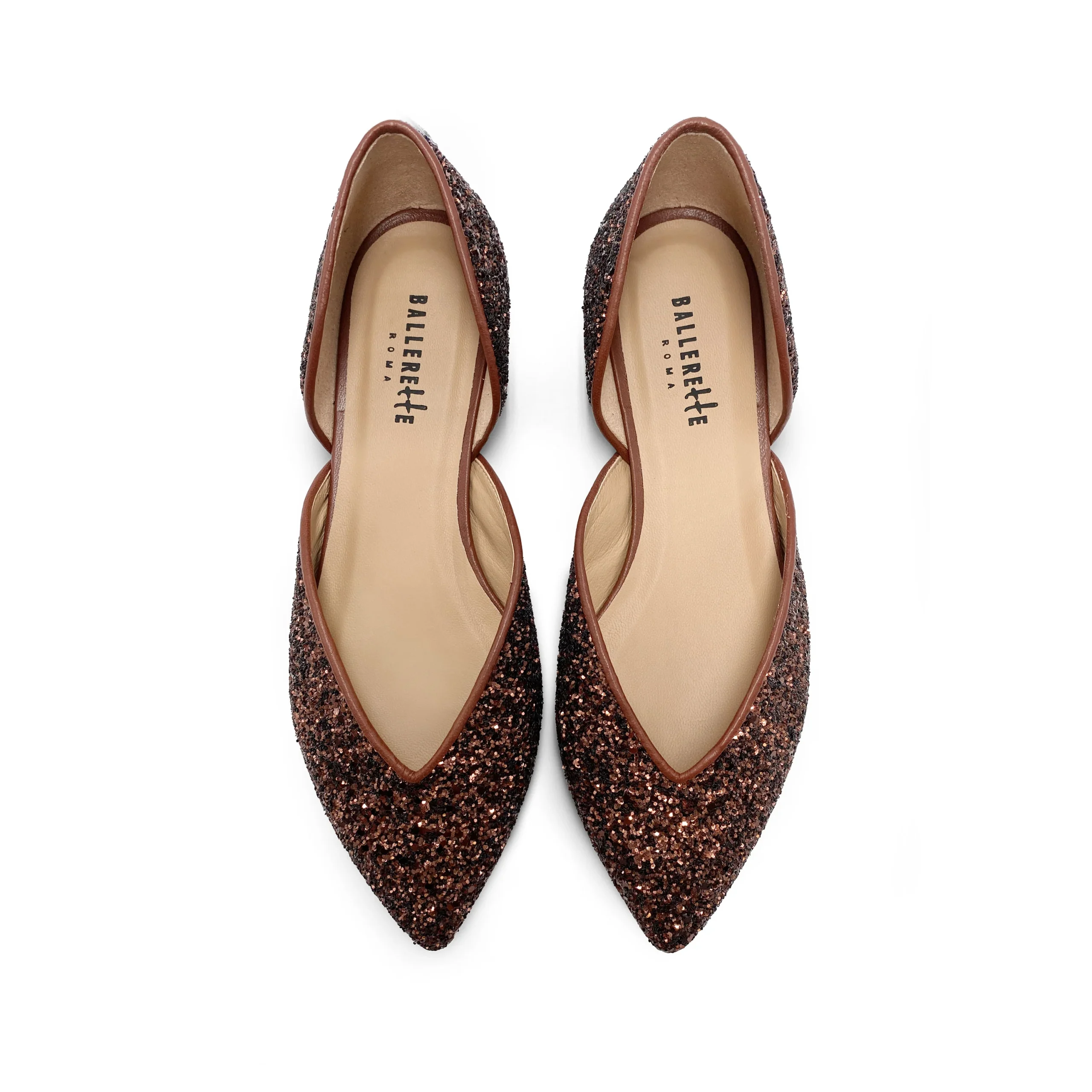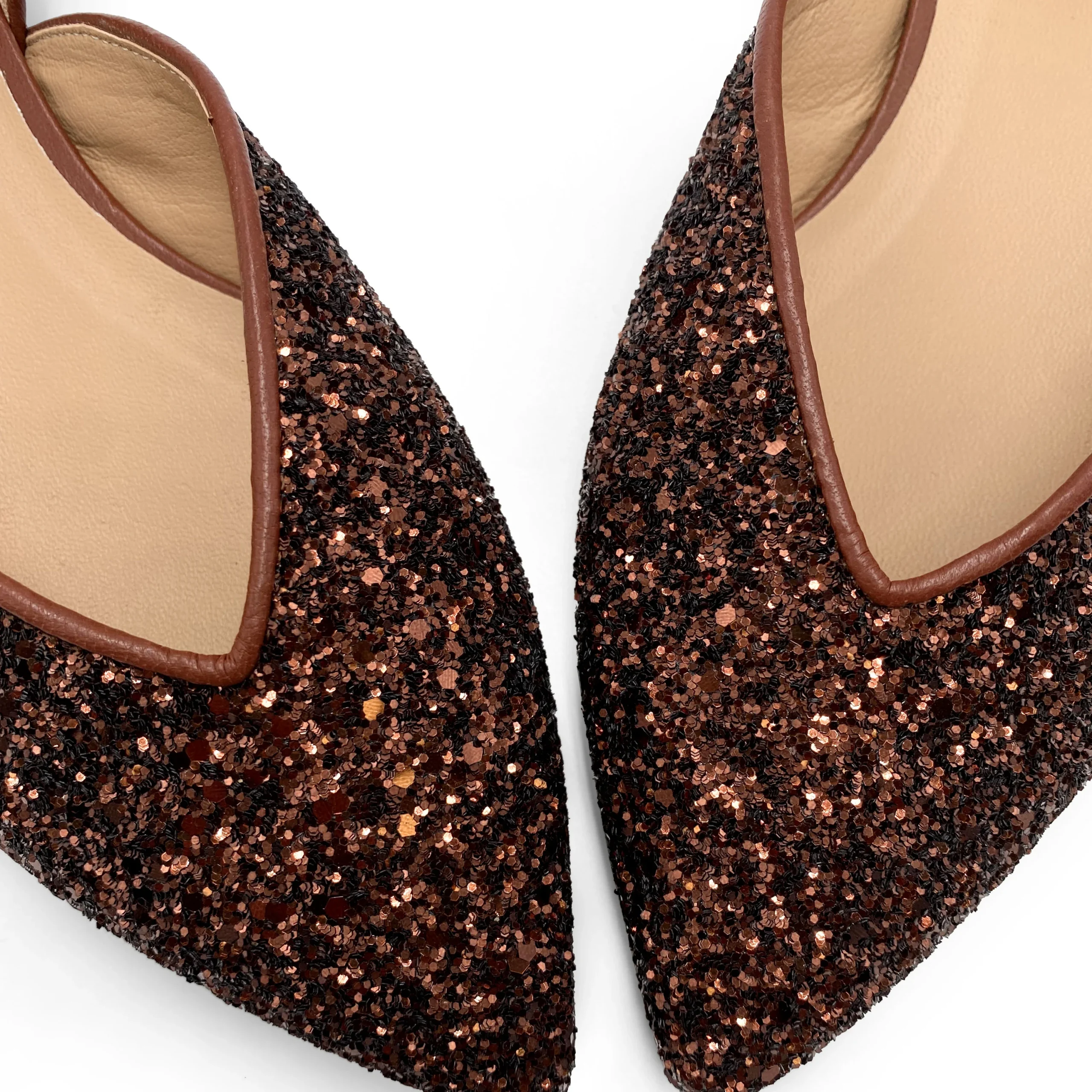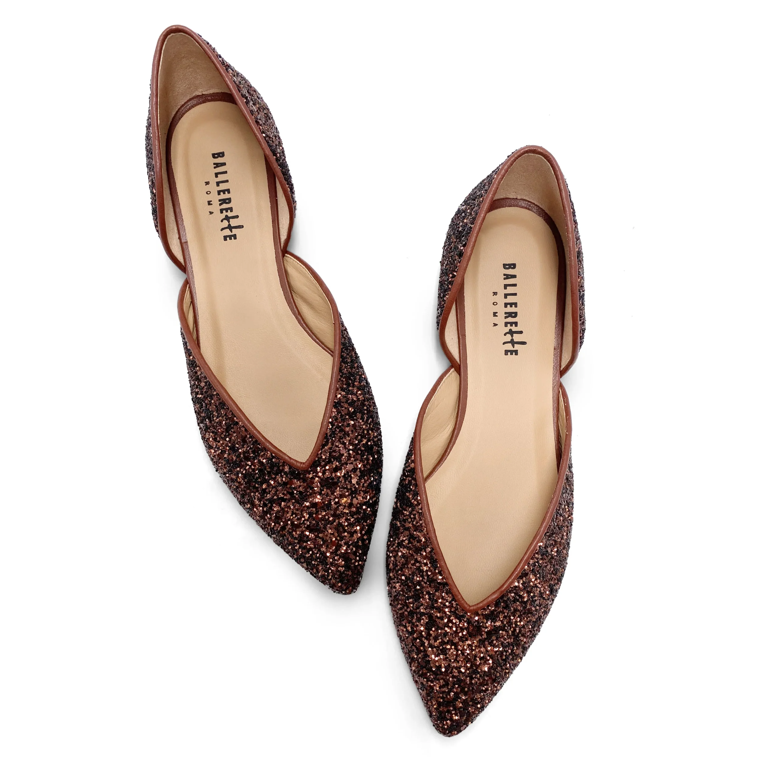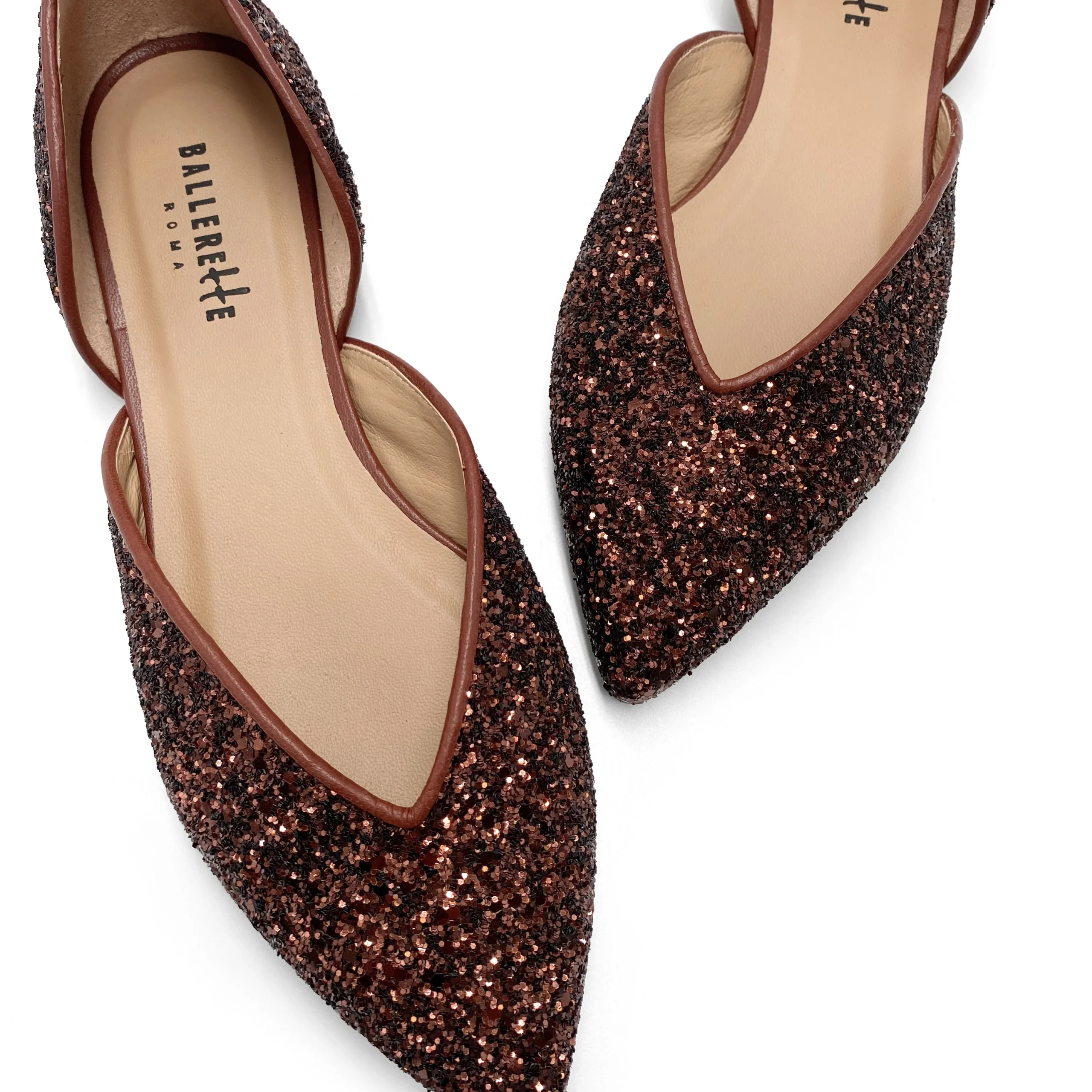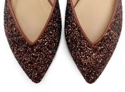 Le Panisperna sono scarpe ballerine aperte ai lati, dal design femminile e moderno. Realizzate in glitter color bronzo, hanno una comoda punta con elegante scollo a V. L’interno è foderato in pelle e la suola è realizzata in cuoio con tacco 0,5 cm. Queste ballerine da sera sono la scelta ideale per chi desidera una scarpa versatile adatta ad un’occasione speciale come a dare un tocco di luce a un outfit da giorno. Per sentirti davvero elegante prova a indossarle con un completo in seta blu elettrico oppure con un mini abito con spalle scoperte in crepe bianco.