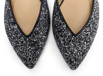 Le ballerine Panisperna sono scarpe basse estive da sera, aperte e scollate ai lati, dalla linea affusolata ed elegante a punta. Realizzate in un luminoso glitter grigio ferro, sono foderate in pelle e hanno suola in cuoio con tacco di 0,5 cm. La femminilità dello scollo a V e la tomaia brillante, rendono queste ballerine un modello di punta per le tue feste etive come per dare un tocco di luce a un semplice skinny jeans nero e t-shirt bianca.