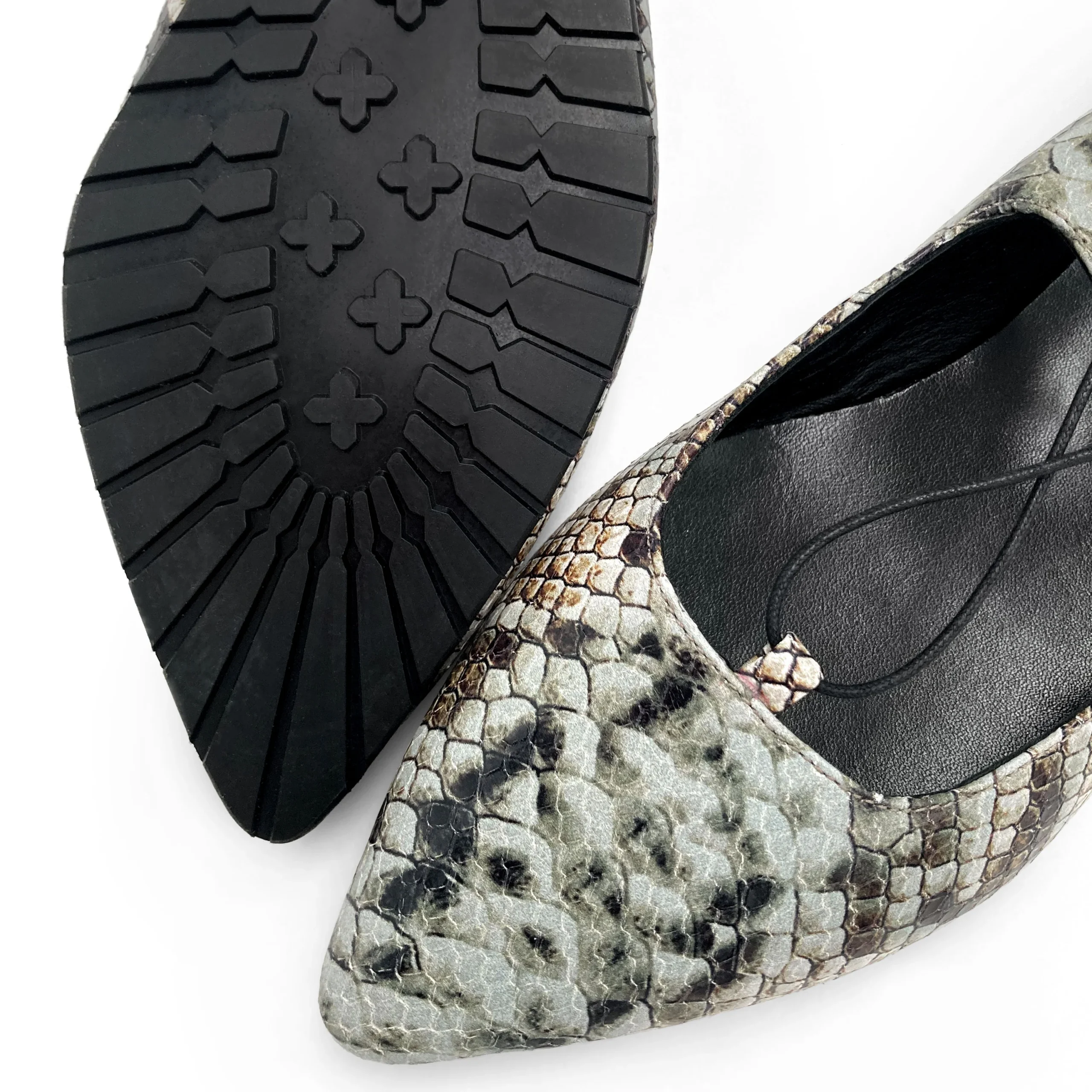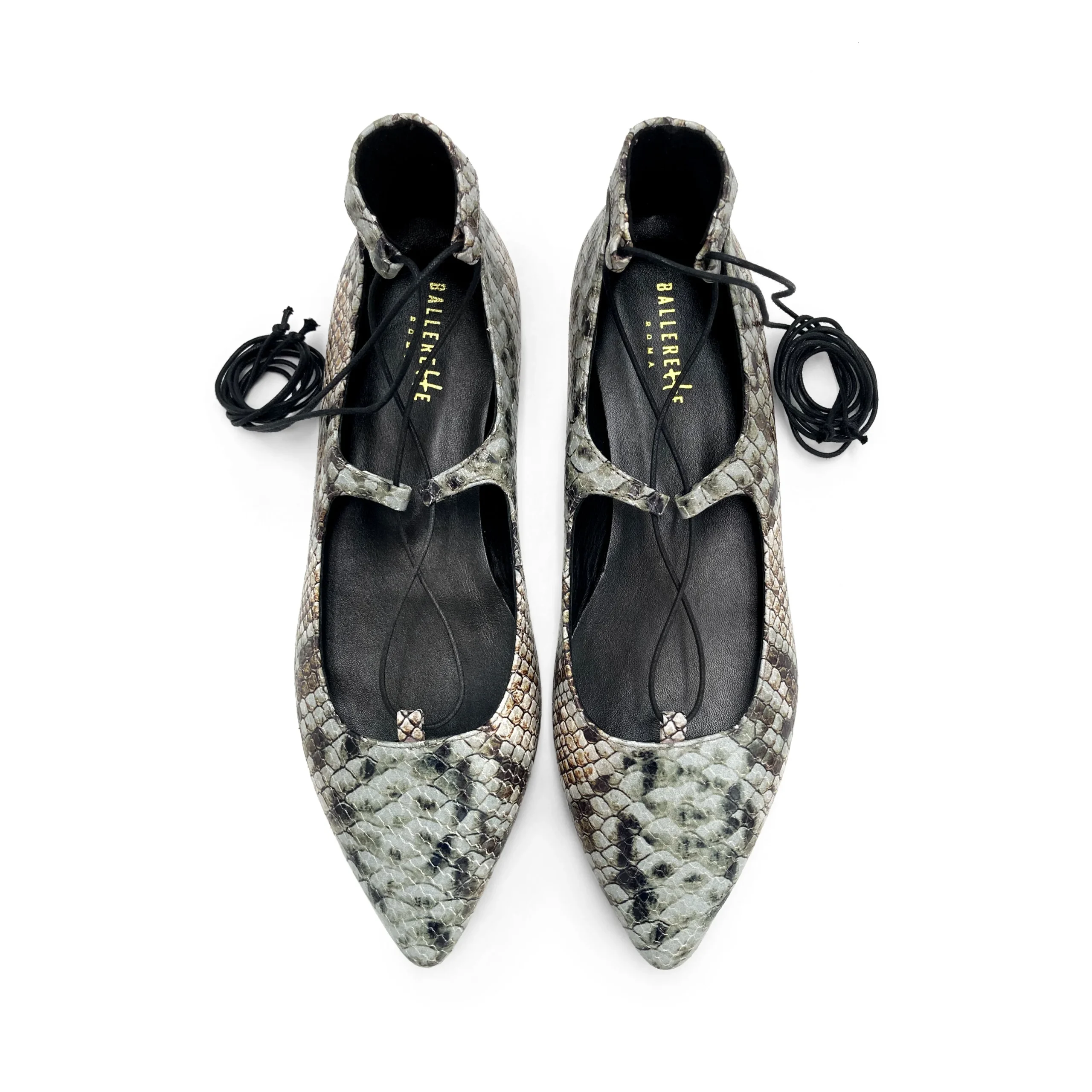Le ballerine con lacci alla schiava Colosseo si caratterizzano per la loro eleganza contemporanea e lo stile deciso, perfettamente in linea con le tendenze attuali. Il design con punta affusolata e scollo regolare slancia la silhouette e valorizza il piede, mentre i lacci sottili permettono di personalizzare la calzata annodandoli alla caviglia o avvolgendoli sul polpaccio, per un effetto femminile e sofisticato. Questa versione è realizzata in pelle con stampa pitonata nei toni dell’azzurro cerulo, grigio e nero, un mix cromatico neutro ma ricercato che rende la scarpa facilmente abbinabile e perfetta per aggiungere un tocco di carattere anche ai look più semplici. La fodera in pelle garantisce comfort, mentre la suola in carrarmatino nero leggero assicura grip e stabilità senza appesantire il passo. Pensate per chi ama uno stile femminile ma dinamico, queste ballerine con lacci neri si abbinano perfettamente a gonne midi, abiti morbidi e pantaloni culotte, ma sono ideali anche con jeans a sigaretta o mini abiti abbinati a calze coprenti. Raffinate con un completo in maglia nei toni del ghiaccio o con un abito lungo fluido dai colori neutri, risultano grintose ed eleganti se indossate con un blazer oversize e pantaloni in pelle. Una scelta di carattere per chi cerca una calzatura che unisca estetica, comfort e versatilità.