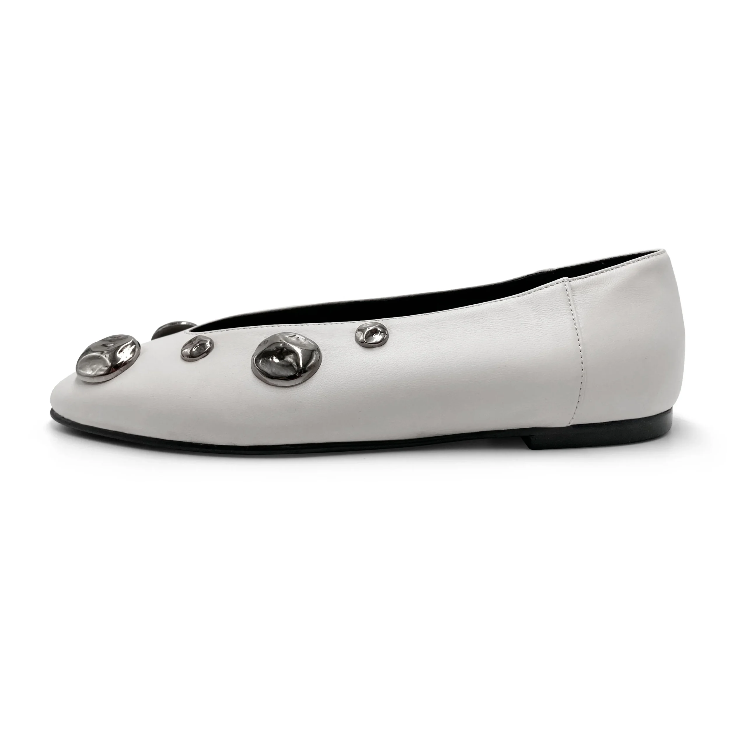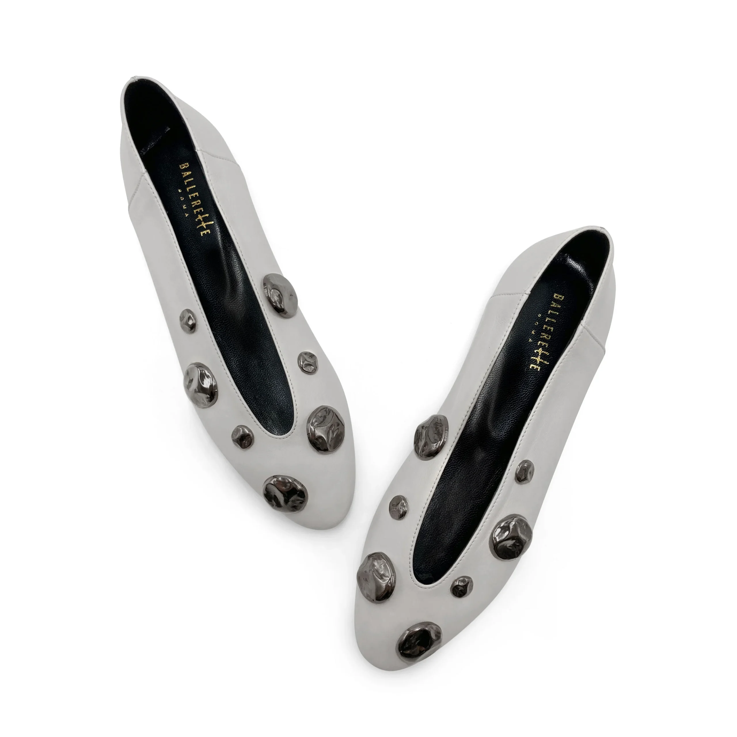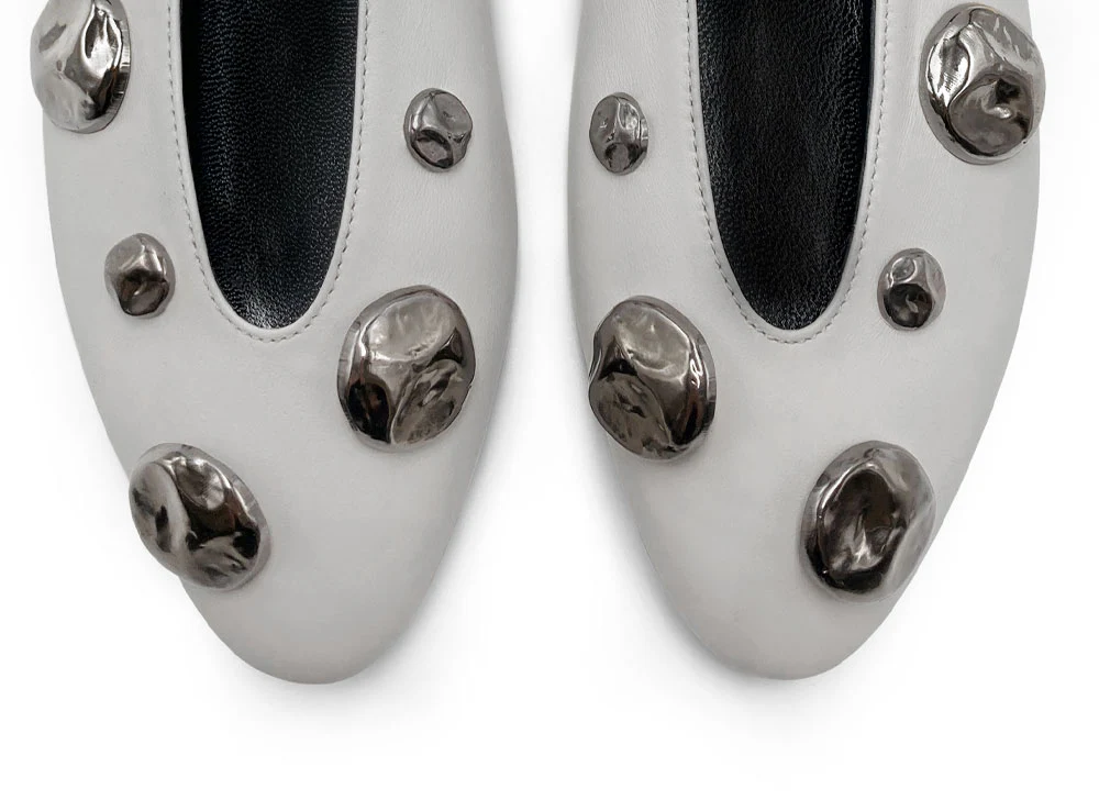 Le ballerine a punta Torlonia si distinguono per una linea pulita ed essenziale, valorizzata da una scollatura alta che dona slancio e un’eleganza moderna. Realizzate in morbida pelle grigio perla, queste scarpe basse si arricchiscono di un dettaglio dal carattere deciso: borchie tonde in finitura ferro, distribuite in diverse dimensioni sulla tomaia, per un effetto grafico e contemporaneo. Foderate in pelle nera, con sottopiede coordinato, assicurano comfort e raffinatezza a ogni passo. Versatili e sofisticate, le Torlonia si indossano con facilità sia di giorno che di sera: perfette con pantaloni sartoriali e blazer oversize per un look urbano e disinvolto, oppure abbinate a gonne midi plissé o a un mini dress strutturato per un outfit più audace e ricercato. Un modello iconico che unisce minimalismo e carattere, per chi ama distinguersi con stile.