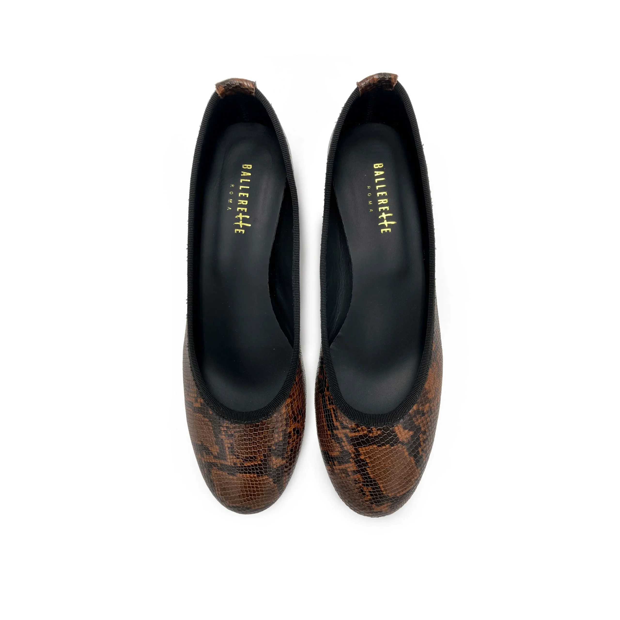 Le ballerine Aventino hanno una classica punta tonda e un tacco di 4 cm che conferisce comodità aggiuntiva alla calzata. Questa versione ha la suola in carrarmatino nero che le rendende pratiche da indossare anche nei mesi più freddi. La fodera interna è in pelle e il sottopiede è leggermente imbottito sul tallone per un’ottima vestibilità e comodità. Queste sofisticate ballerine invernali con tacco alto in pelle a stampa pitonata sui toni del nero e marrone sono laccessorio perfetto per rendere chic e alla moda look minimal: decisamente da provare con un tubino verde bottiglia o con un paio di pantaloni senape e una blusa nera.
