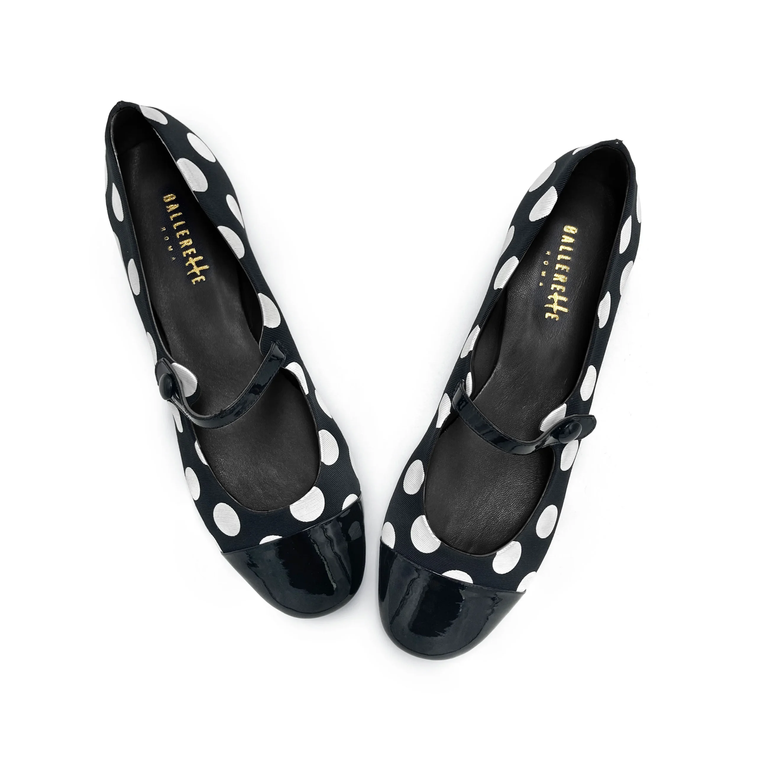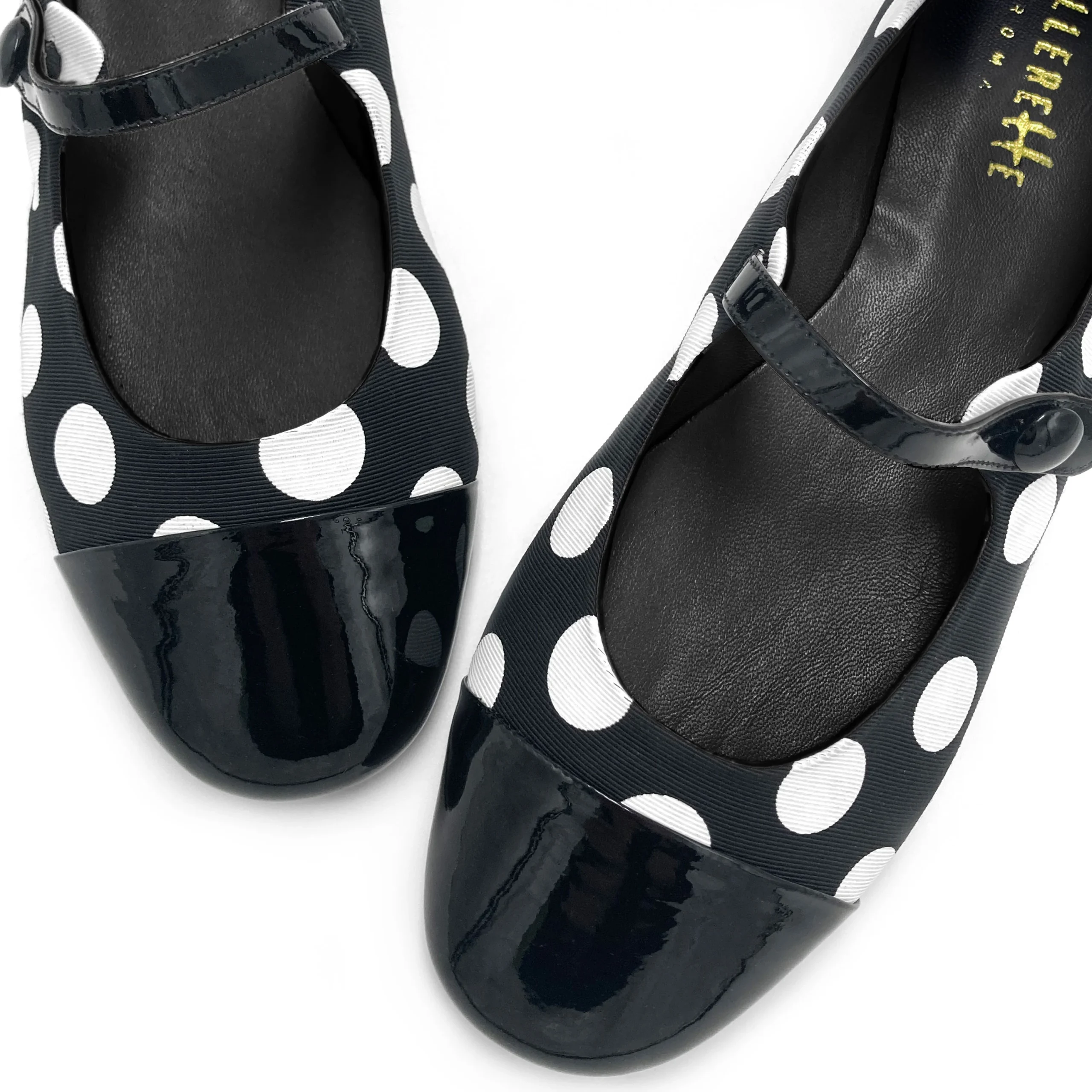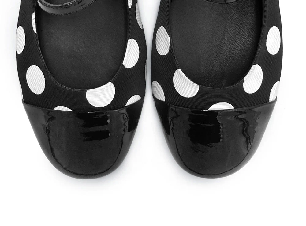 Le Condotti sono ballerine Mary Jane dallo stile bon ton e raffinato, caratterizzate da un cinturino in vernice nera che avvolge con delicatezza il collo del piede e da una punta tonda anch’essa in vernice nera, in elegante contrasto con la tomaia in tessuto bianco a pois neri. Un modello ricercato e al tempo stesso versatile, perfetto per aggiungere un tocco rétro e femminile a ogni look. La fodera in pelle e il morbido sottopiede in pelle assicurano comfort prolungato sia con che senza calze, mentre la suola in gomma nera garantisce leggerezza e flessibilità a ogni passo. Perfette per cerimonie e occasioni speciali, si adattano con naturalezza anche a contesti più quotidiani, come l’ufficio o un brunch informale. Indossale con un abito in seta a stampa floreale per un look romantico, oppure scegli un tubino nero per un effetto sobrio ma chic. Per un tocco più vivace e contemporaneo, abbinale a un completo in maglia nei toni dell’arancio o a un abito chemisier turchese per giocare con contrasti grafici e colori pop. Le ballerine Condotti sono la scelta ideale per chi desidera uno stile curato, delicato e pieno di personalità.