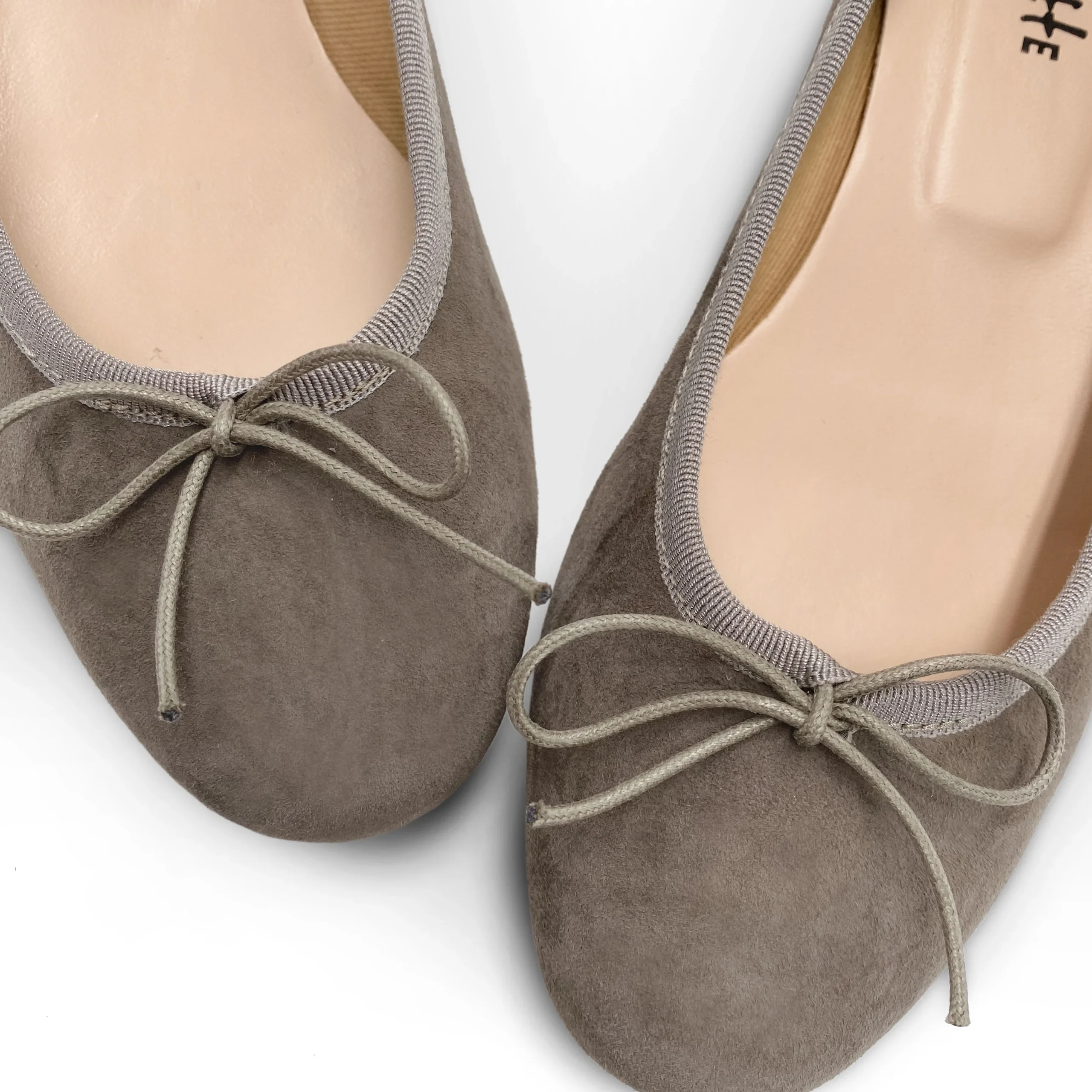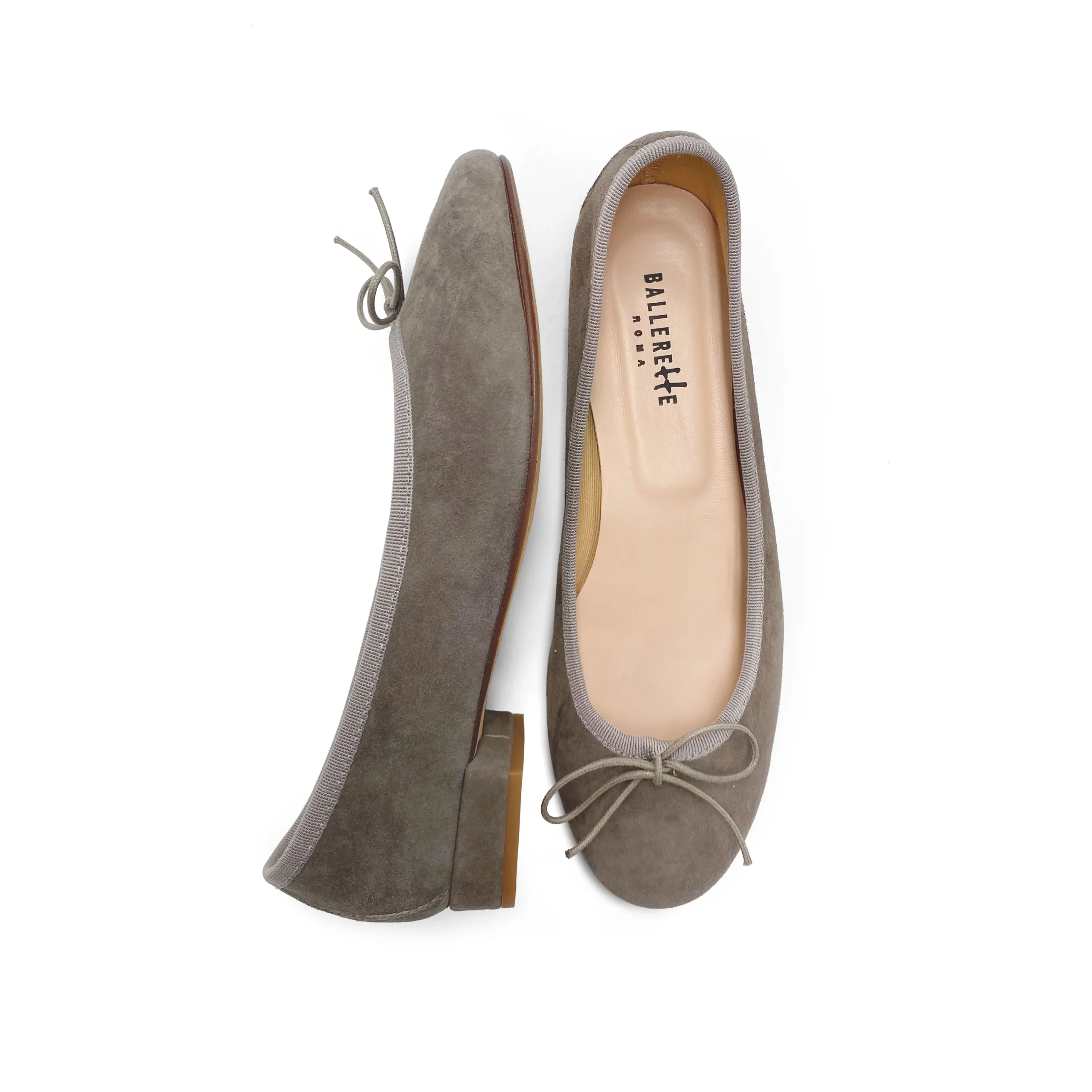 Versione con tacco delle classiche flats amate dalle donne di tutto il mondo le ballerine Ripa hanno punta arrotondata e tacco di 2 cm di altezza rivestito in camoscio. La pelle scamosciata le rende morbide e comode ma allo stesso tempo mantengono bene la forma grazie alla fodera in cotone e il laccetto regolabile in cotone cerato. Questo modello è in colore taupe, un mix chic tra marrone e grigio, che le rende estremamente versatili. Tutta la scarpa è bordata in gros grain e il sottopiede è in pelle dai colori neutri. La tonalità classica rende le ballerine scamosciate taupe un modello indispensabile da avere nel proprio armadio in quanto abbinabili facilmente a qualsiasi outfit e colorazione. Da provare assolutamente il connubio con il bianco o il rosso per un look raffinato oppure con una stampa geometrica o floreale per le più ecclettiche.