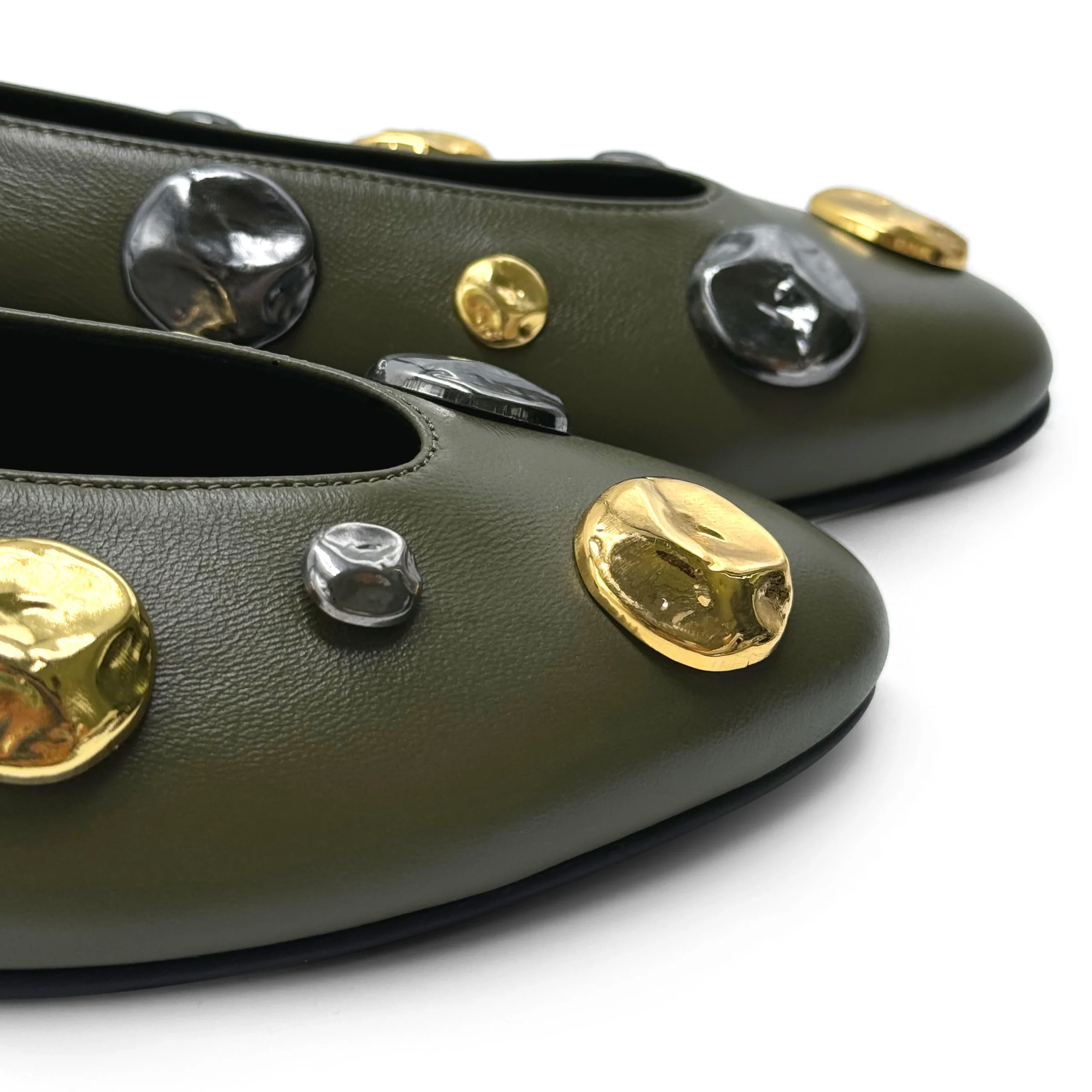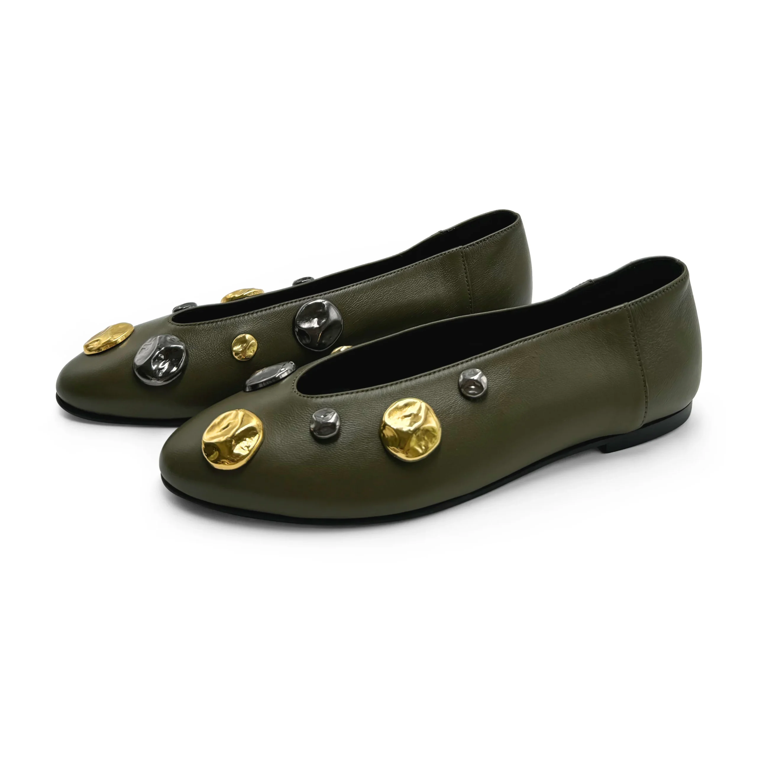 Le Torlonia sono scarpe basse accollate con una linea moderna e minimal. Queste particolari ballerine hanno la punta a mandorla e sono realizzate in morbida pelle di colore verde oliva. La fodera interna è in pelle nera così come il sottopiede, la suola ha tacco basso di 0,5 cm. Questa versione è adornata da mezze perle gioiello martellate di colore ferro e oro in diverse grandezze che creano un elegante contrasto. Comode ed eleganti provale con una gonna a sigaretta cipria e dolcevita bosco o con un mini abito grigio perla.