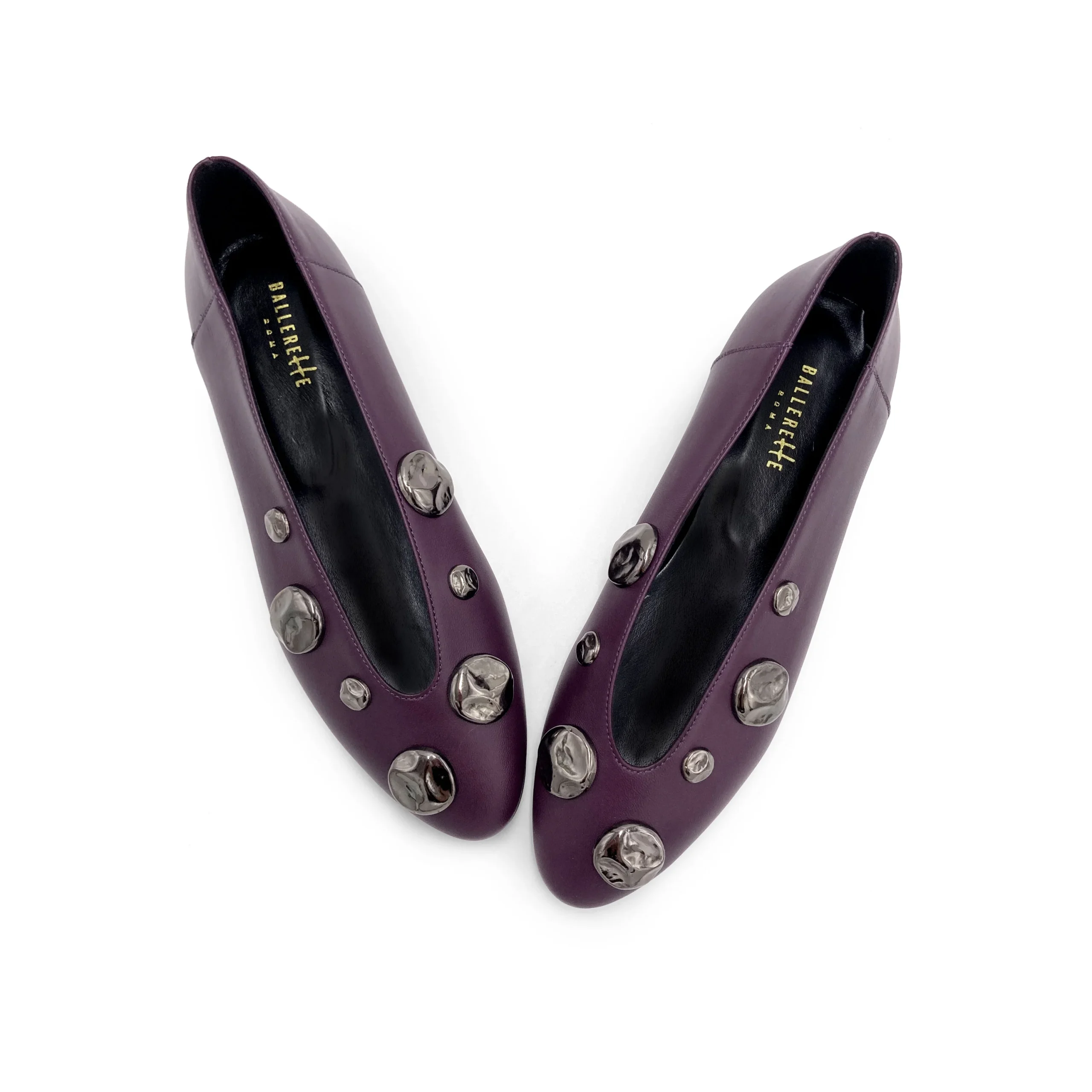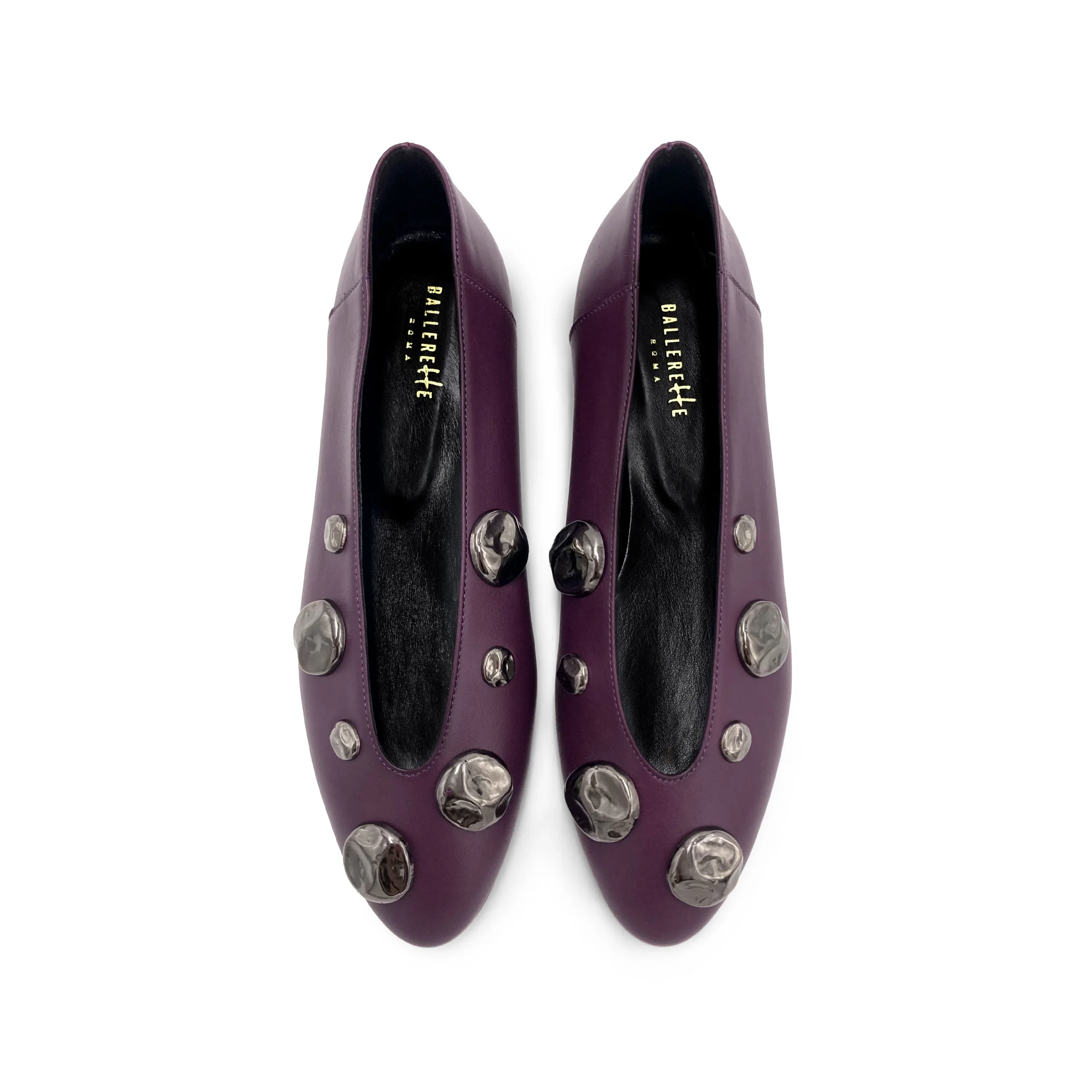Le ballerine gioiello Torlonia sono un modello che coniuga eleganza decisa e spirito contemporaneo. La silhouette affusolata è esaltata dalla caratteristica scollatura a V alta, che slancia il piede e dona alla scarpa una presenza raffinata e femminile. La tomaia in morbida pelle viola, intensa e sofisticata, è impreziosita da borchie tonde in finitura ferro di diverse dimensioni, disposte in modo armonioso sulla parte anteriore della scarpa: un dettaglio decorativo che sostituisce il classico ornamento gioiello con un tocco moderno e grintoso. La fodera in pelle nera e il sottopiede coordinato garantiscono comfort e struttura, rendendo queste ballerine perfette per accompagnarti con stile in ogni momento della giornata. Le ballerine Torlonia in pelle viola con borchie sono pensate per chi desidera un accessorio distintivo e versatile, capace di trasformare anche il look più semplice. Indossale di giorno con un completo in maglia sottile tono su tono, oppure con jeans cropped e camicia bianca per un contrasto deciso ma elegante. Per la sera, si abbinano splendidamente ad abiti midi in seta, gonne longuette in tulle o a completi sartoriali dal taglio femminile nei toni del grigio, del nero o del cipria. Sono ideali anche sotto un abito lungo dal design essenziale, per un tocco inaspettato ma chic. Le ballerine Torlonia rappresentano una nuova idea di scarpa gioiello: sofisticate, moderne e con personalità.