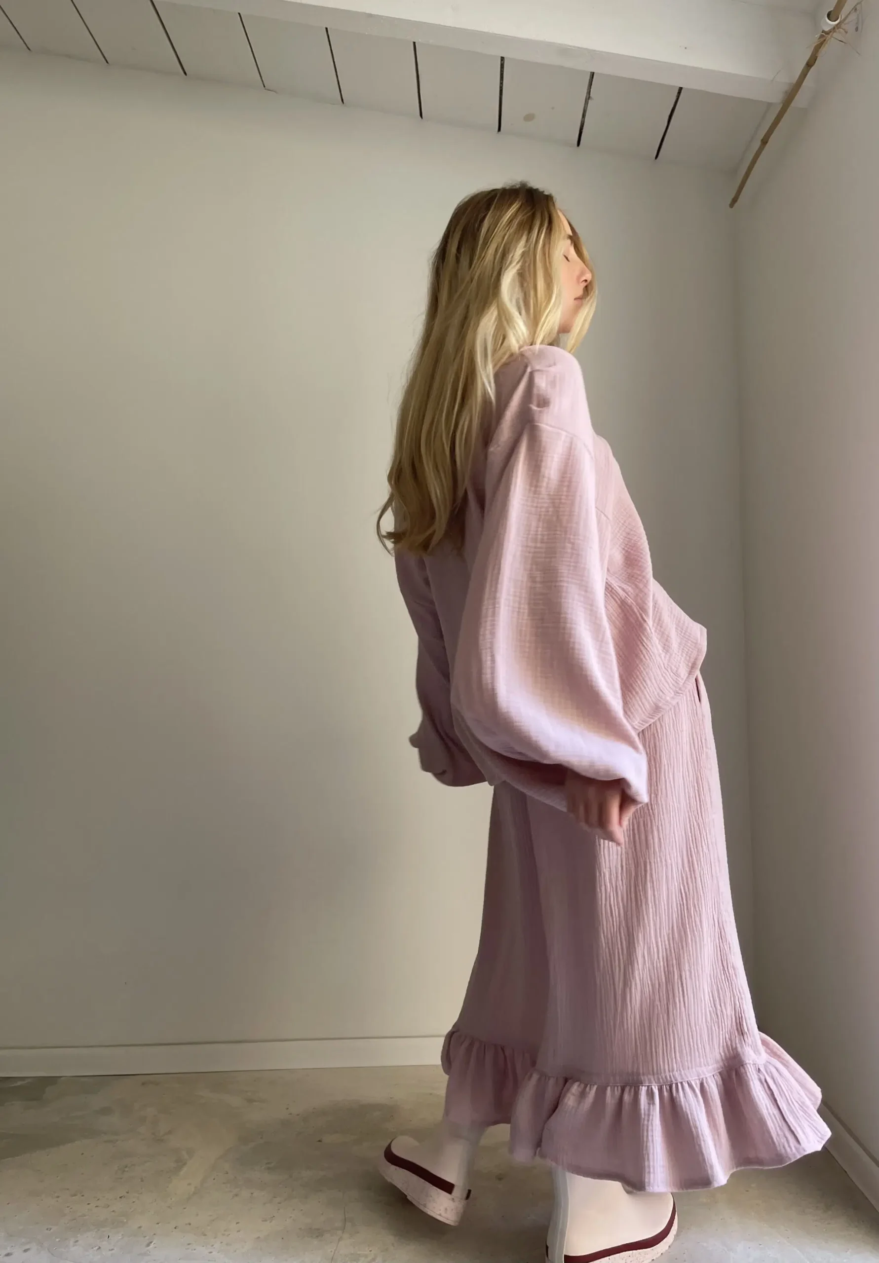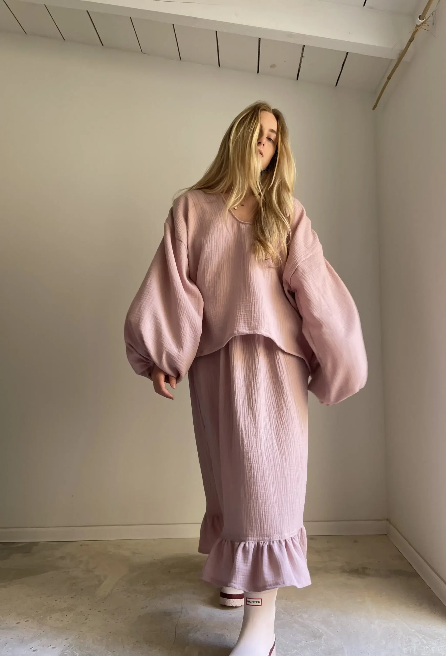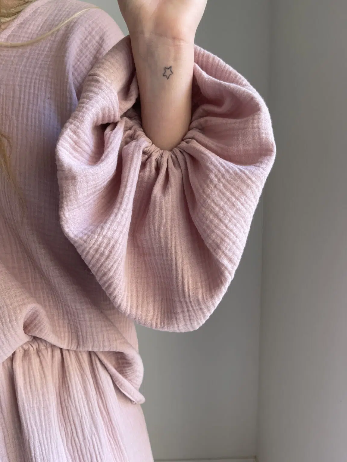 Blouse en gaze de coton rose poudré, manches ballons, poignets élastiqués, coupe minimaliste et loose pour une allure et un confort assurés. Une pièce intemporelle ! PIÈCE UNIQUE !