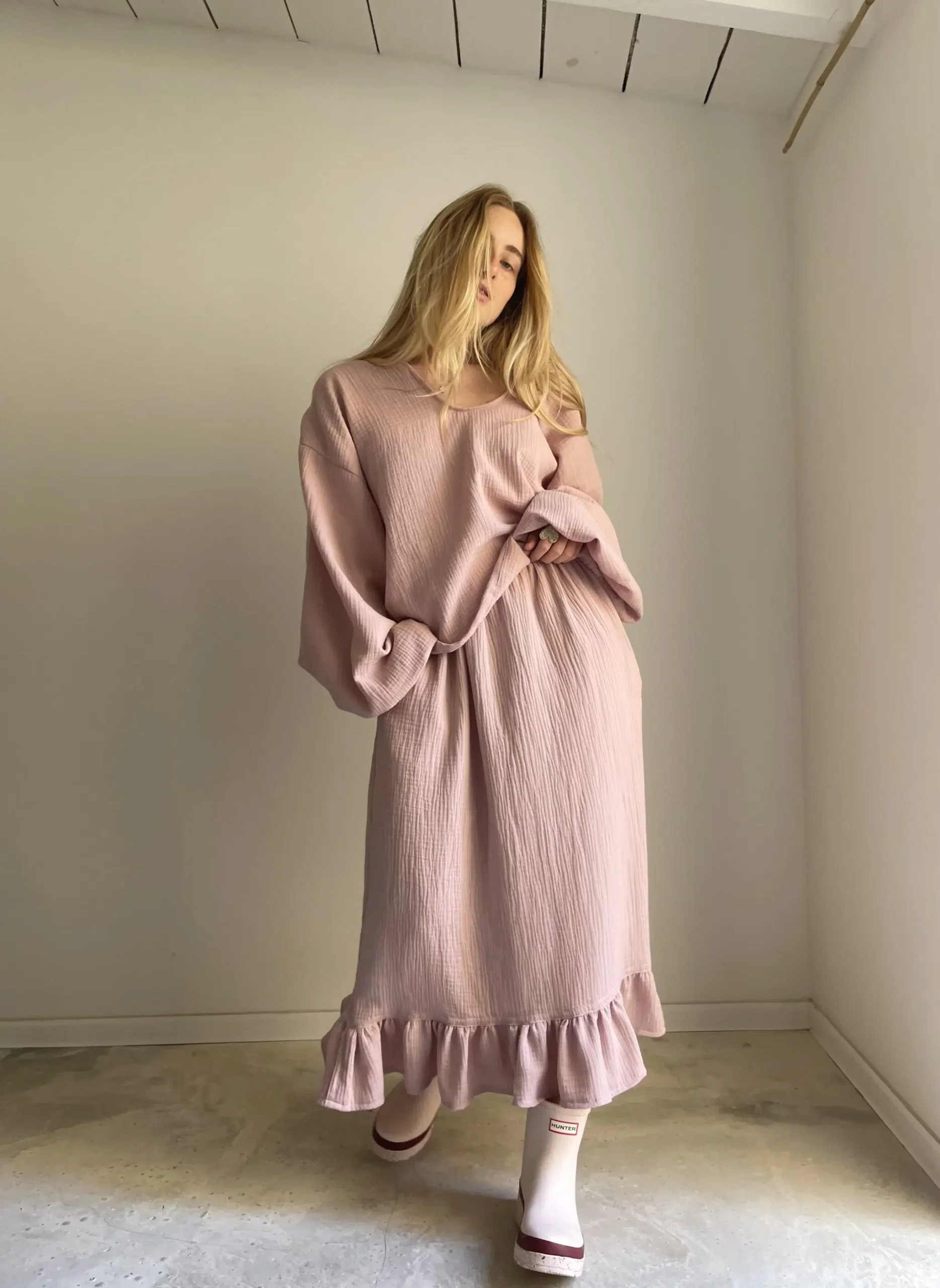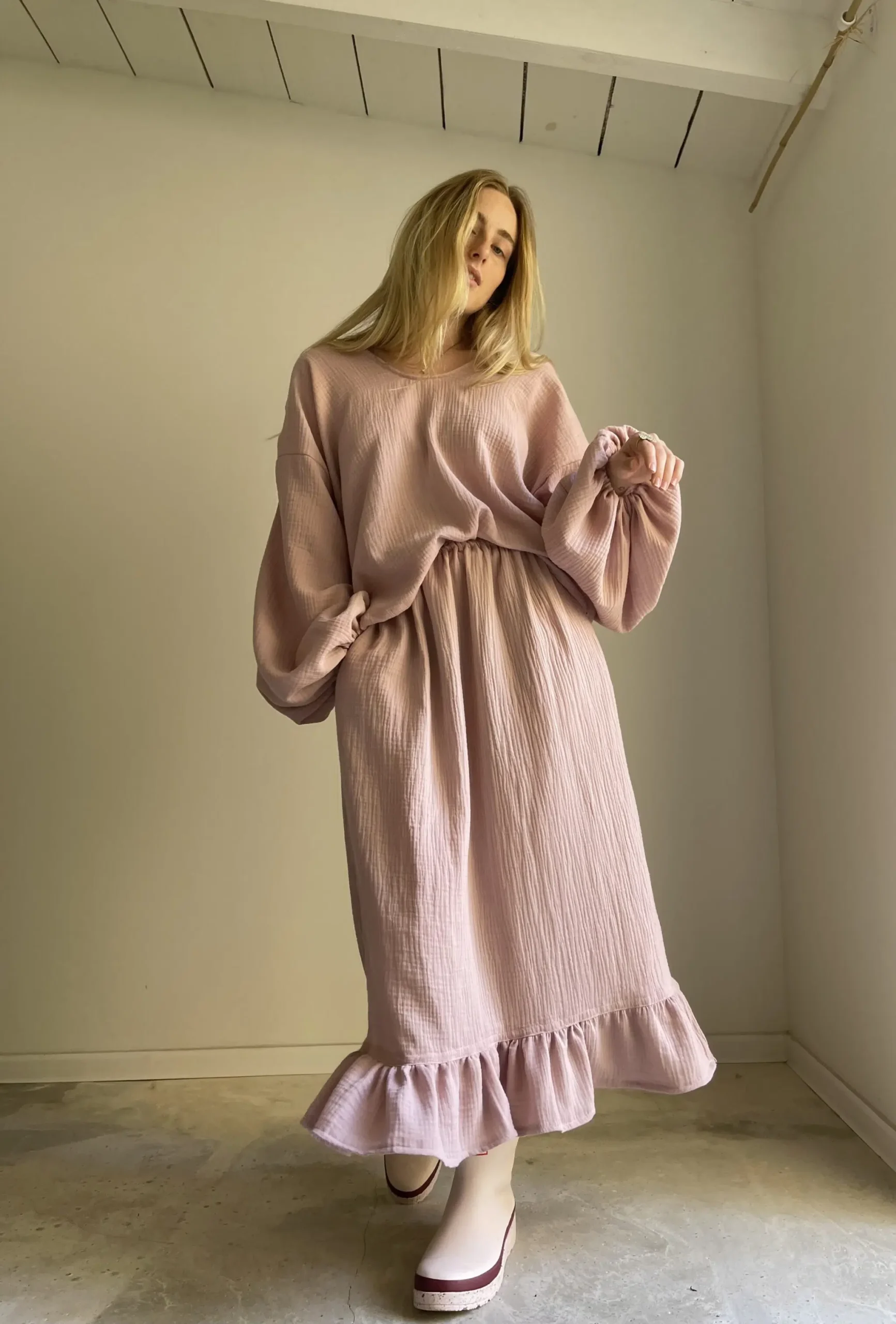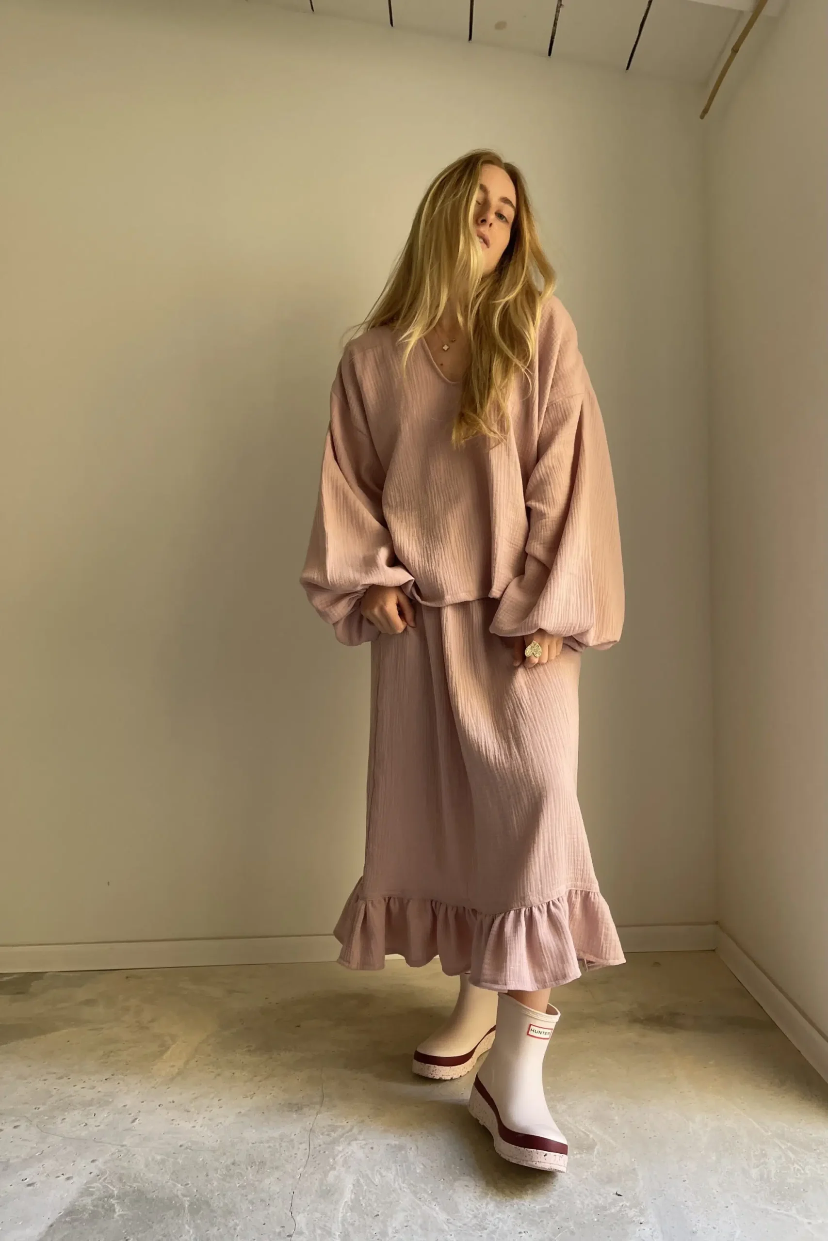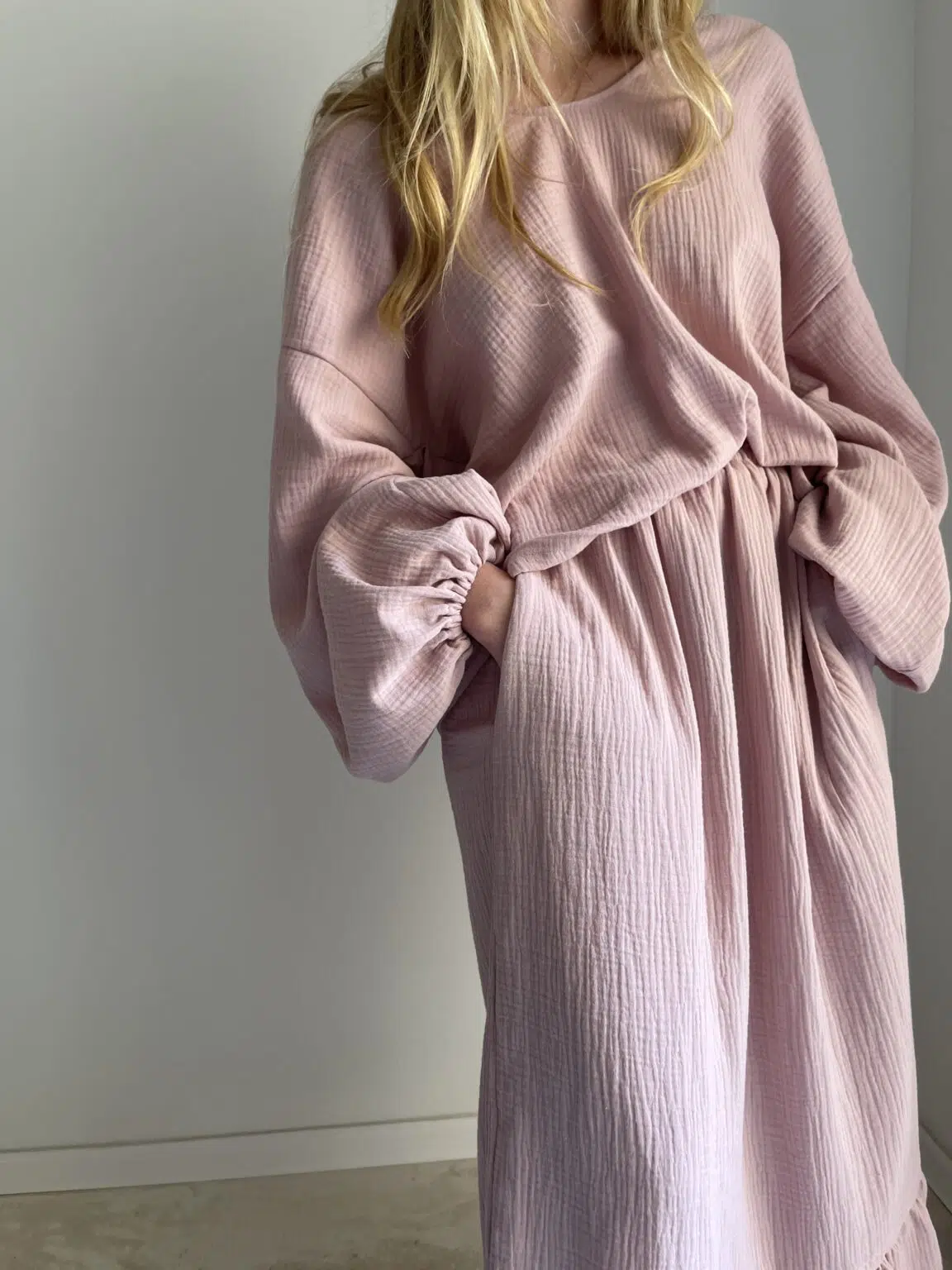 Blouse en gaze de coton rose poudré, manches ballons, poignets élastiqués, coupe minimaliste et loose pour une allure et un confort assurés. Une pièce intemporelle ! PIÈCE UNIQUE !