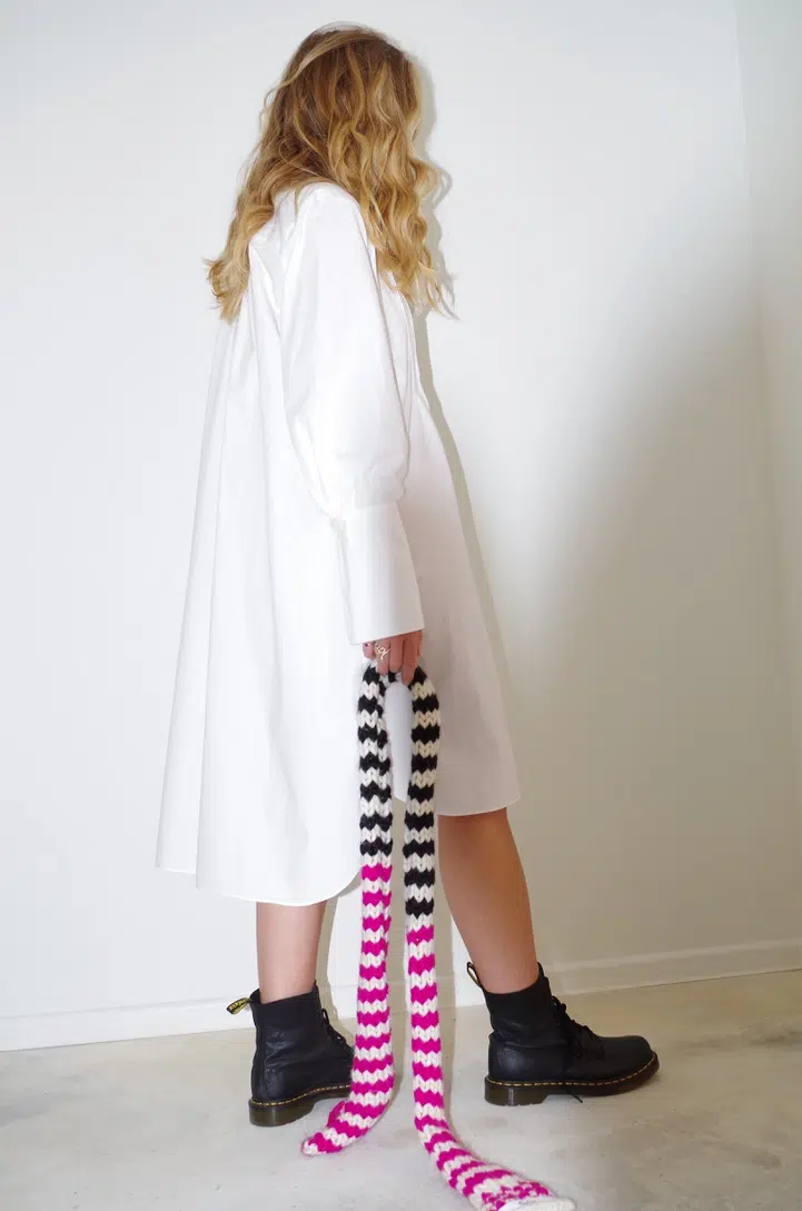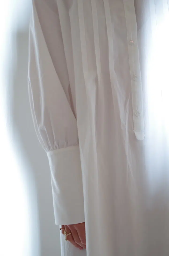 Blouse « oversize », longueur mollet, col Mao, plis couchés sur le devant, boutonnée, longs poignets doublés.