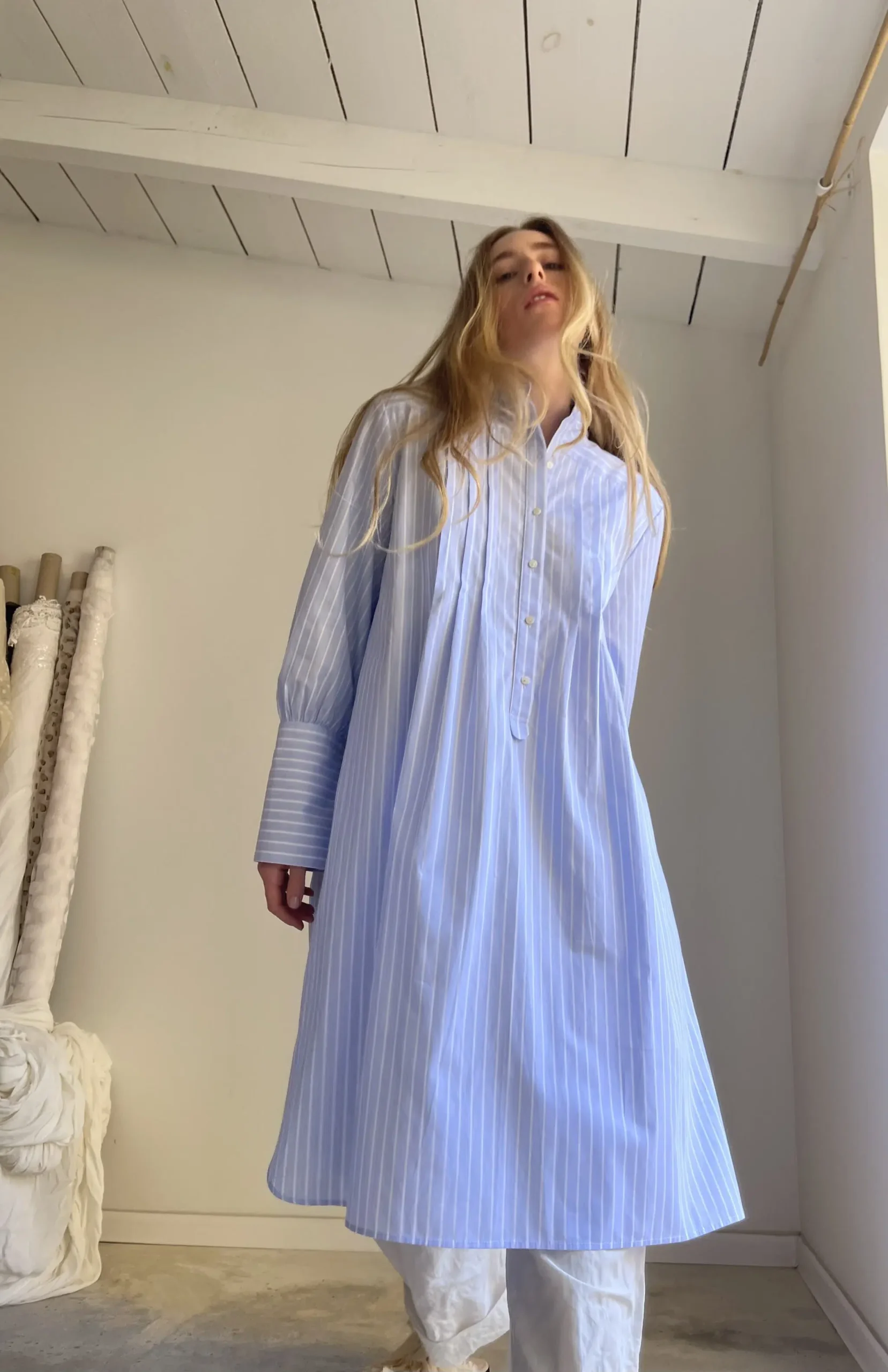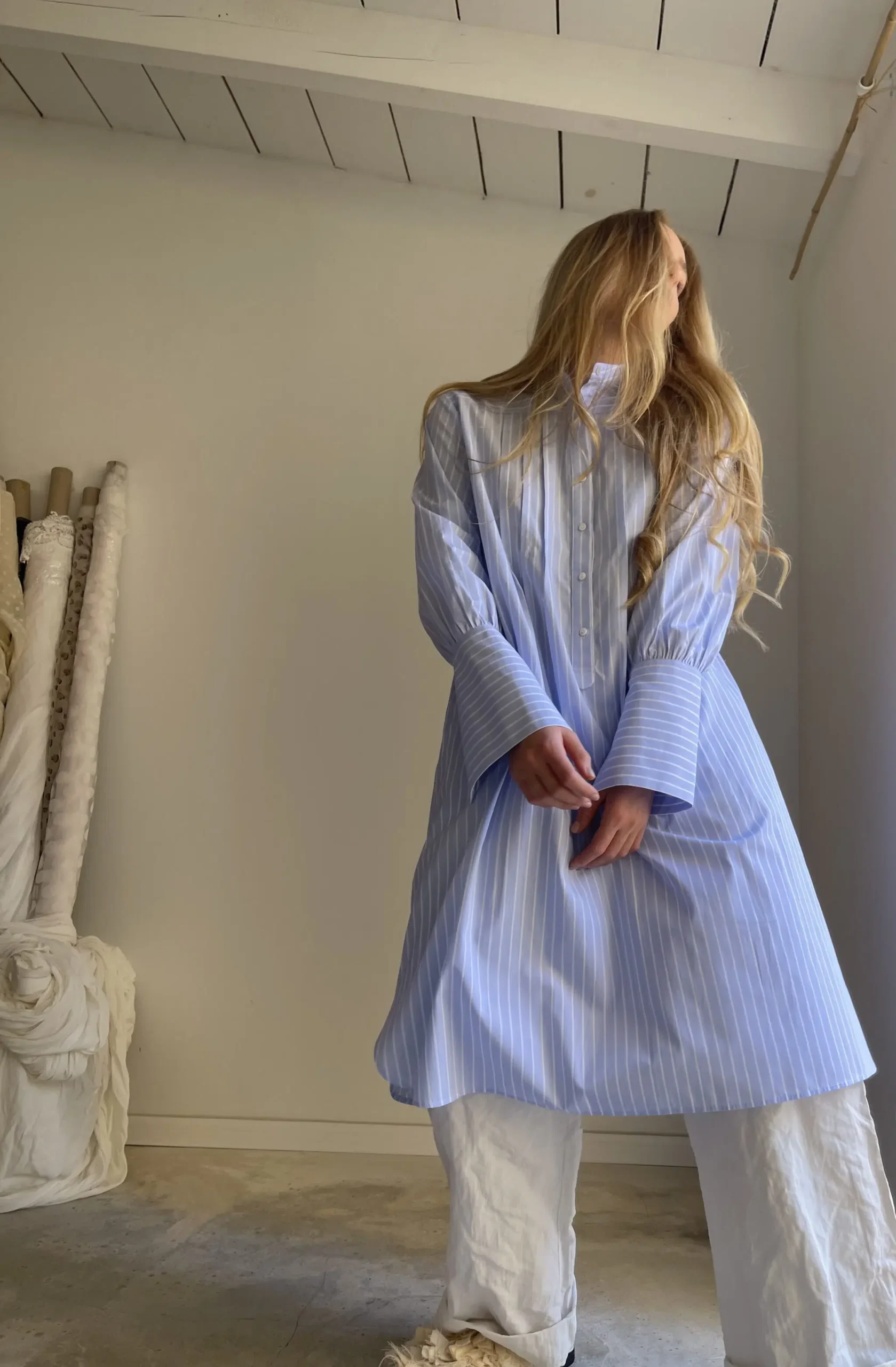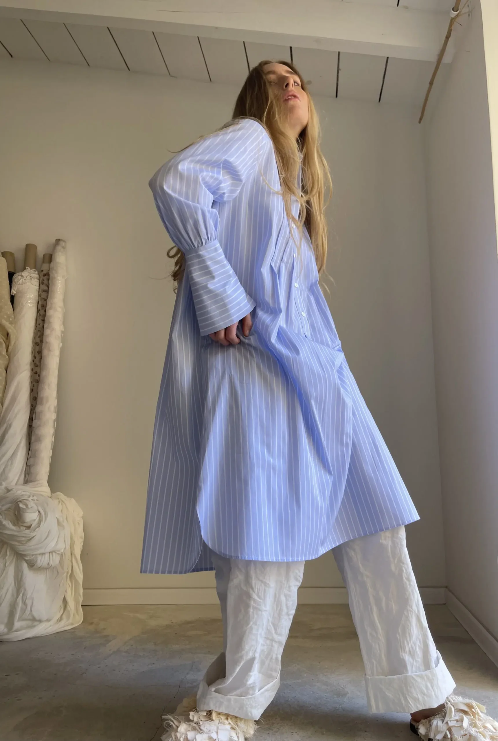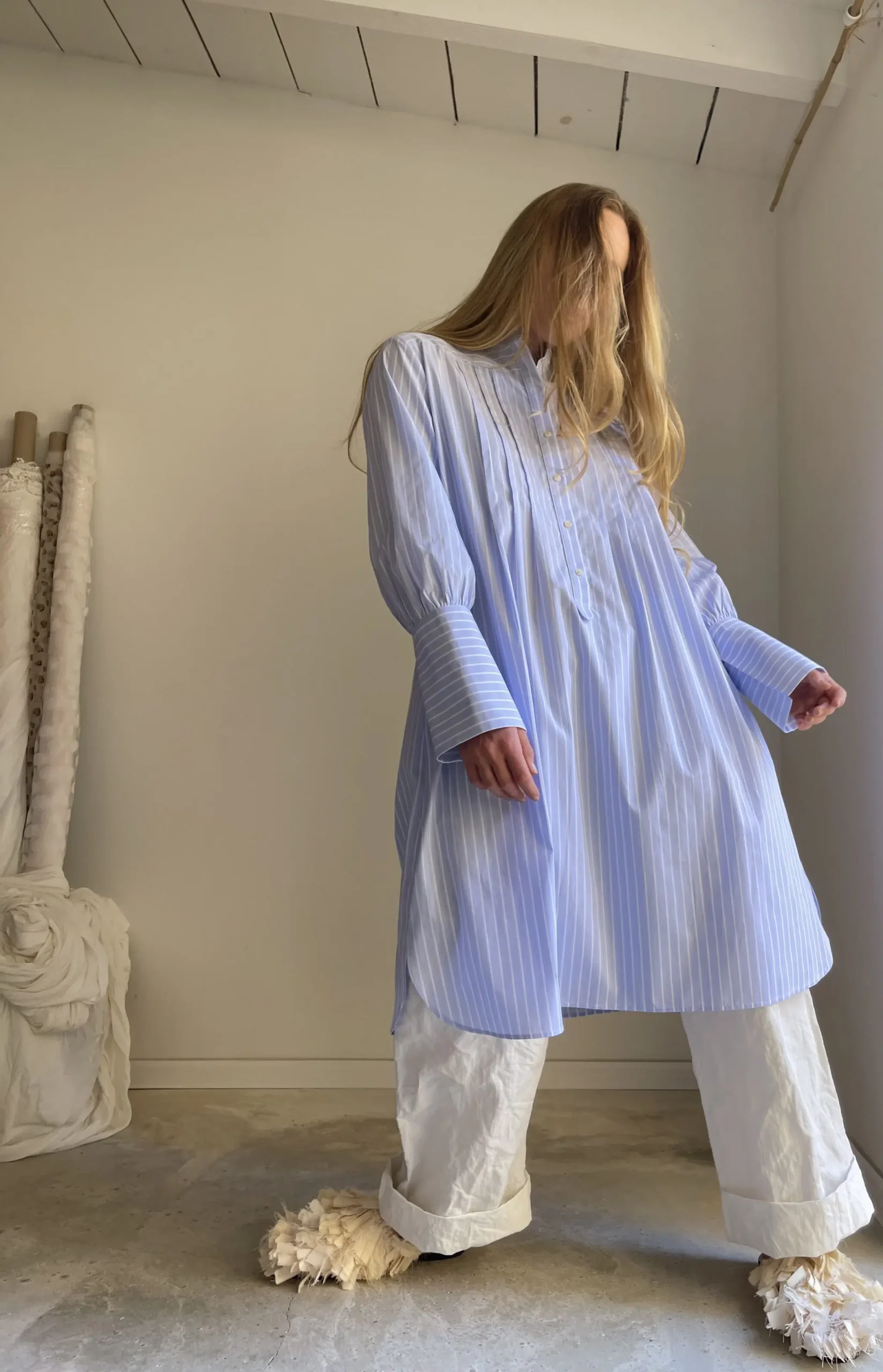 Blouse « LILY » dans un magnifique coton haute couture bleue ciel à rayures, plis plats, fronces, longs poignets boutonnés, poches, ouverture latérale et bas de blouse arrondie. La « blouse de peintre » selon maison djulia. Intemporelle, minimaliste & élégante ! PIÈCE UNIQUE