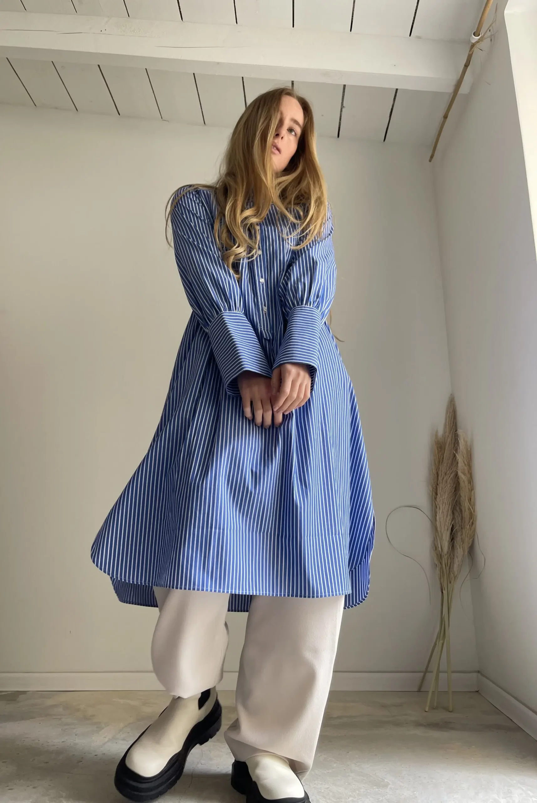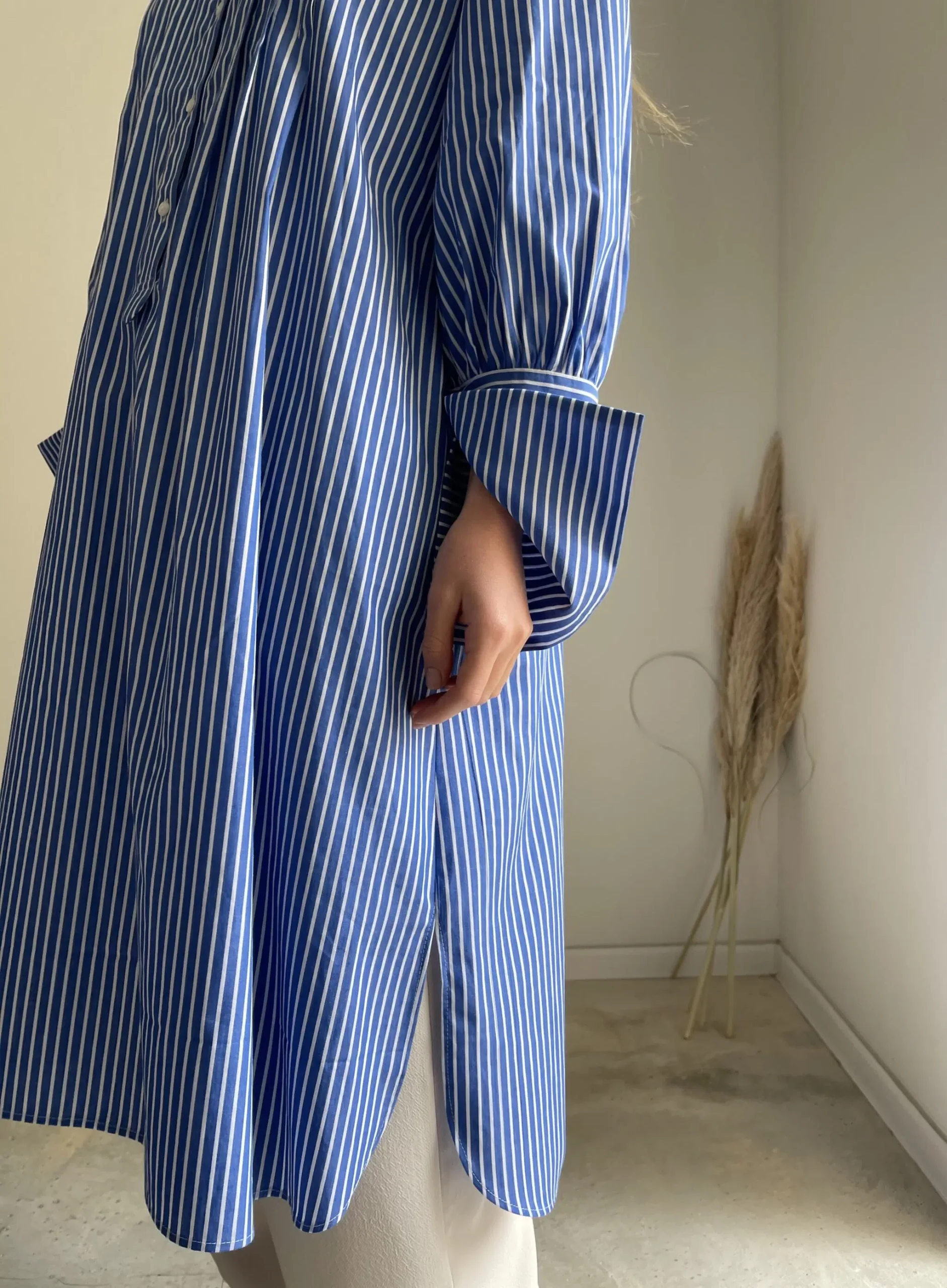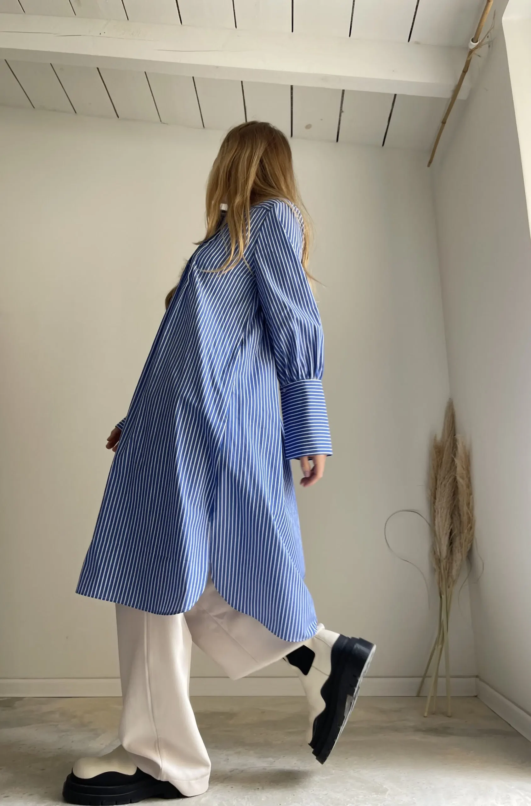 Blouse « LILY » dans une magnifique popeline de coton haute couture bleue à rayures, plis plats, fronces, longs poignets boutonnés, poches, ouverture latérale et bas de blouse arrondie. La « blouse de peintre » selon maison djulia. Intemporelle, minimaliste & élégante ! PIÈCE UNIQUE