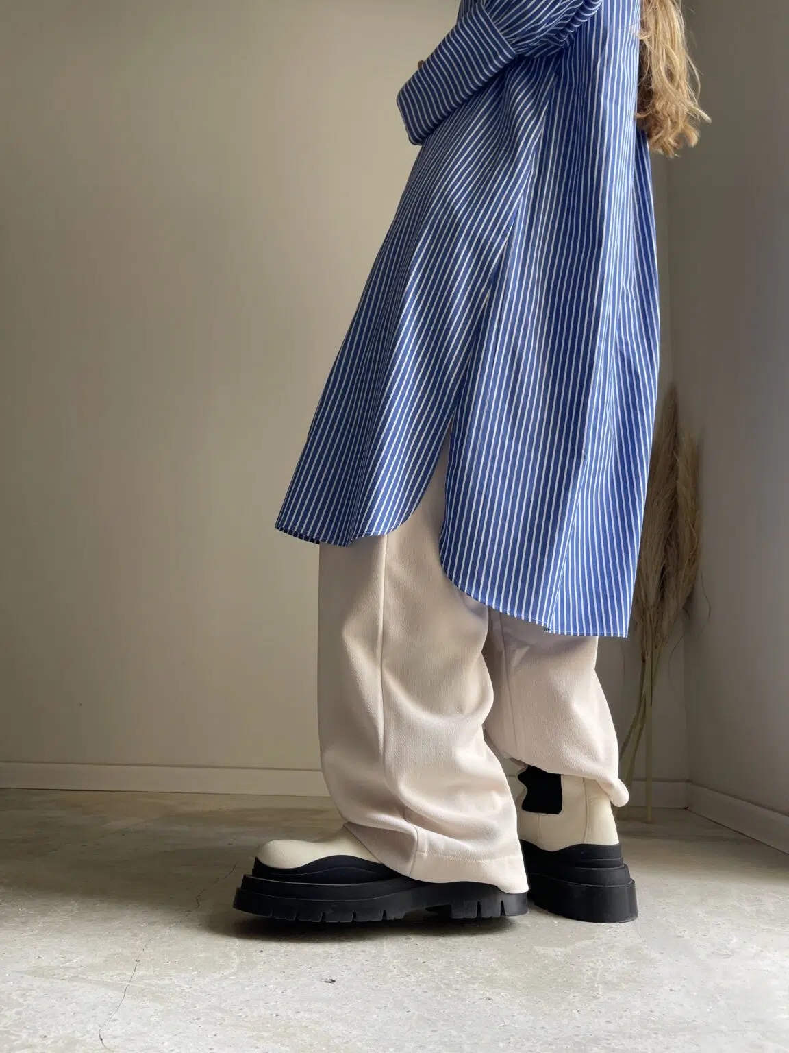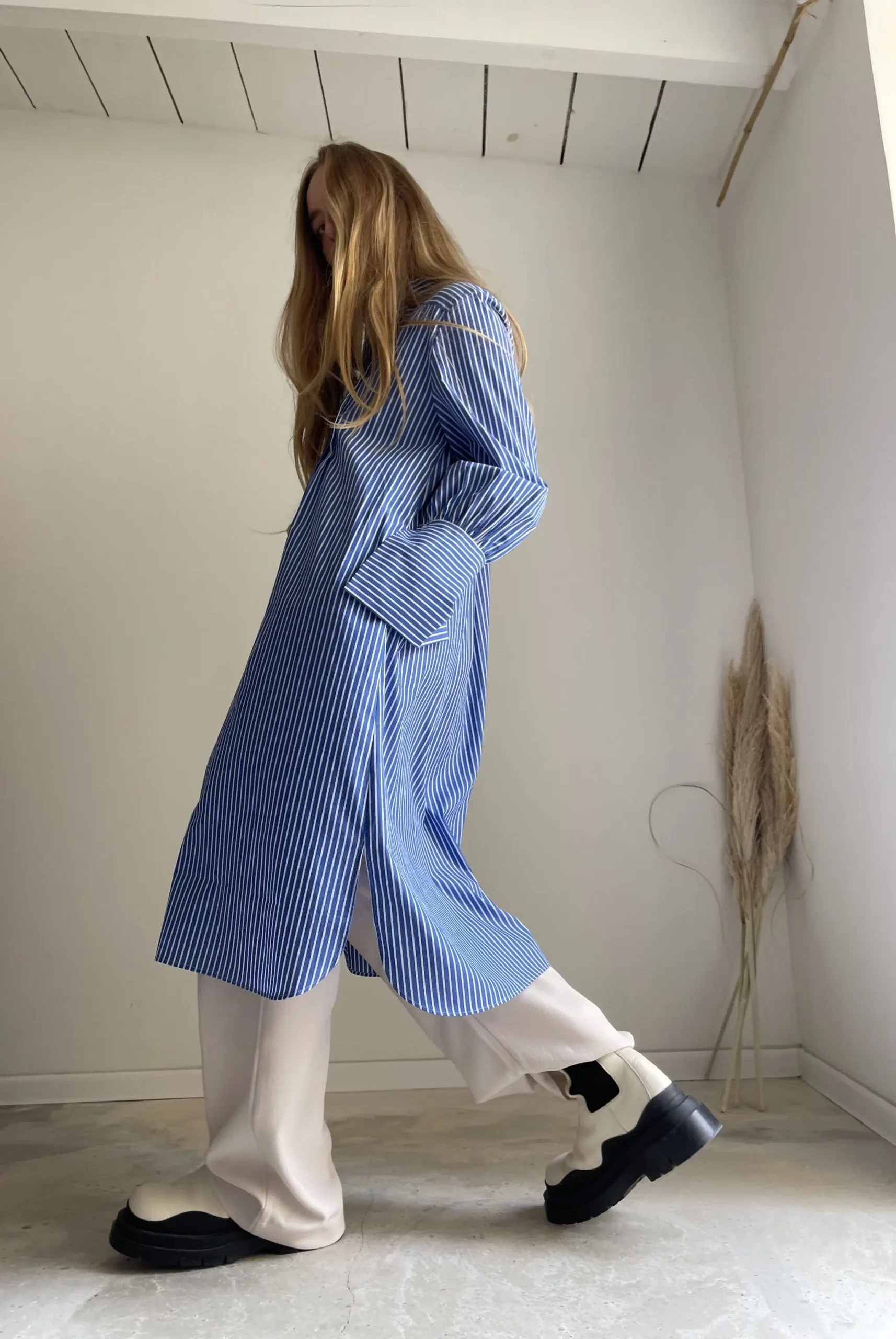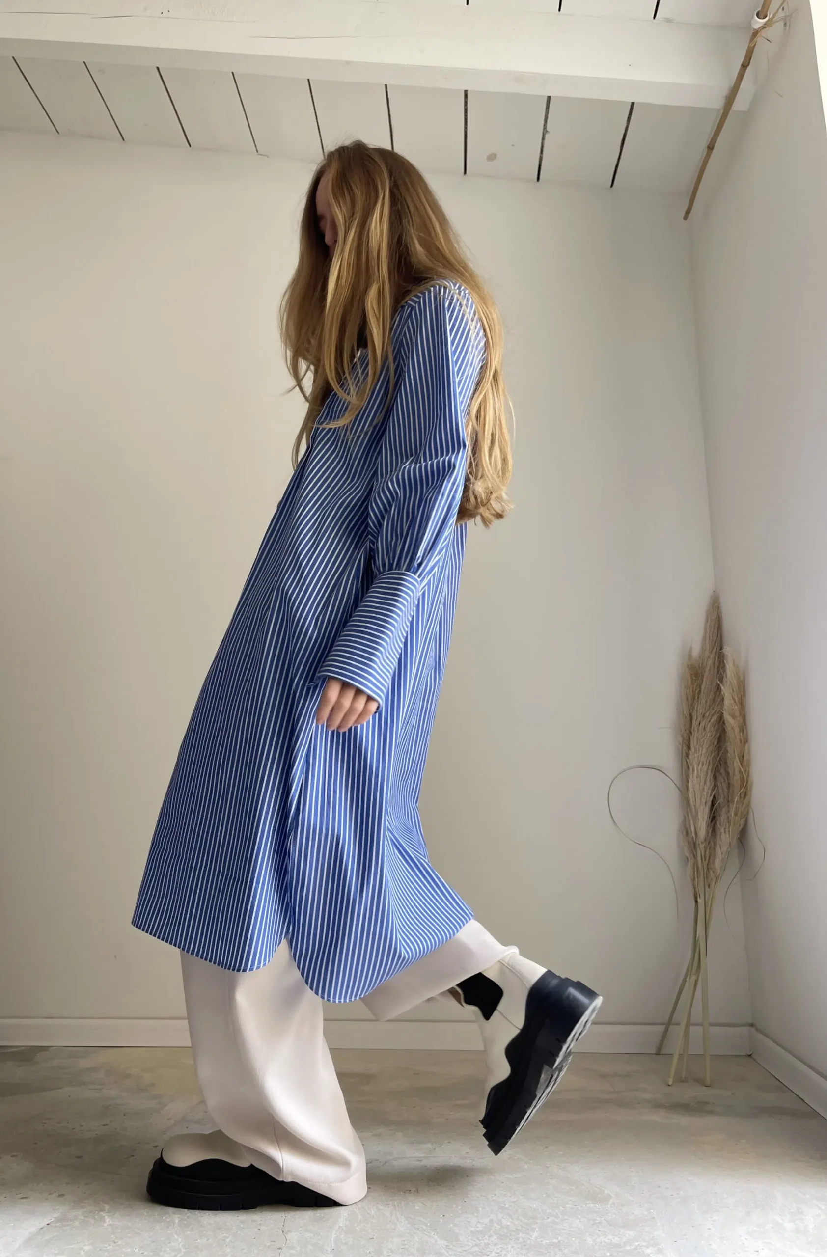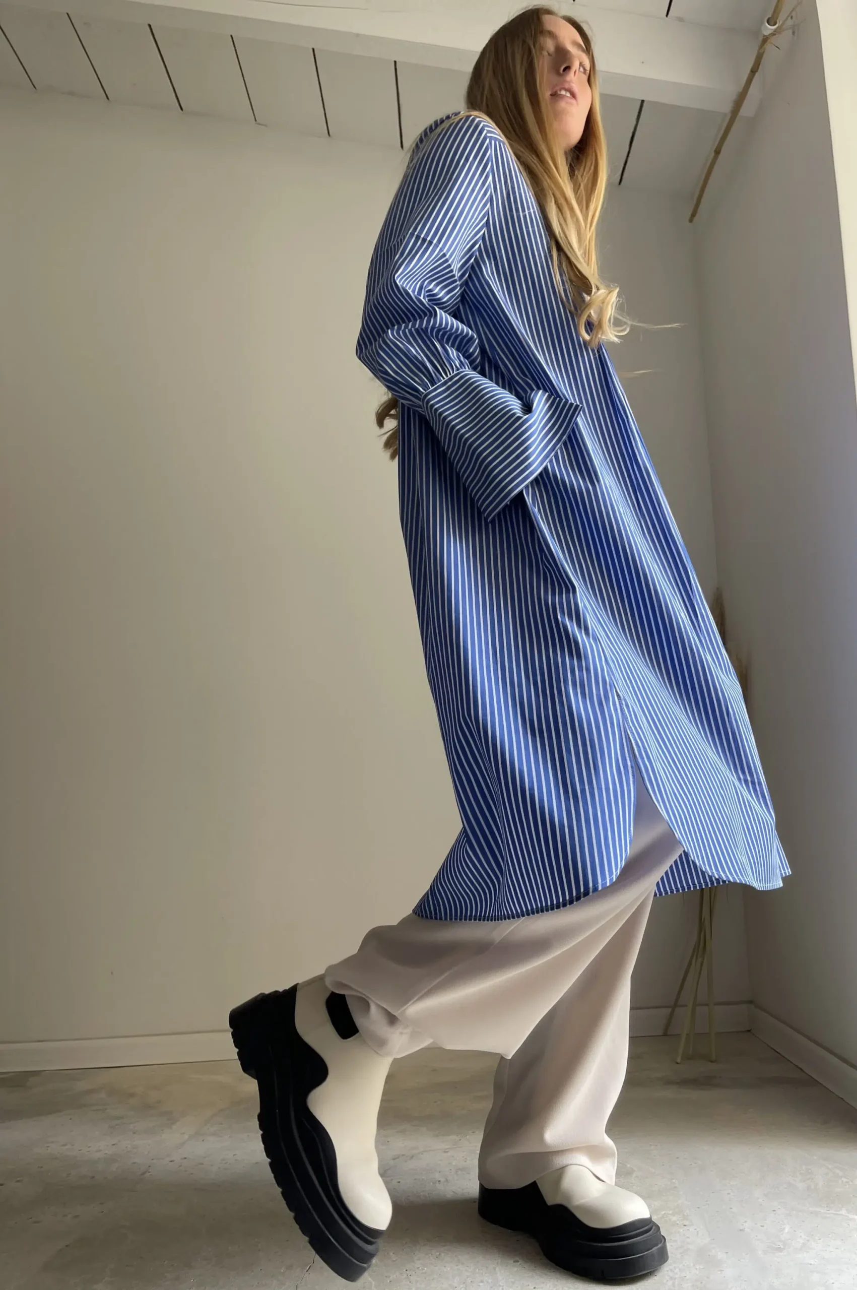 Blouse « LILY » dans une magnifique popeline de coton haute couture bleue à rayures, plis plats, fronces, longs poignets boutonnés, poches, ouverture latérale et bas de blouse arrondie. La « blouse de peintre » selon maison djulia. Intemporelle, minimaliste & élégante ! PIÈCE UNIQUE