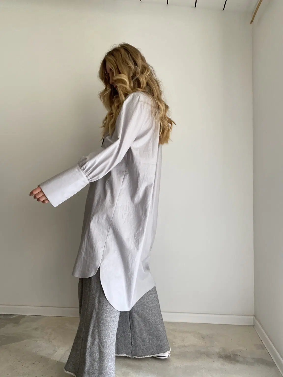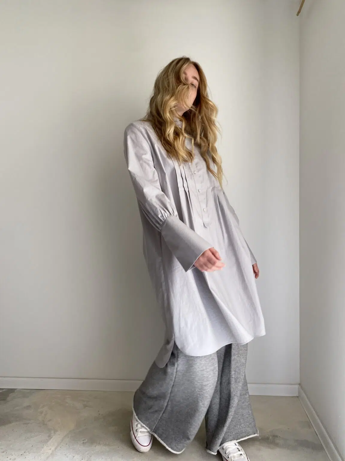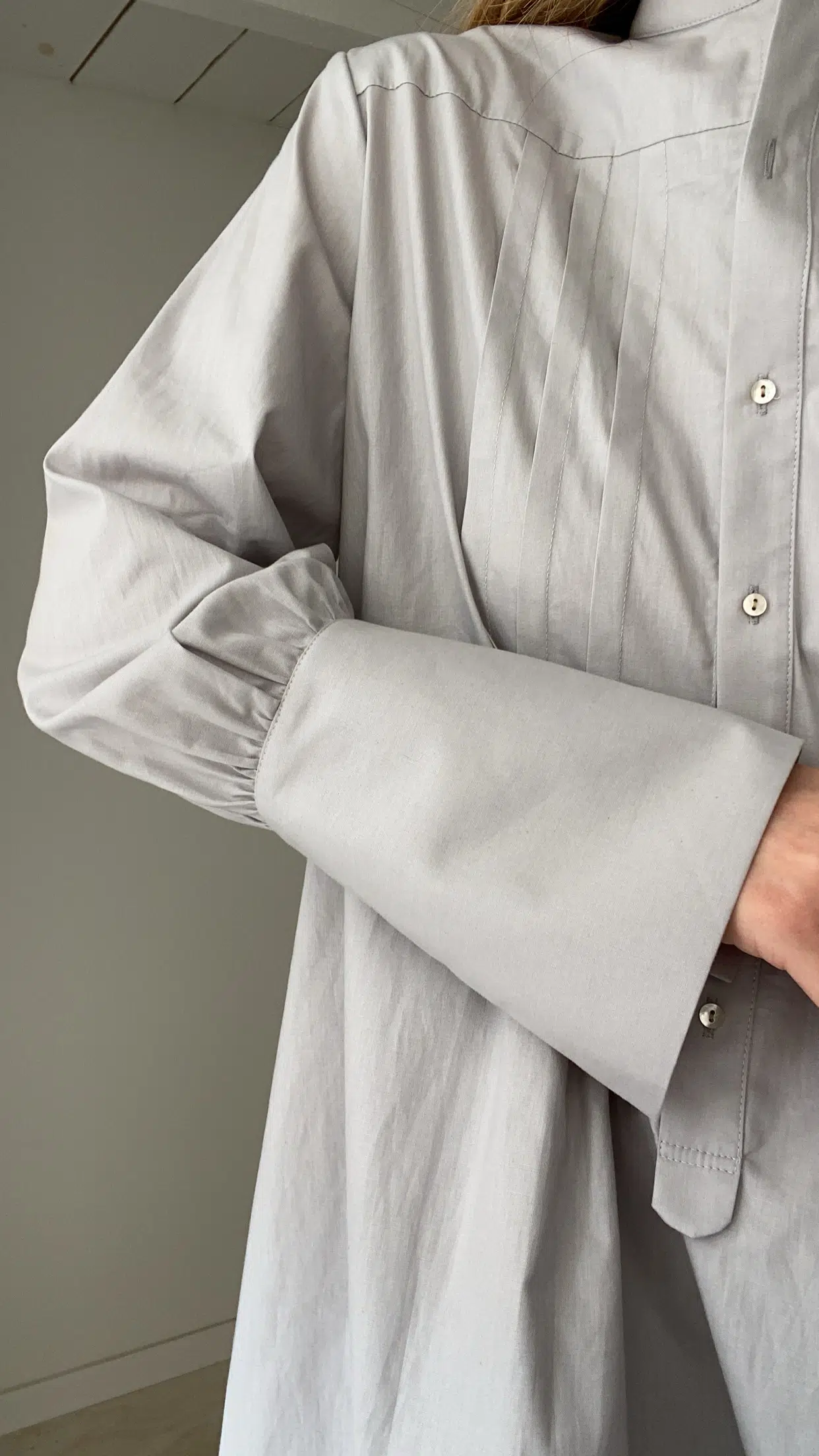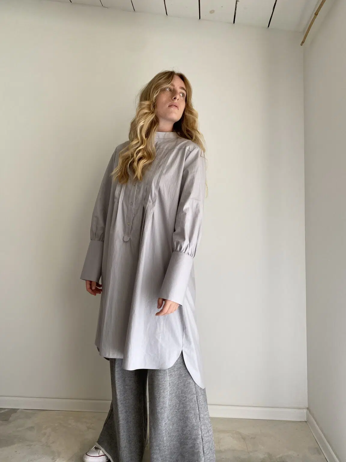 Blouse LILY en popeline de coton gris, col Mao, plis plats et boutonnée sur le devant, poignets longs, fendue sur les côtés. Style loose et décalé. Une pièce intemporelle ! Édition limitée