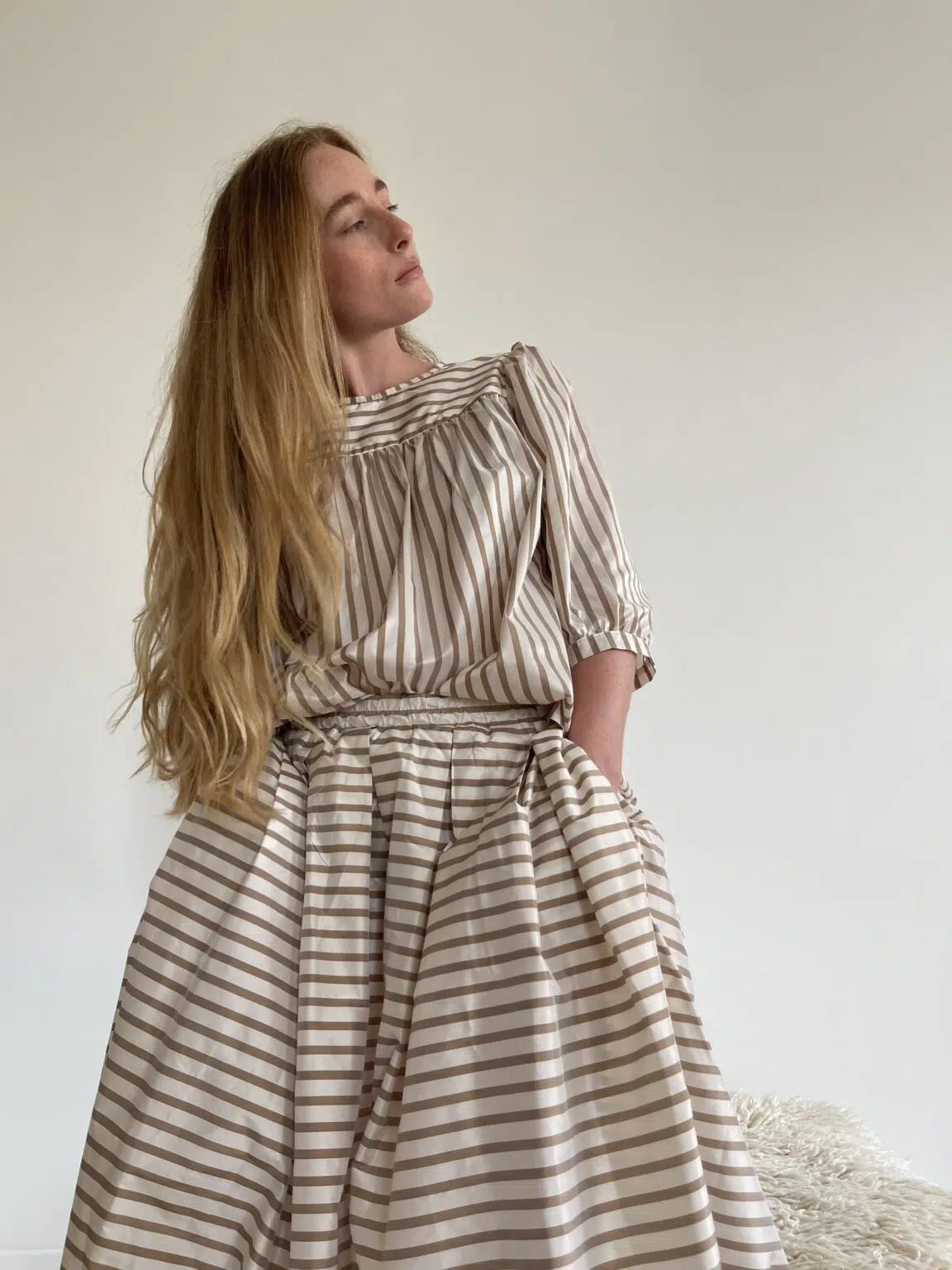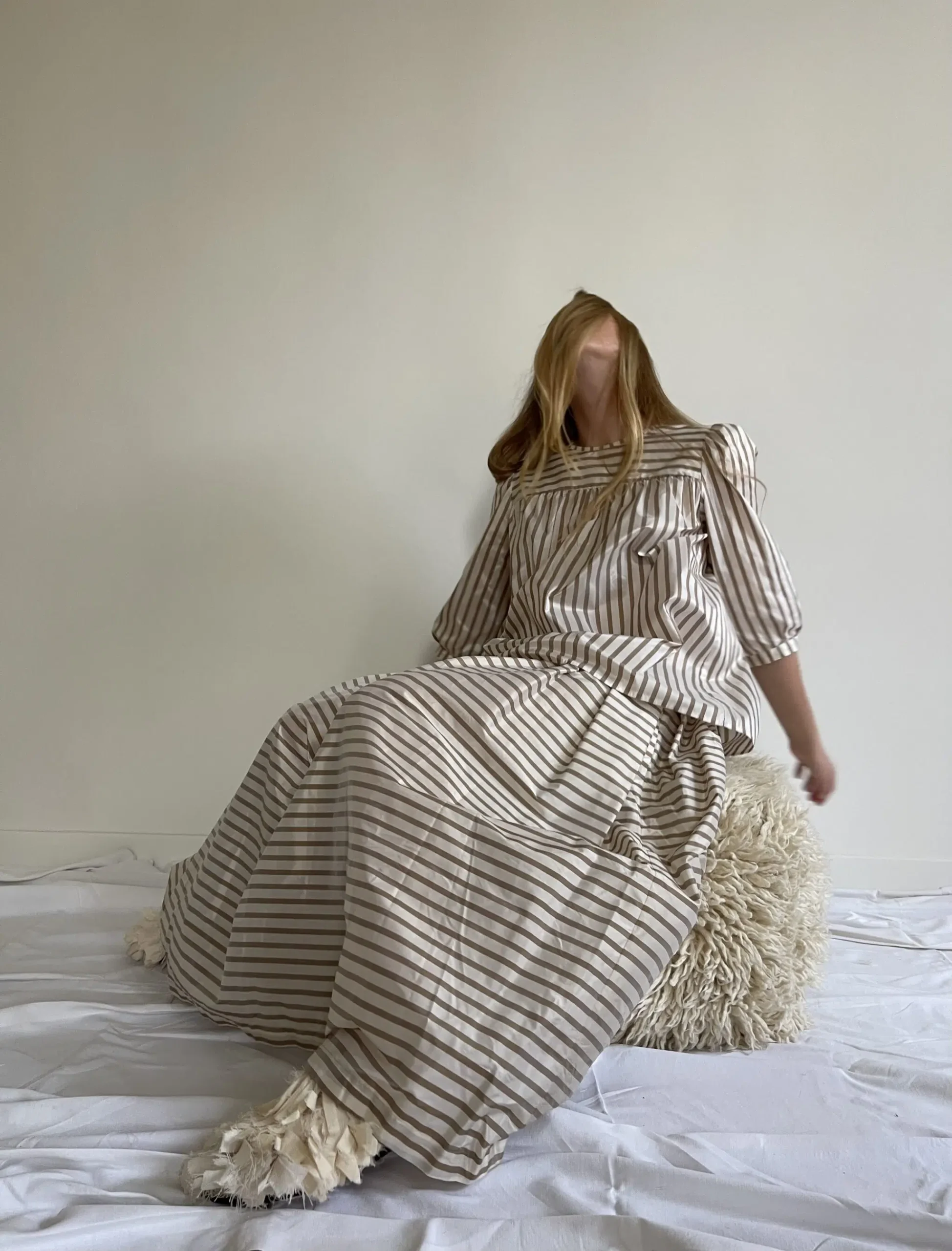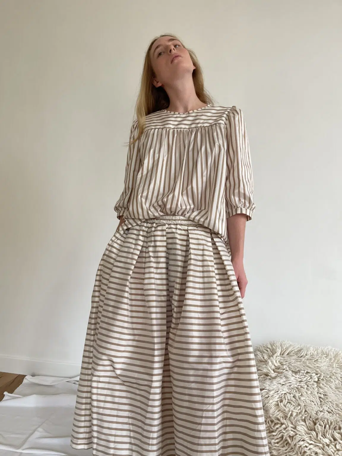 Blouse « LOUISETTE » dans un sublime taffetas à rayures écru et beige. Liens d’attache à la nuque. Petites fronces au dos et sur les épaules. Manches 3/4. Une coupe minimaliste pour une blouse élégante et stylée. PIÈCE UNIQUE
