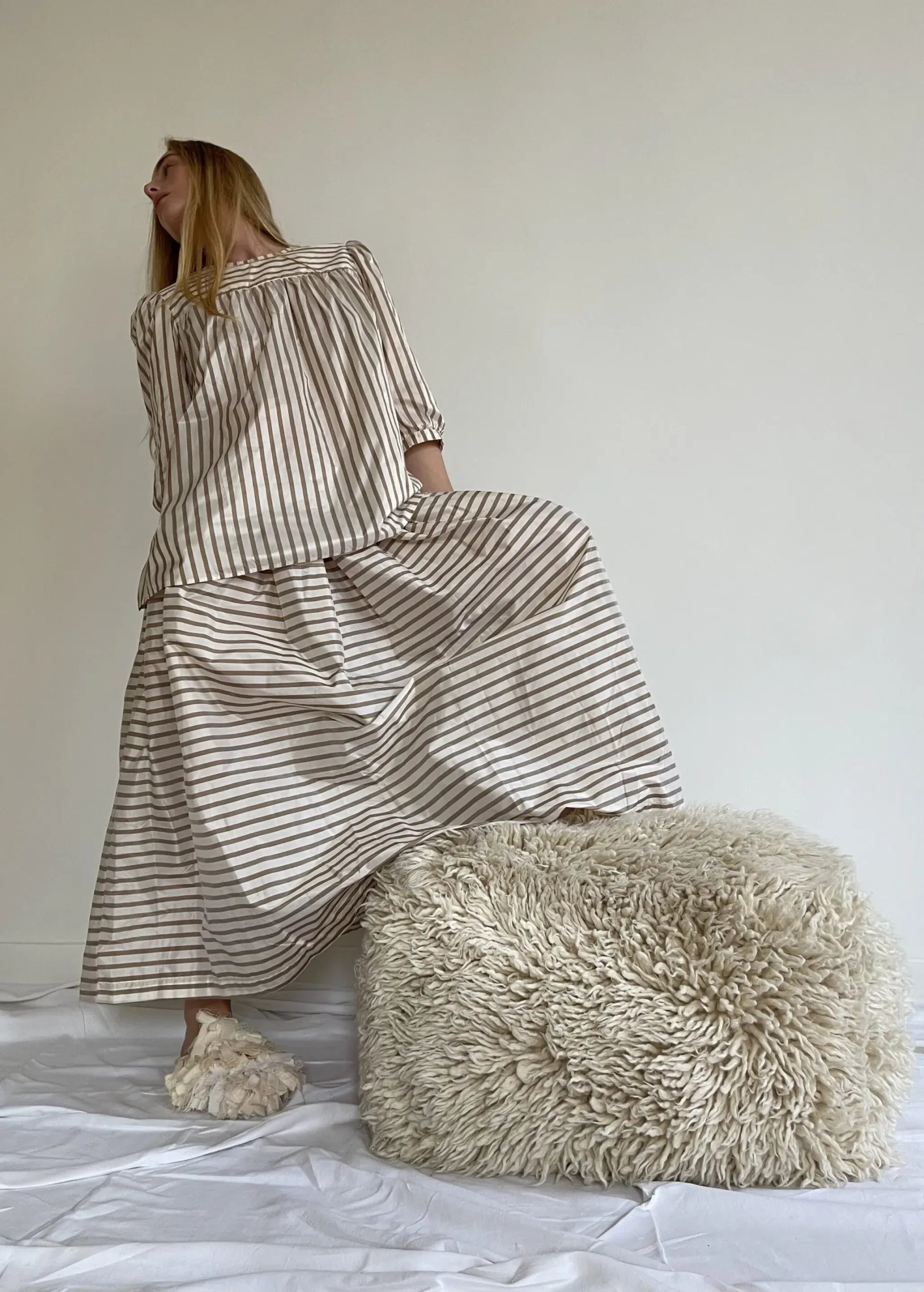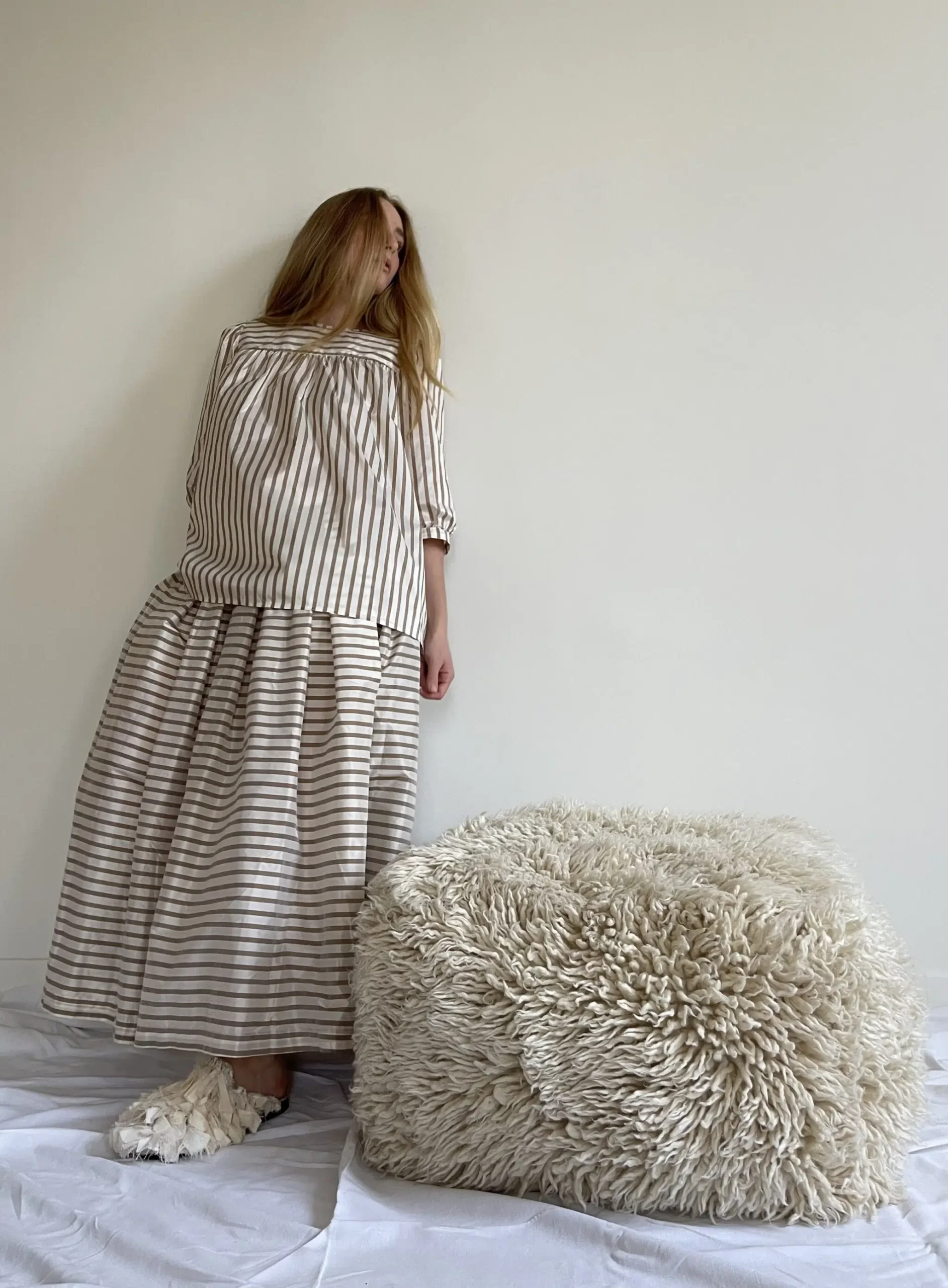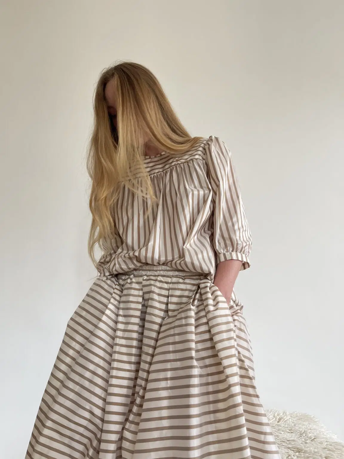 Blouse « LOUISETTE » dans un sublime taffetas à rayures écru et beige. Liens d’attache à la nuque. Petites fronces au dos et sur les épaules. Manches 3/4. Une coupe minimaliste pour une blouse élégante et stylée. PIÈCE UNIQUE