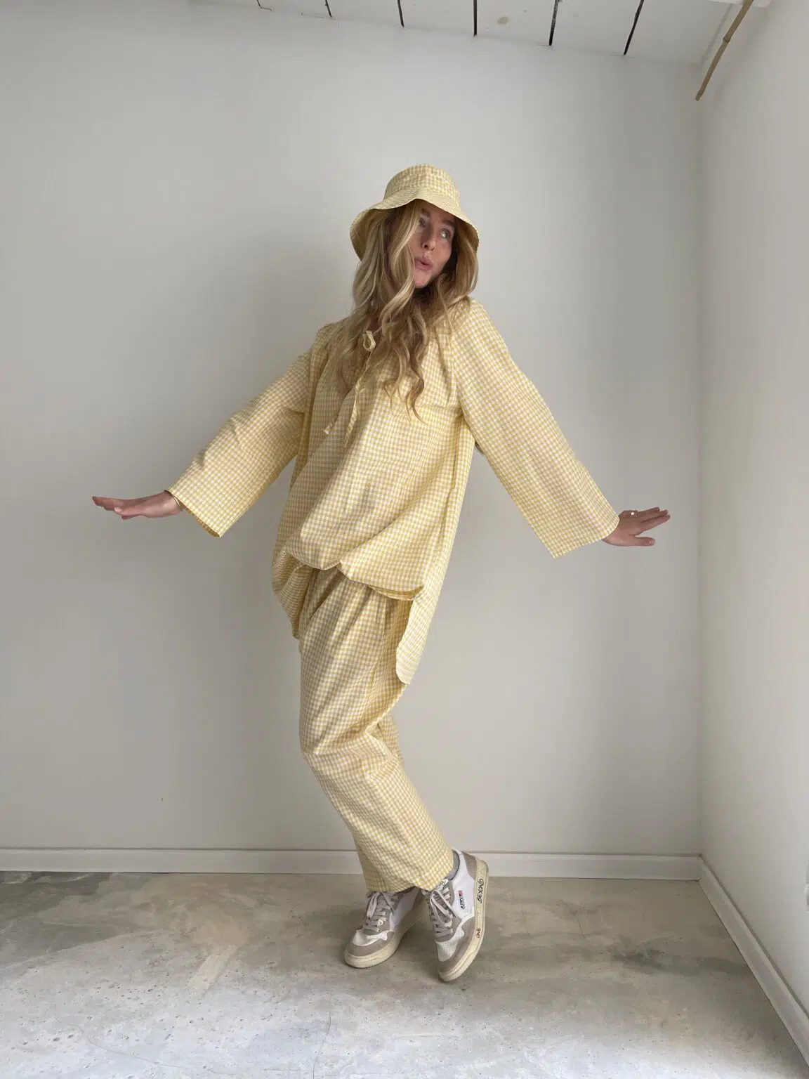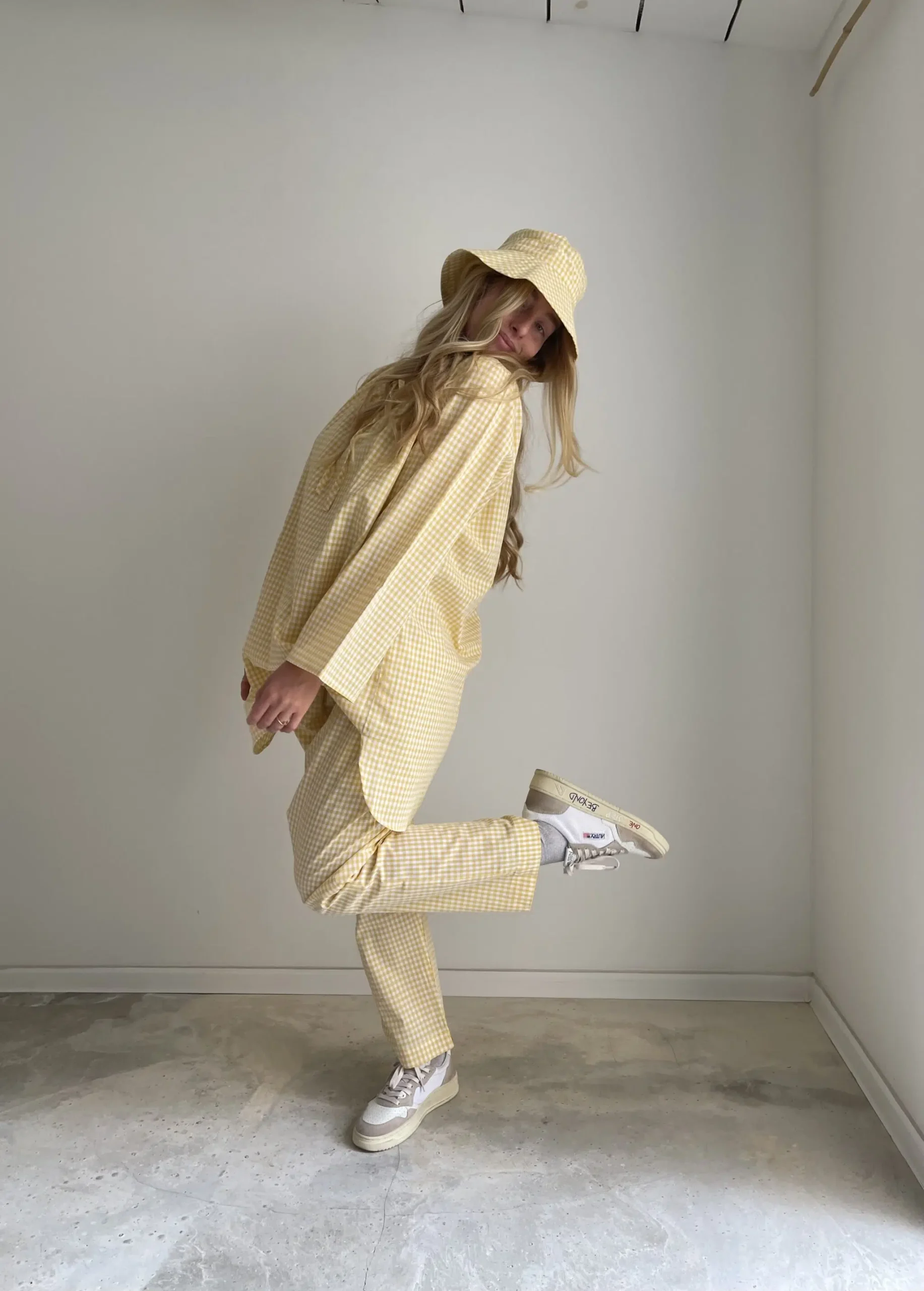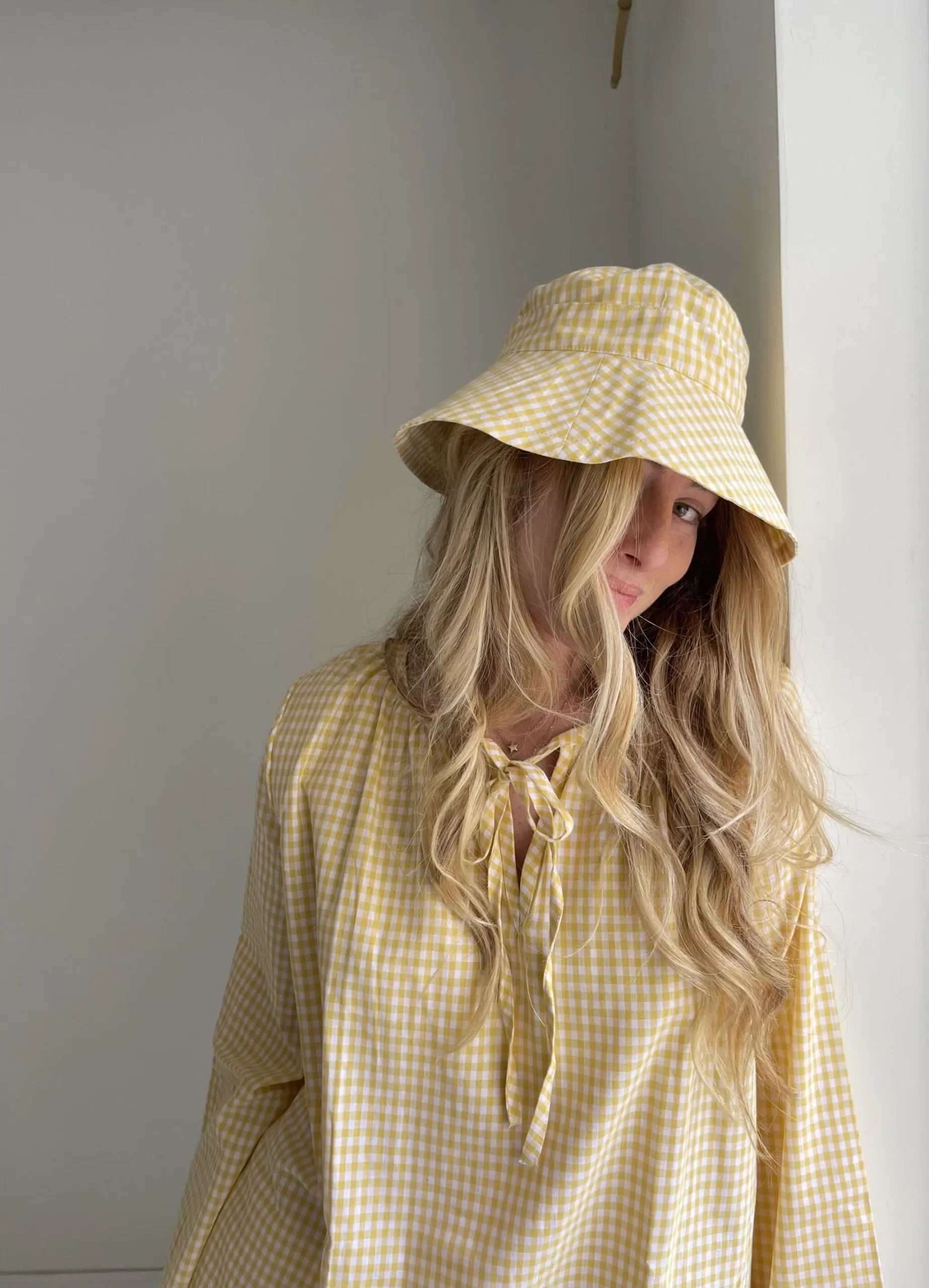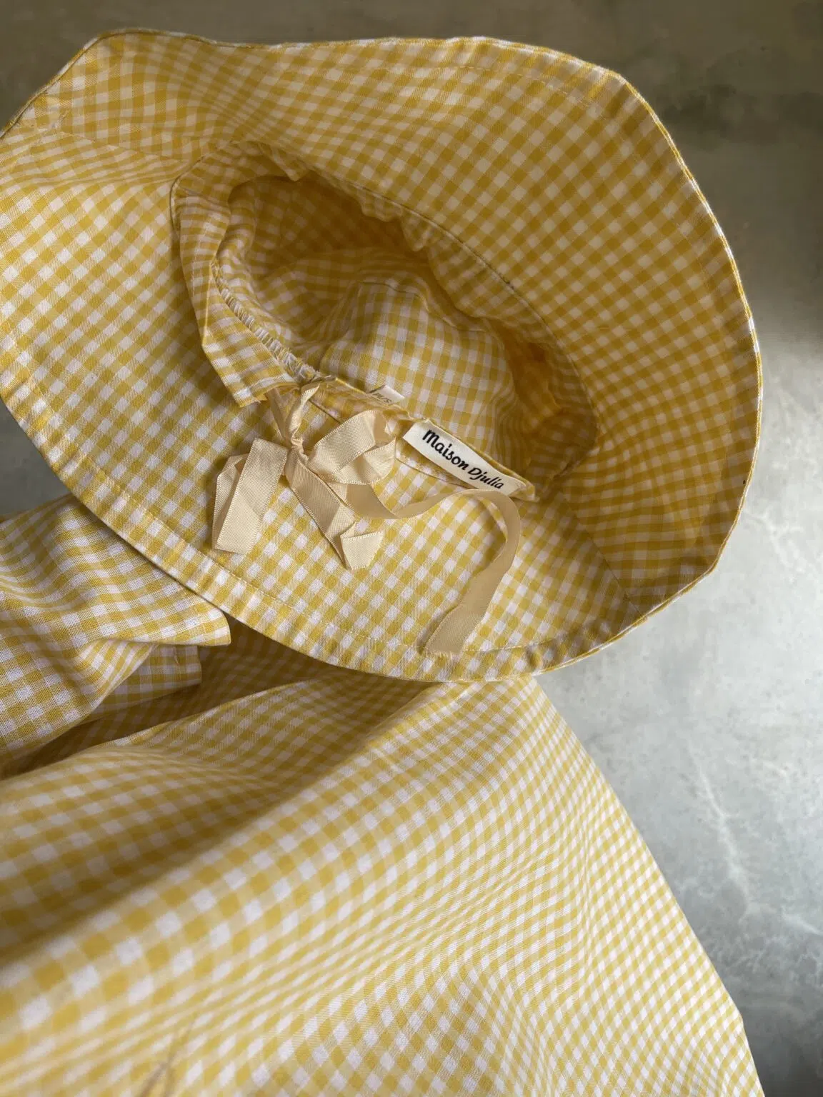 Bob KYOTO en popeline de coton carreaux vichy jaune, réglable (lien de serrage), doublure en coton.