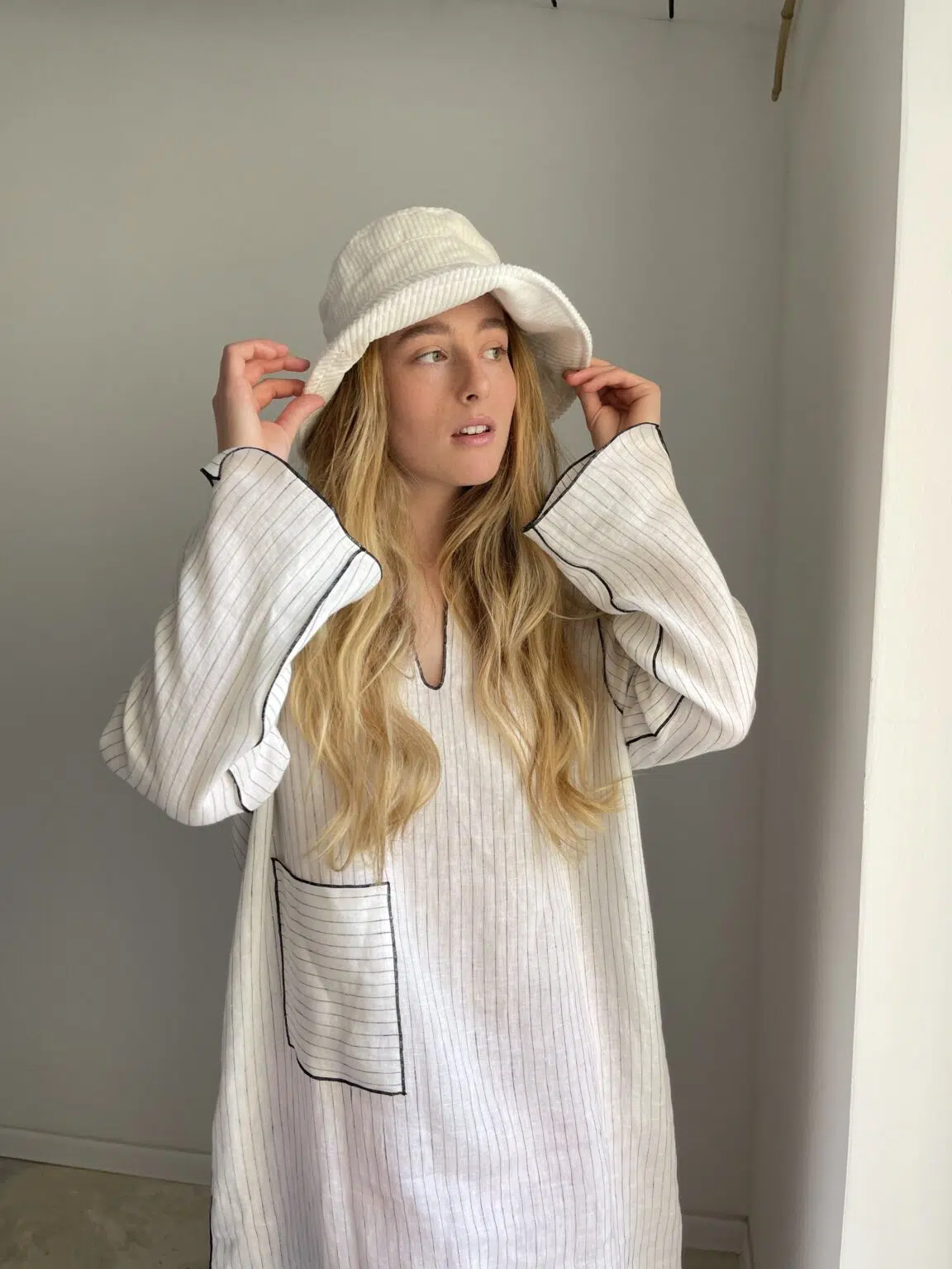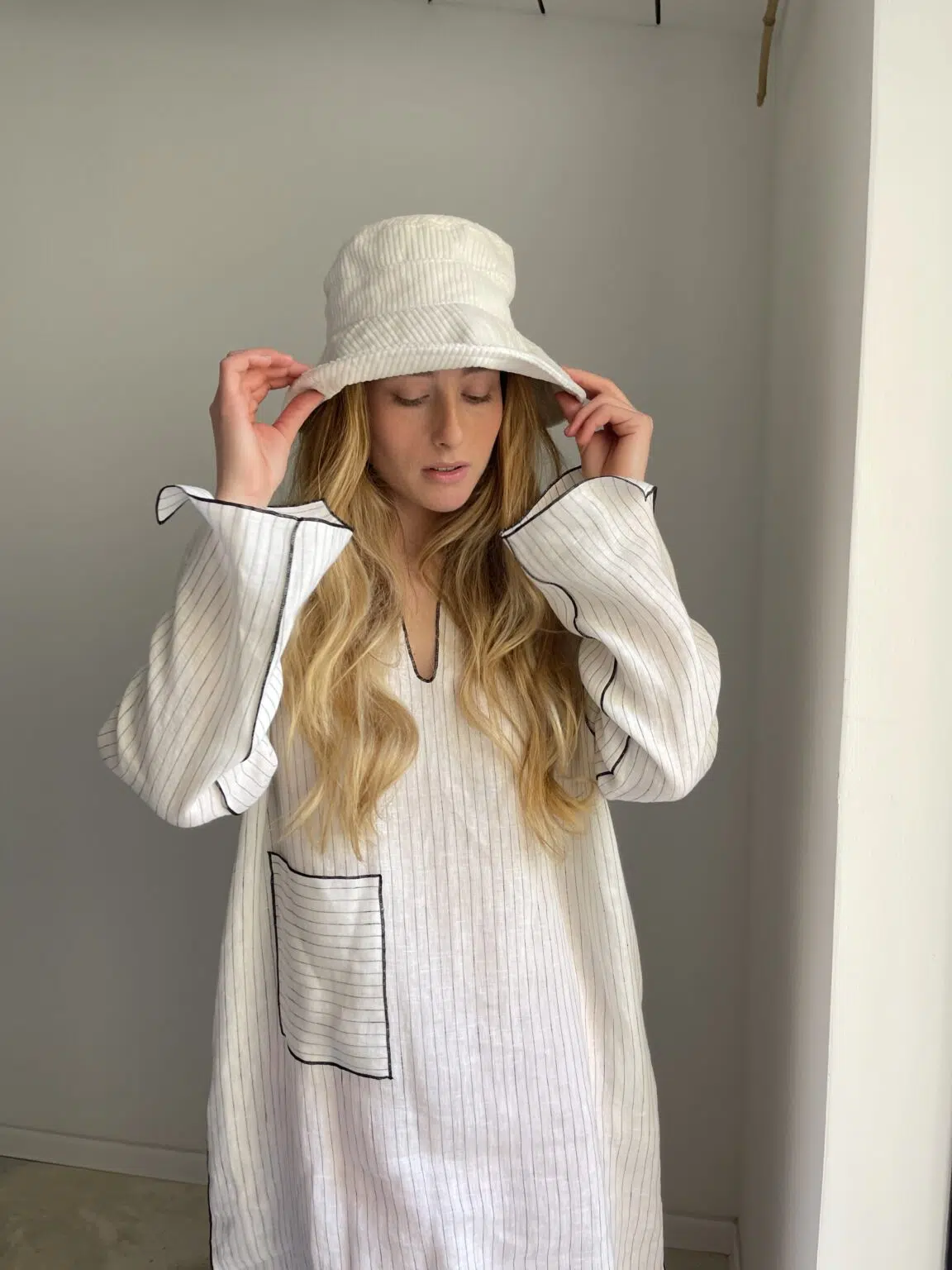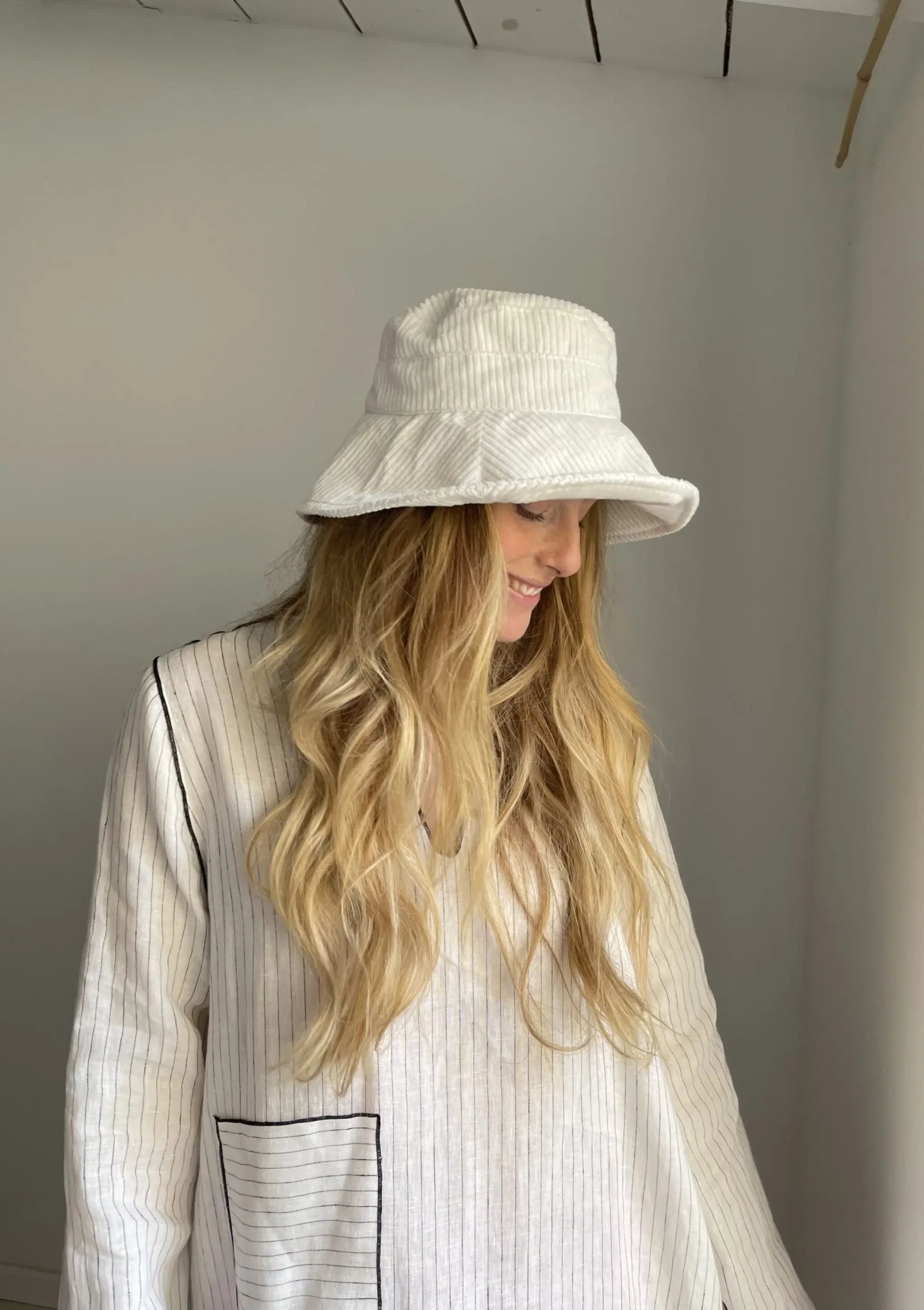 Bob KYOTO en velours côtelé écru, tour de tête réglable avec lien de serrage en organza, doublure en coton.