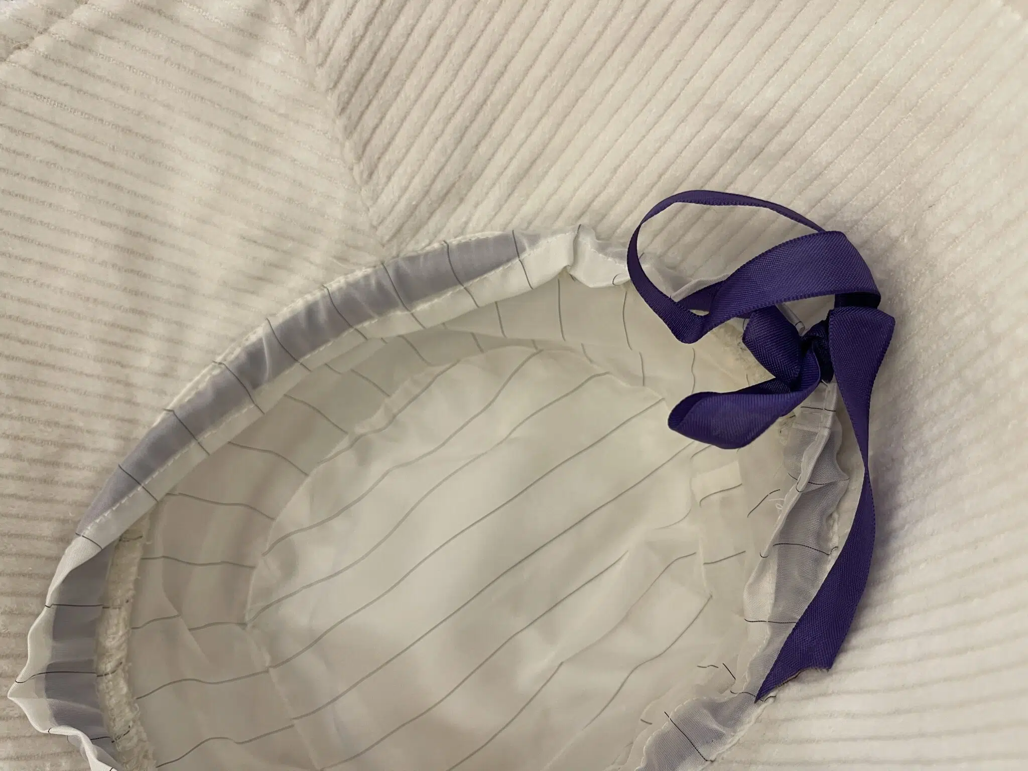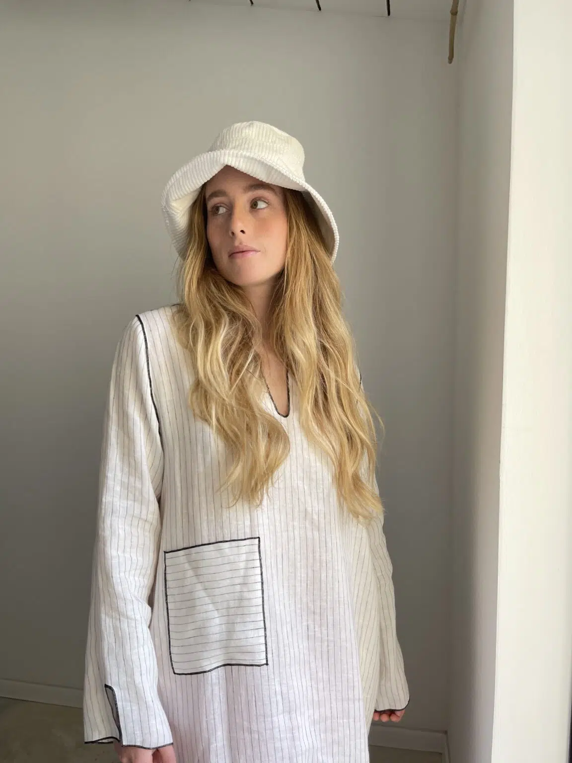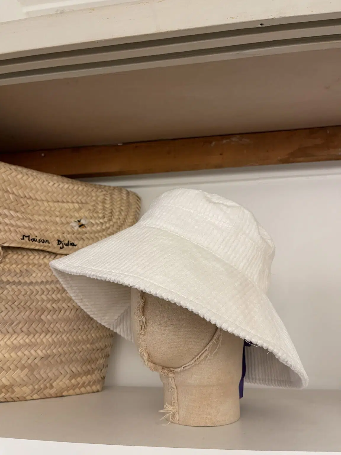 Bob KYOTO en velours côtelé écru, tour de tête réglable avec lien de serrage en organza, doublure en coton.