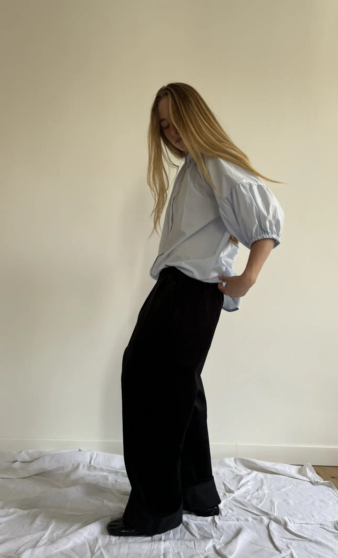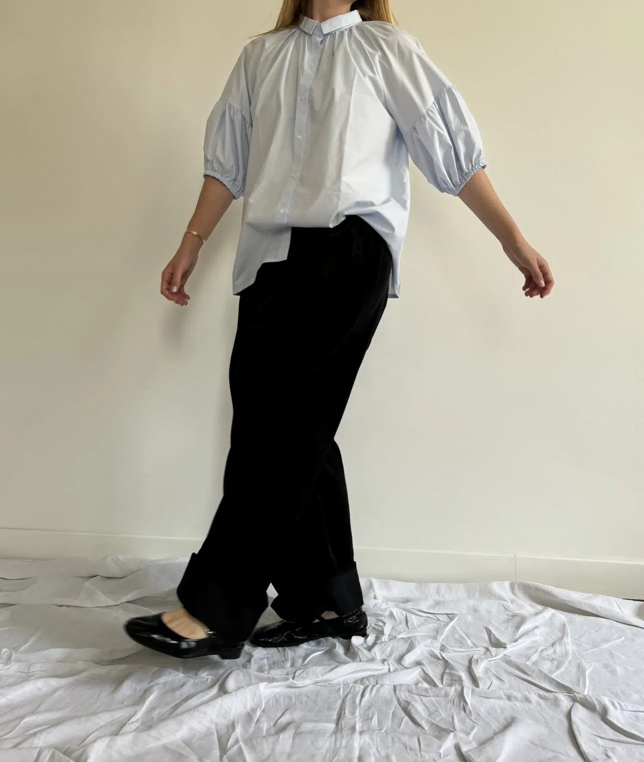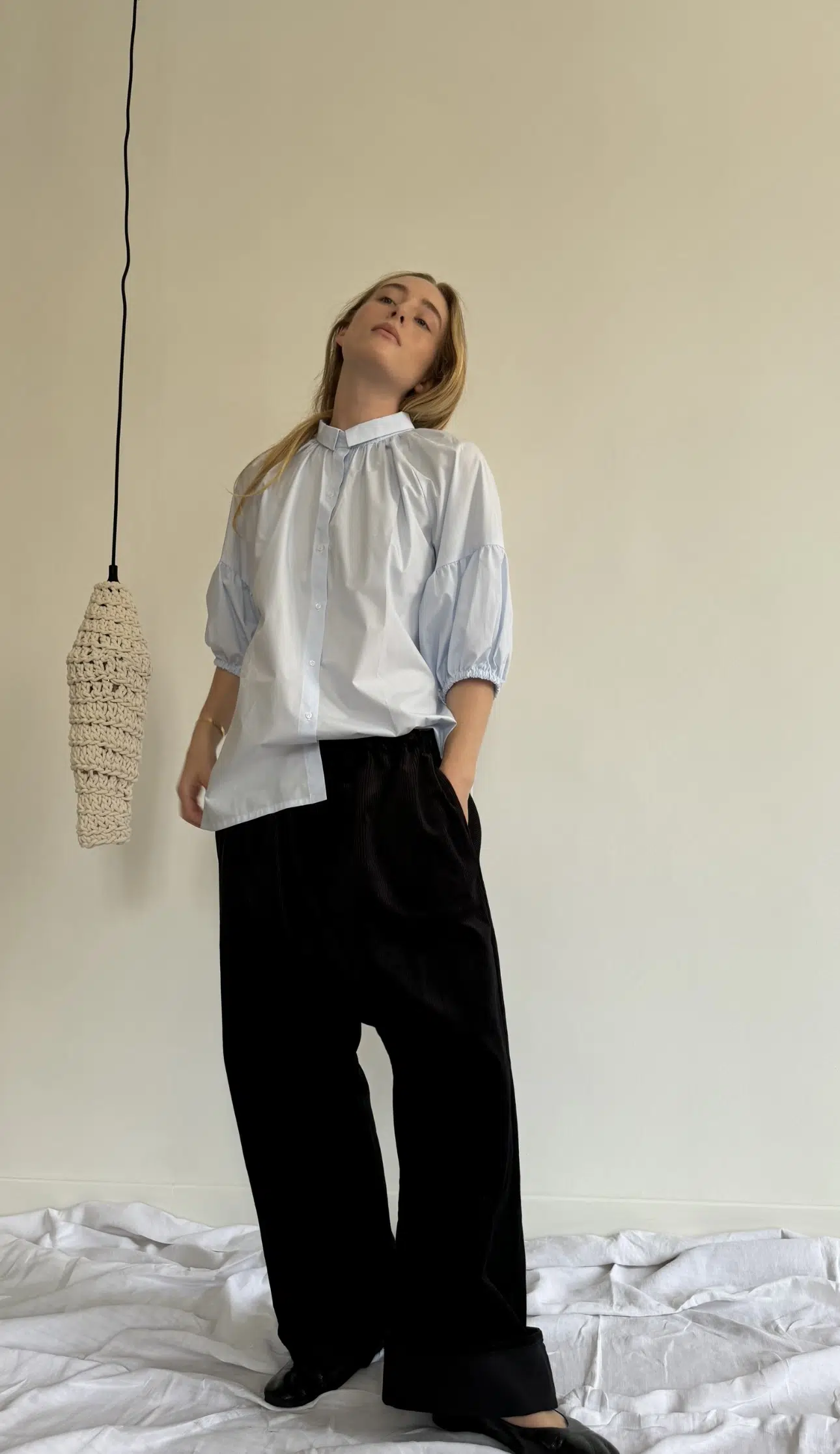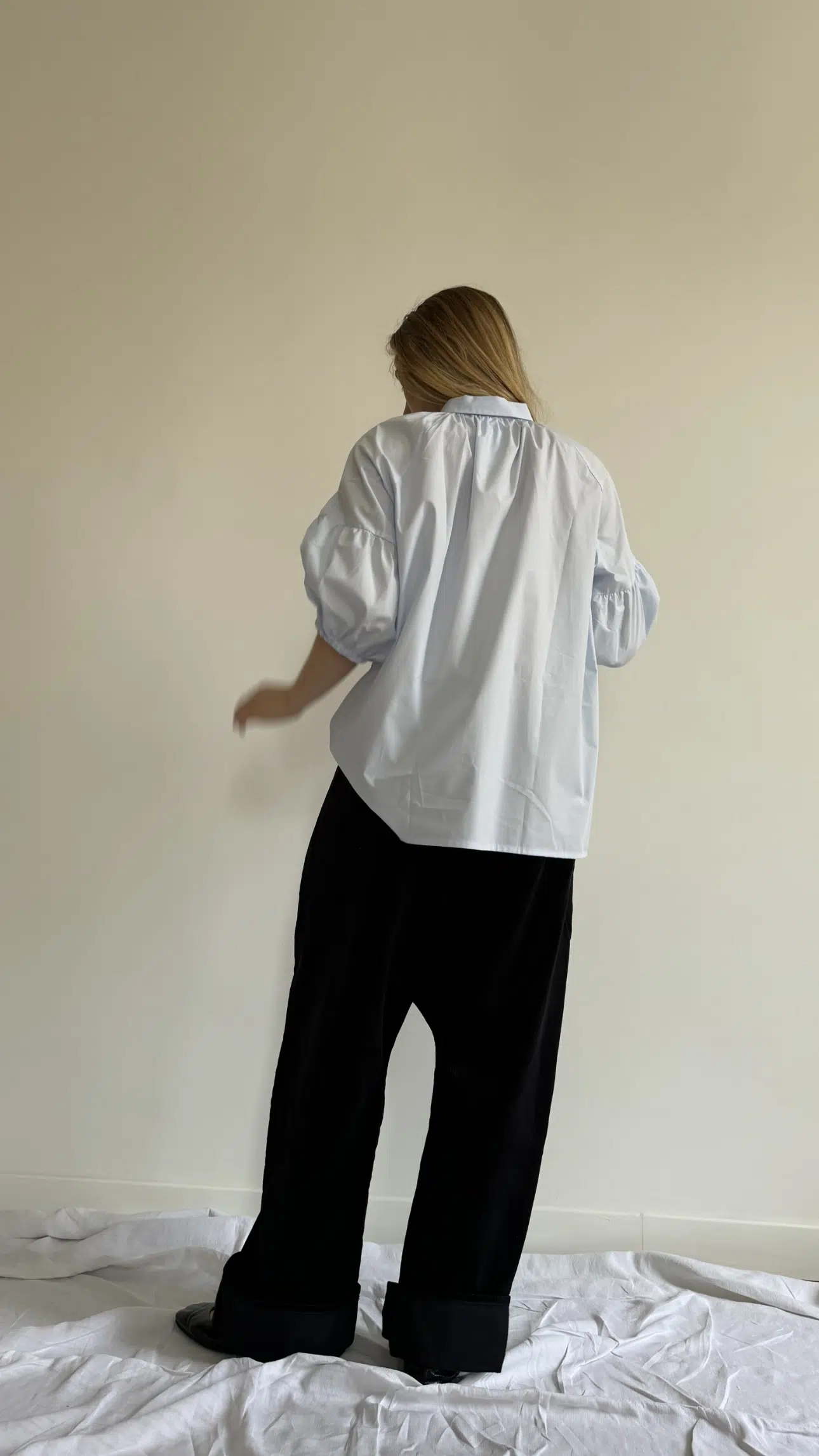 Chemisier « ÉLISE » en popeline de coton bleu ciel. Joli col, manches 3/4 ballons et bouffantes. Jolies fronces au dos, aux épaules et aux manches. Chemisier boutonné à la coupe minimaliste et élégante. PIÈCE UNIQUE