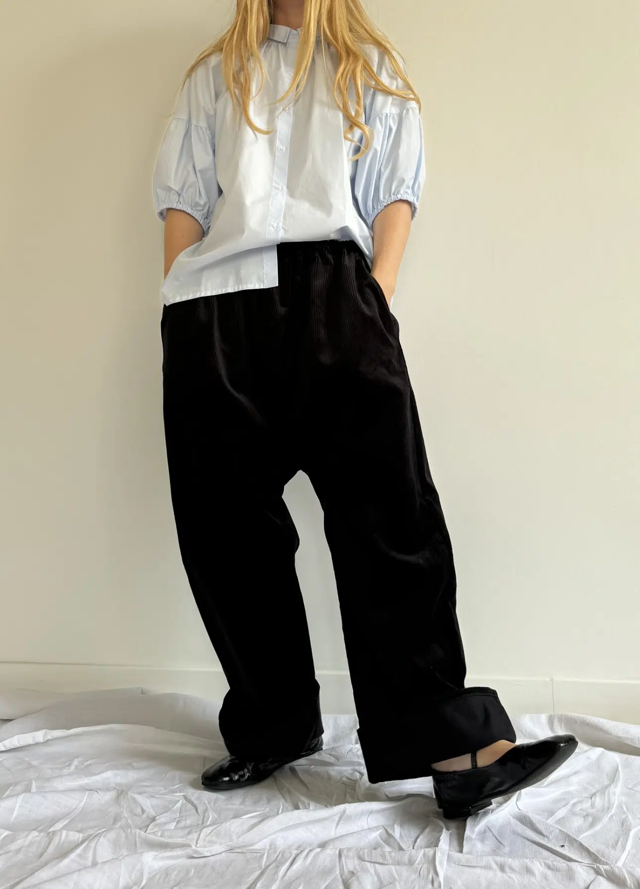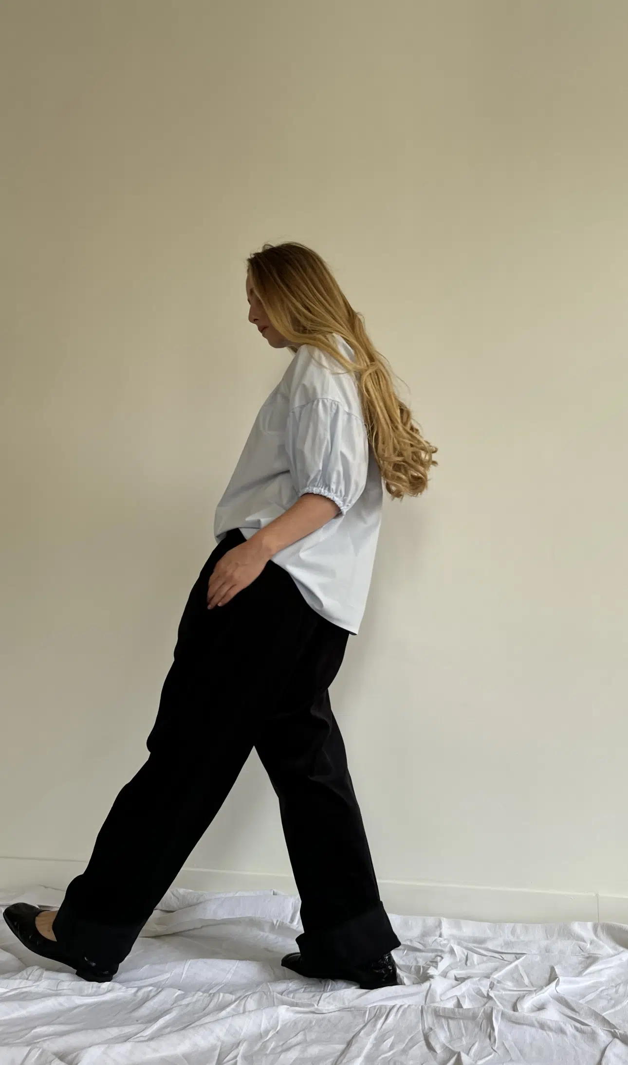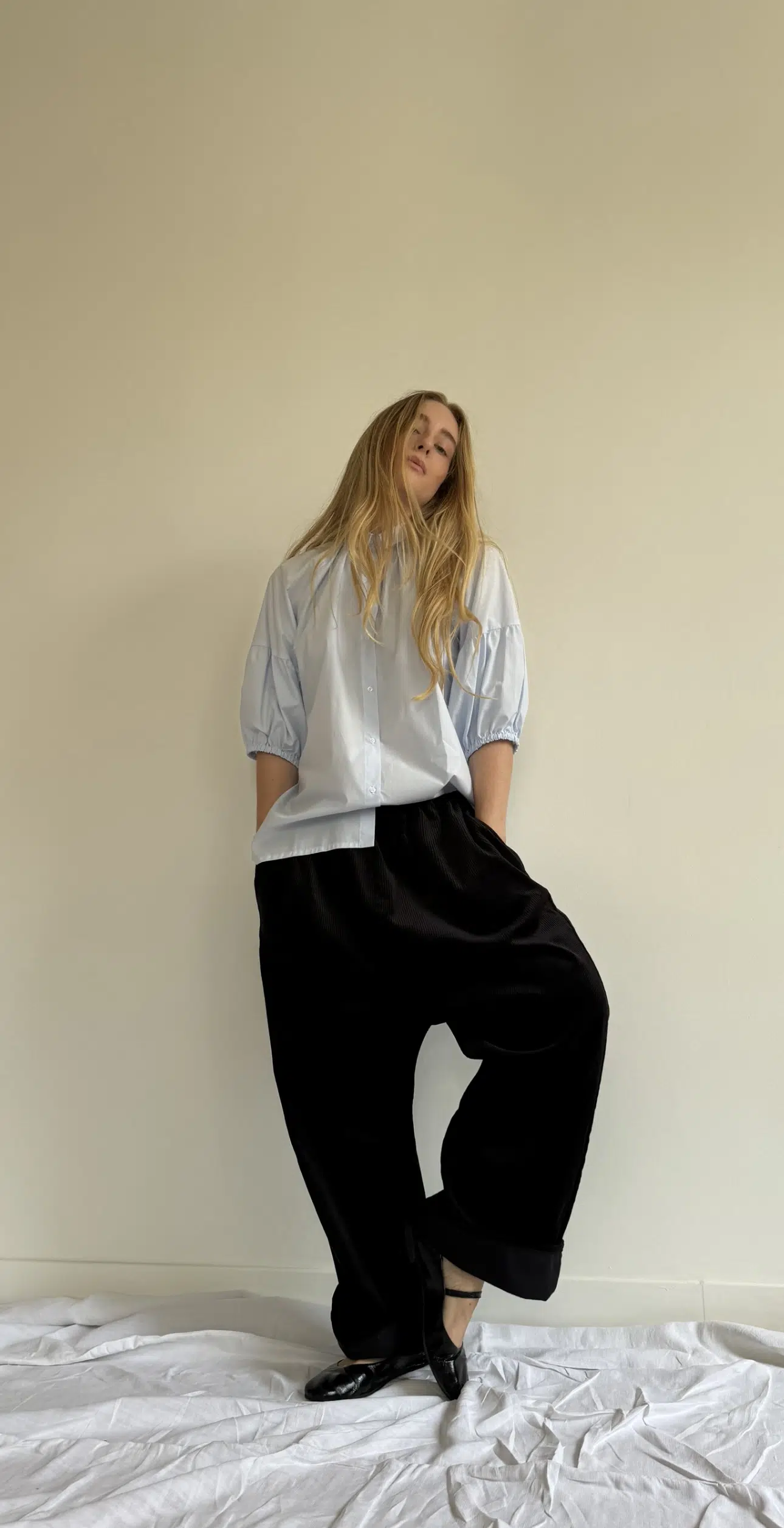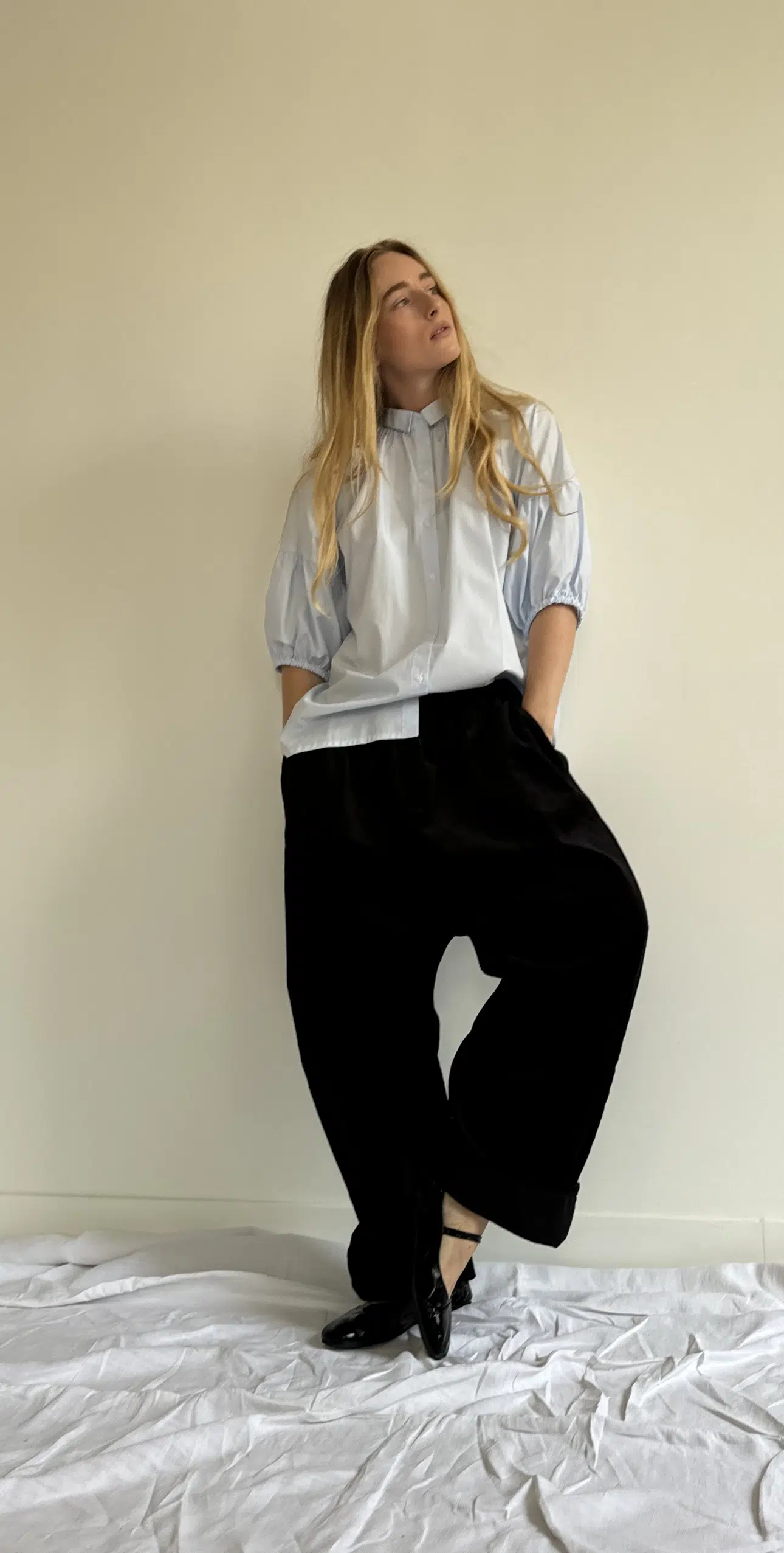 Chemisier « ÉLISE » en popeline de coton bleu ciel. Joli col, manches 3/4 ballons et bouffantes. Jolies fronces au dos, aux épaules et aux manches. Chemisier boutonné à la coupe minimaliste et élégante. PIÈCE UNIQUE