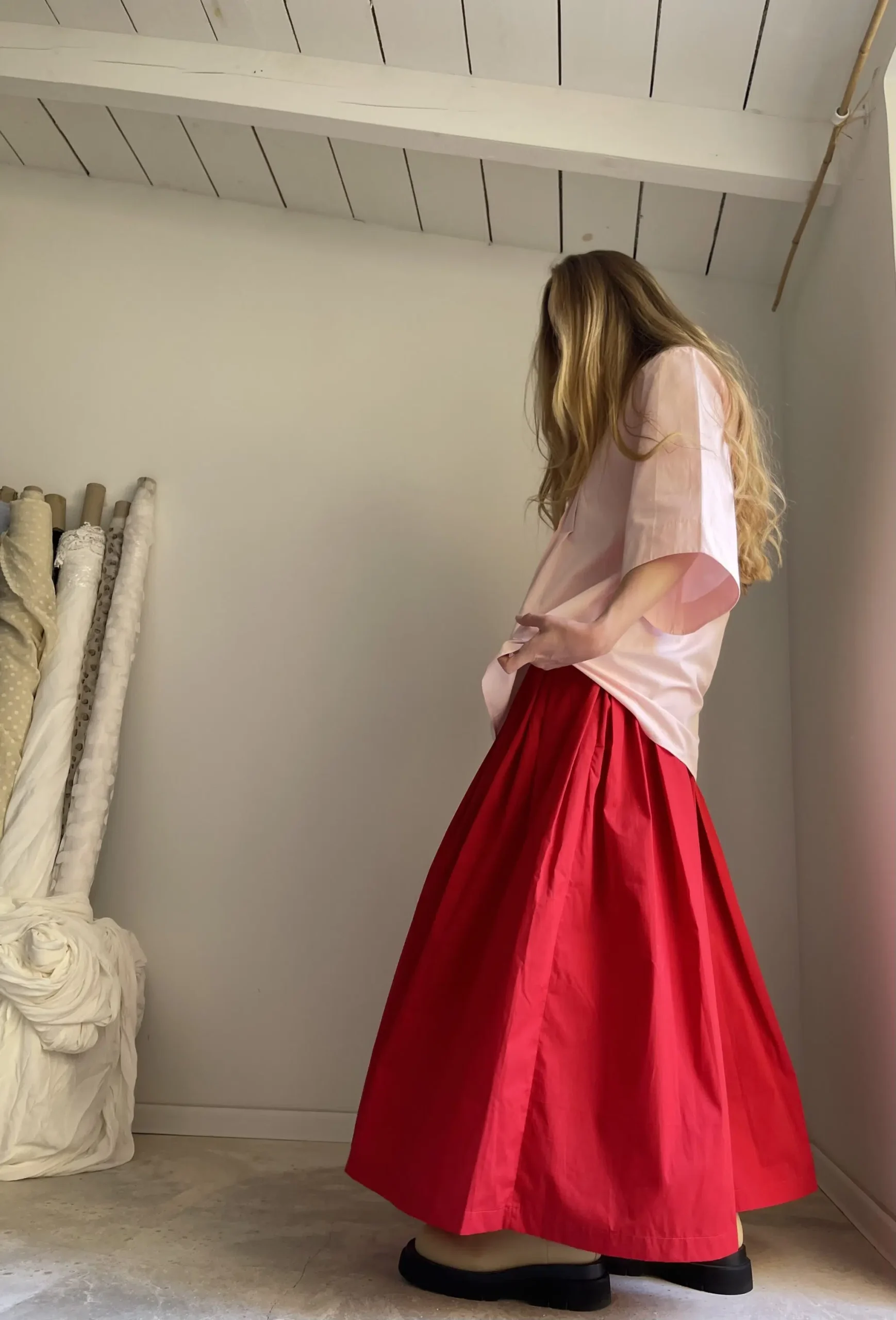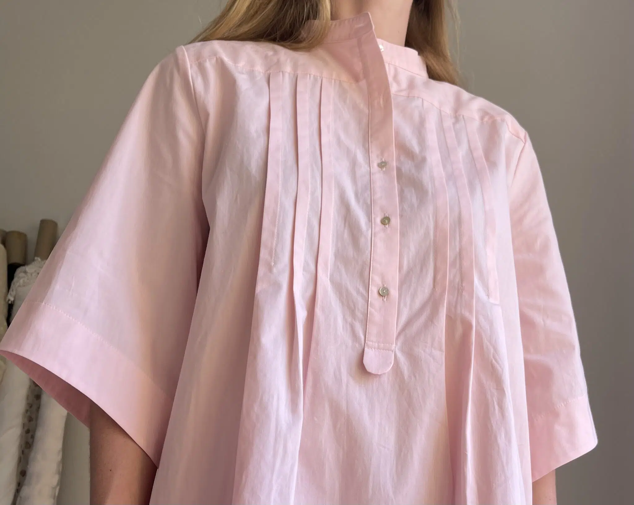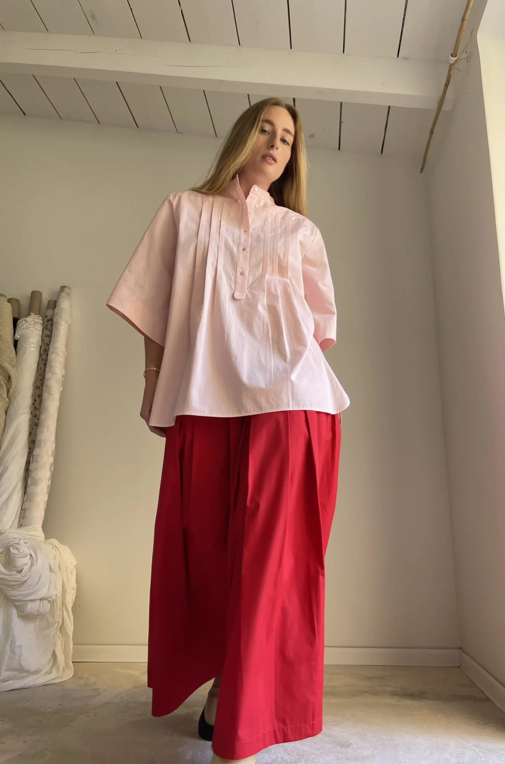Chemisier « LILY » en popeline de coton rose pâle, manches 3/4, plis plats, petites fronces dans le dos. Une coupe minimaliste et élégante. PIÈCE UNIQUE