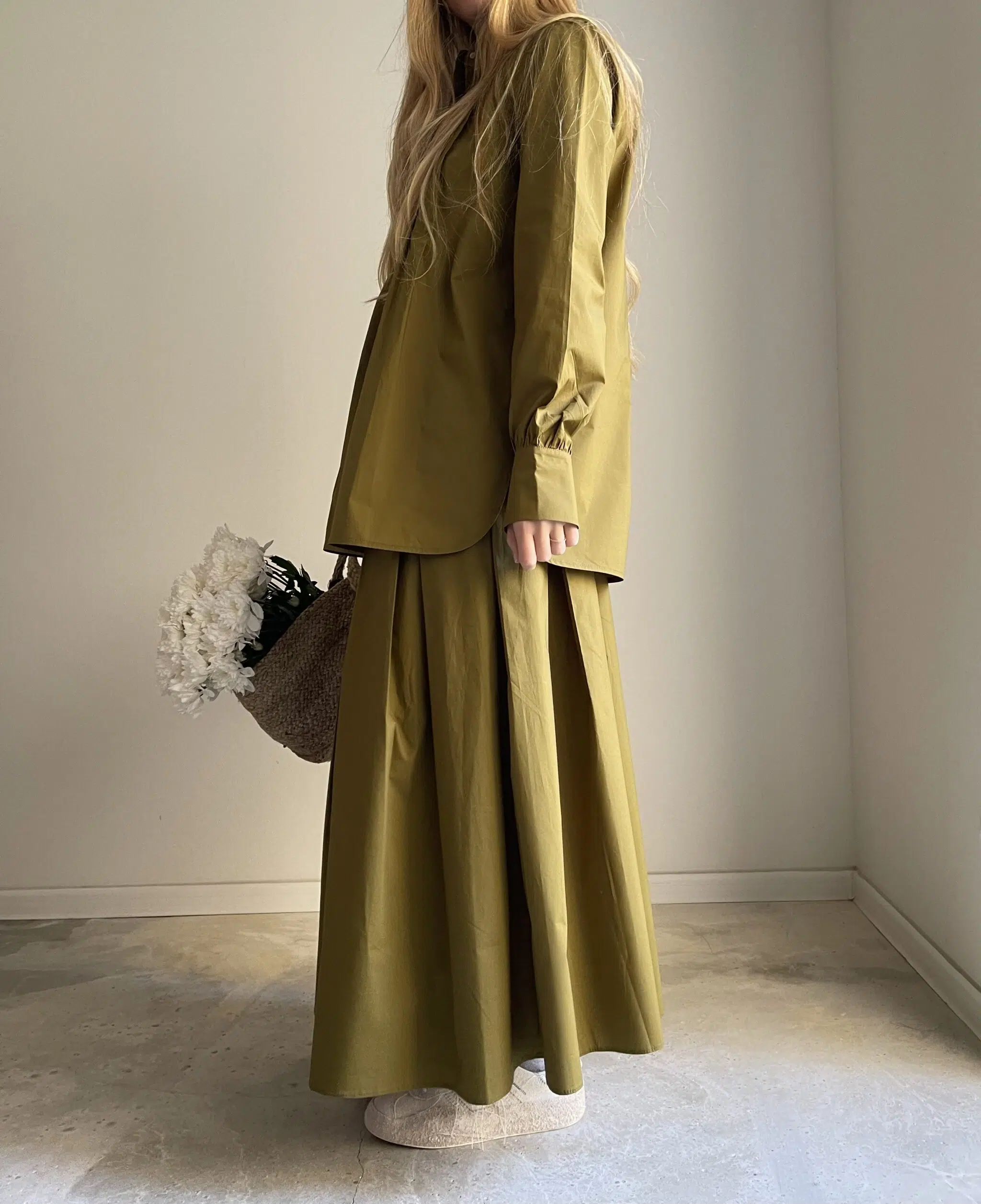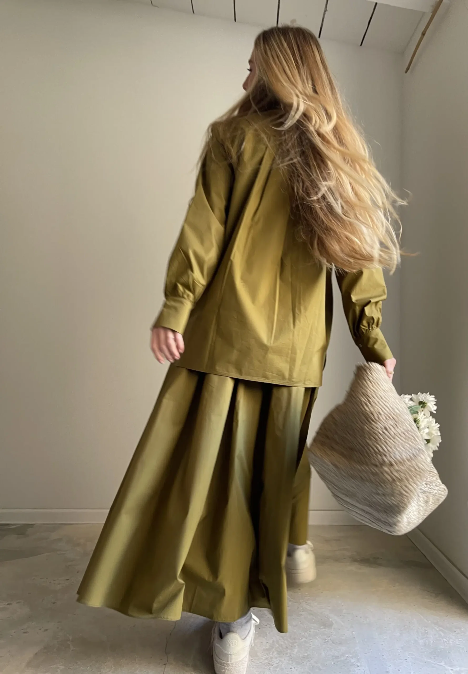 Chemisier « LILY » en popeline de coton vert olive, plis plats, boutons nacrés, bas du chemisier légèrement arrondi, petites fronces dans le dos. Une coupe minimaliste et élégante. PIÈCE UNIQUE