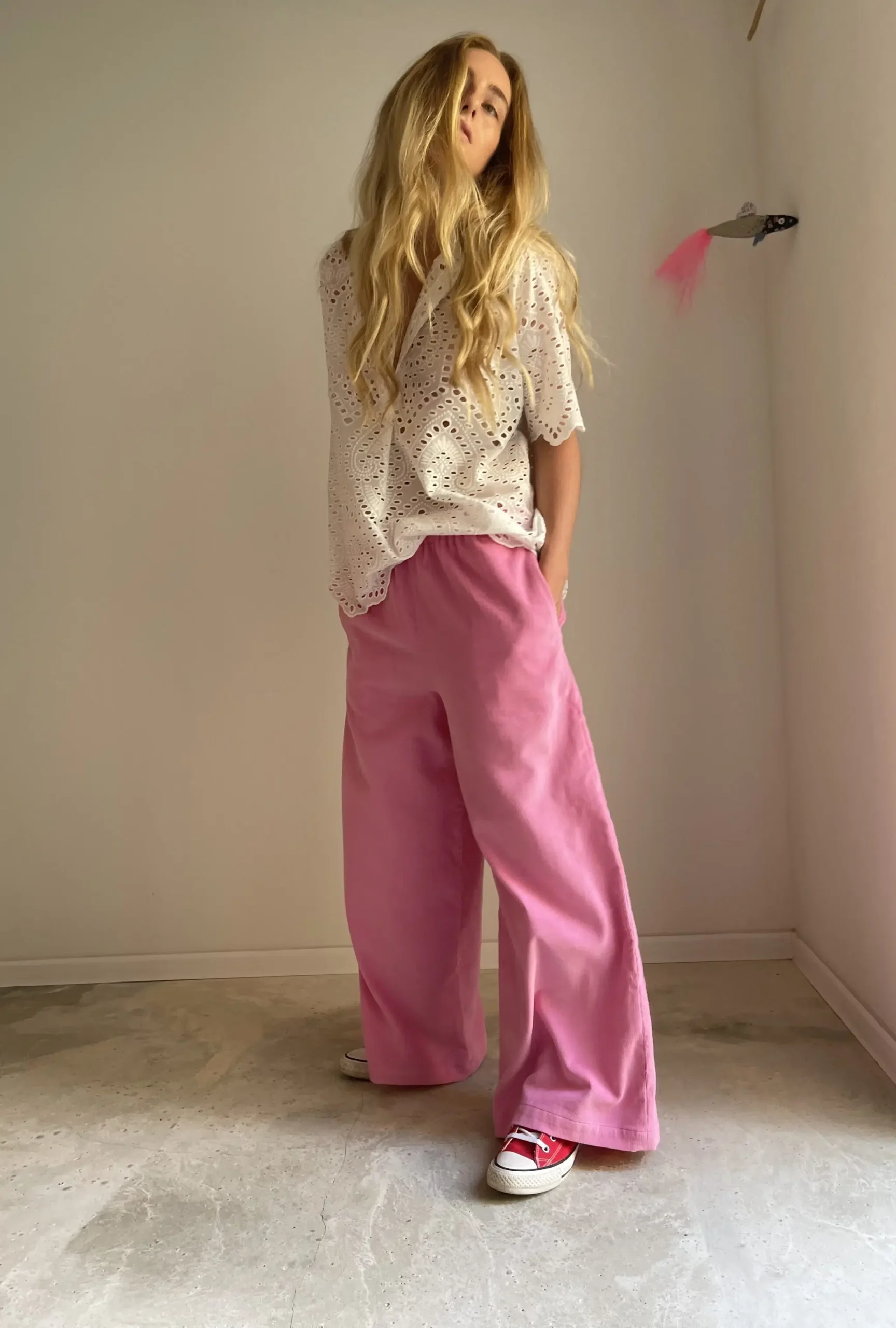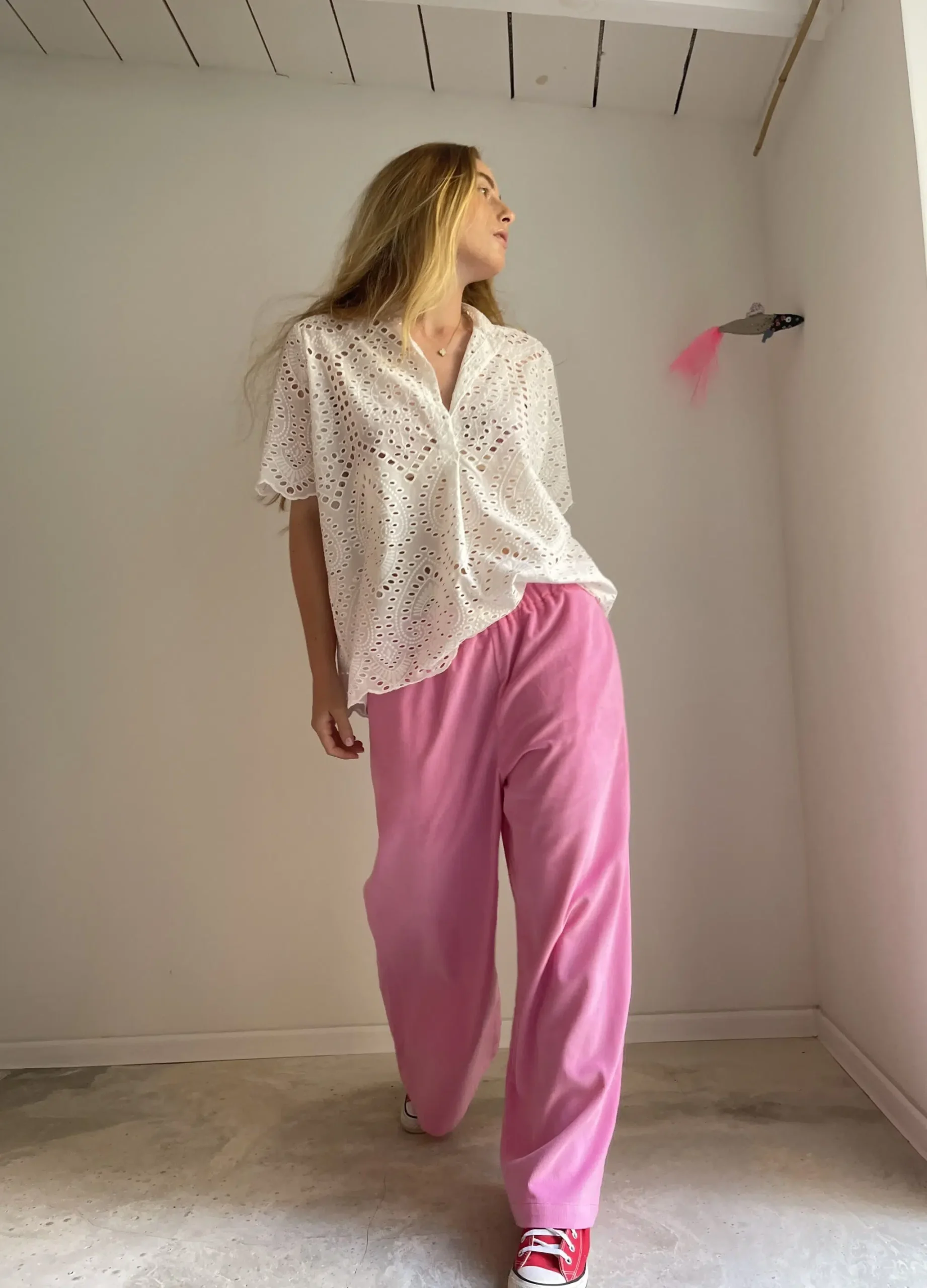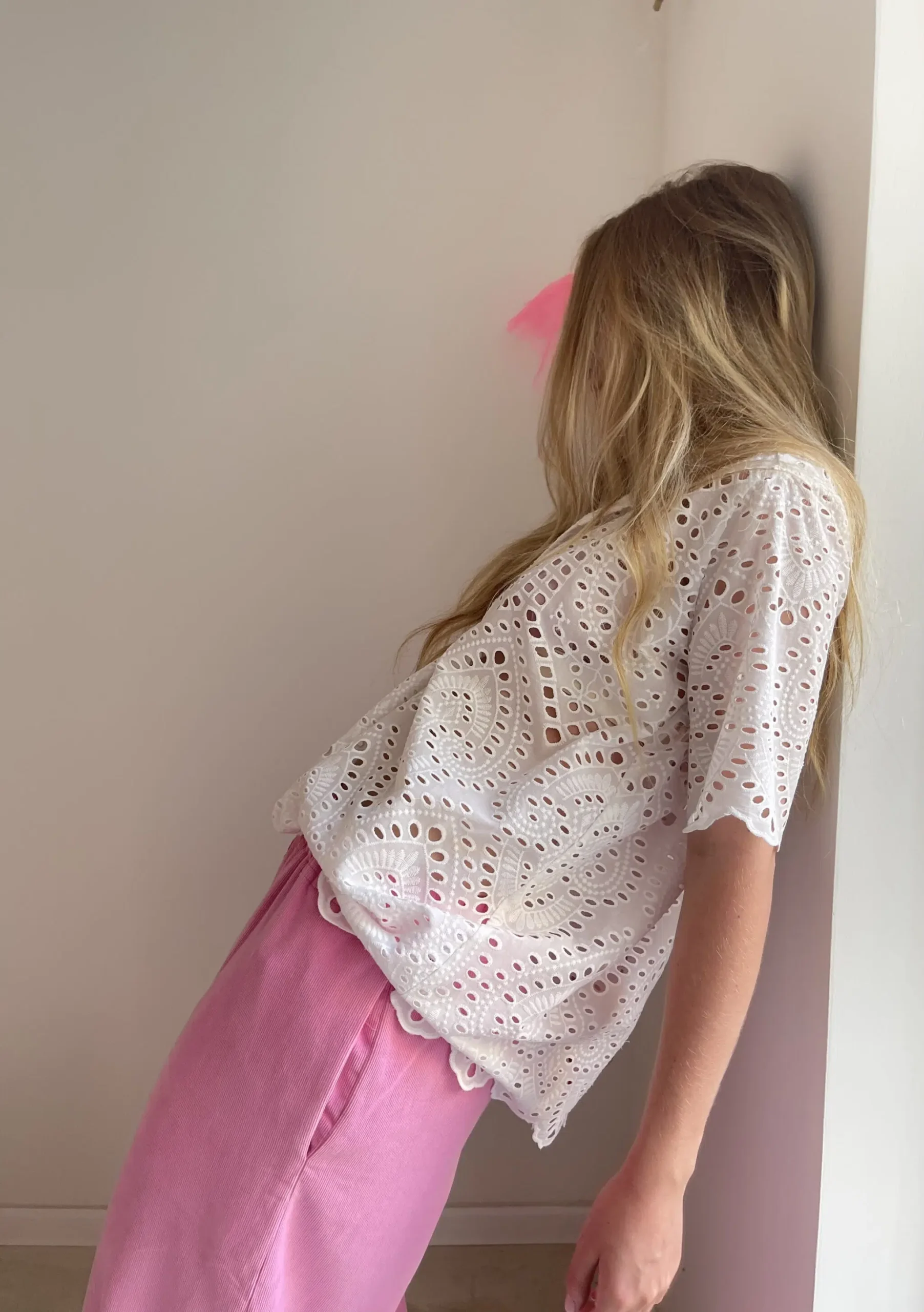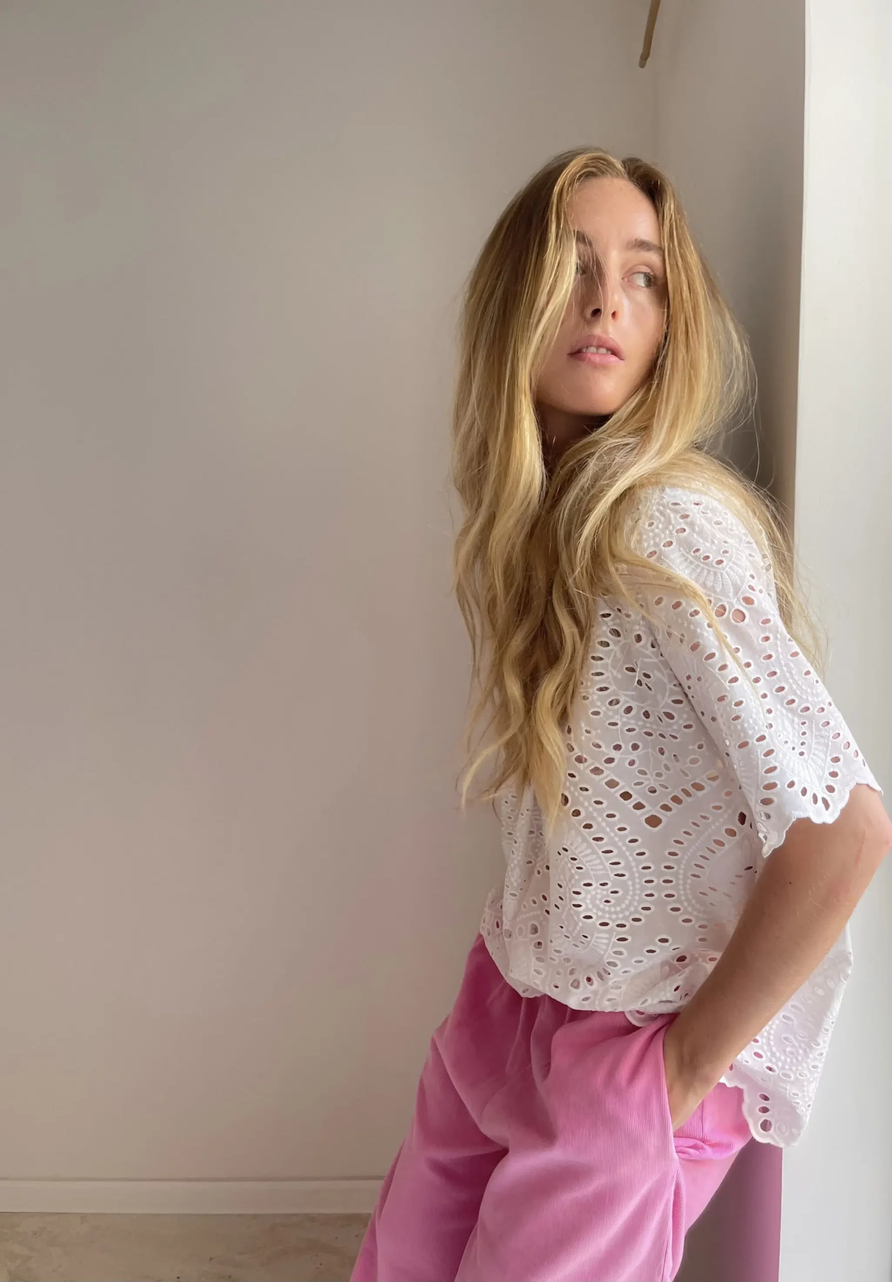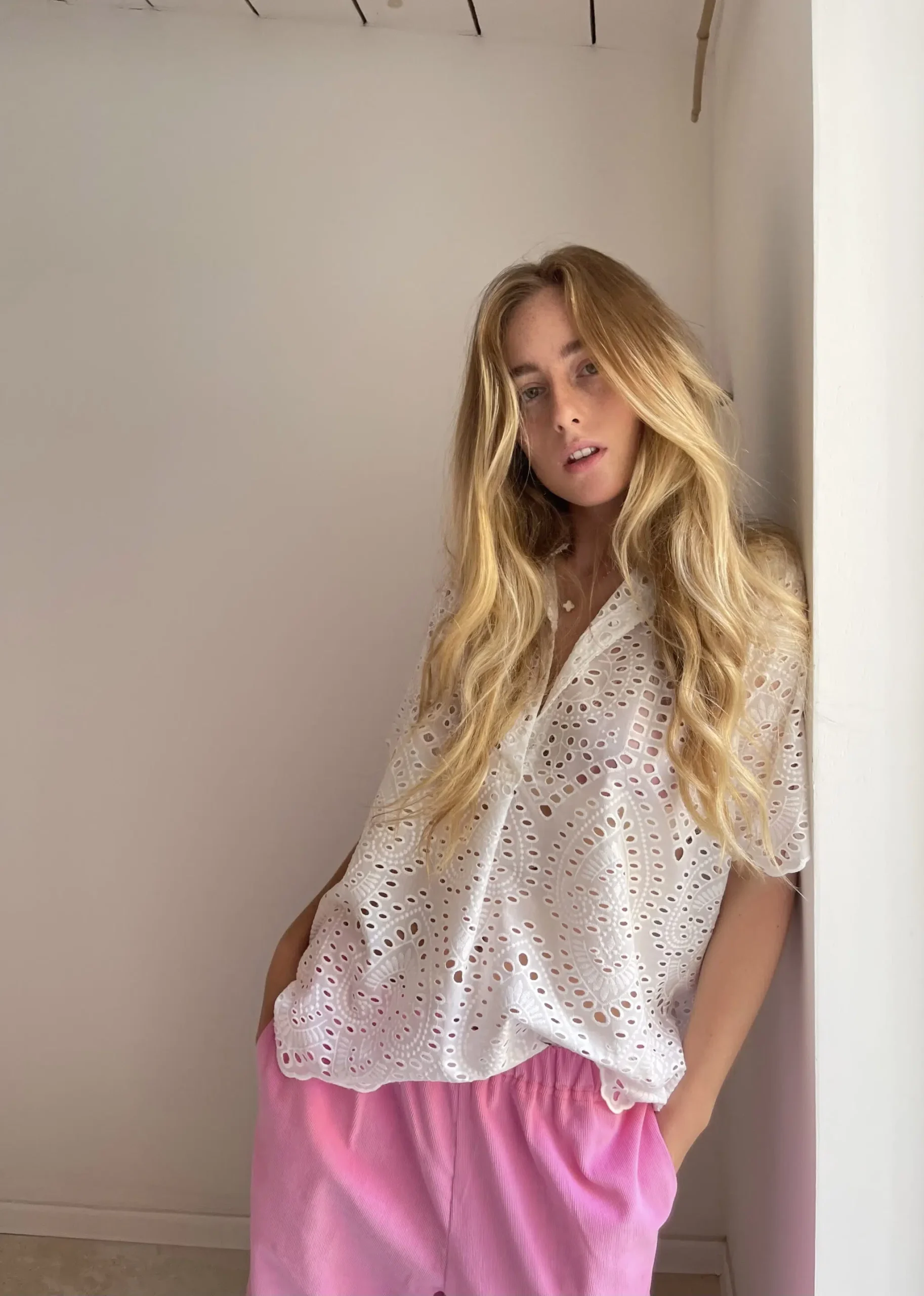 Chemisier en broderie anglaise, col à pression, manches courtes. Une coupe minimaliste pour un chemisier intemporel ! Édition limitée !