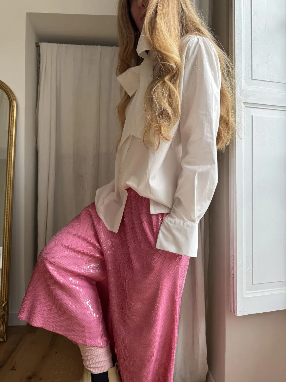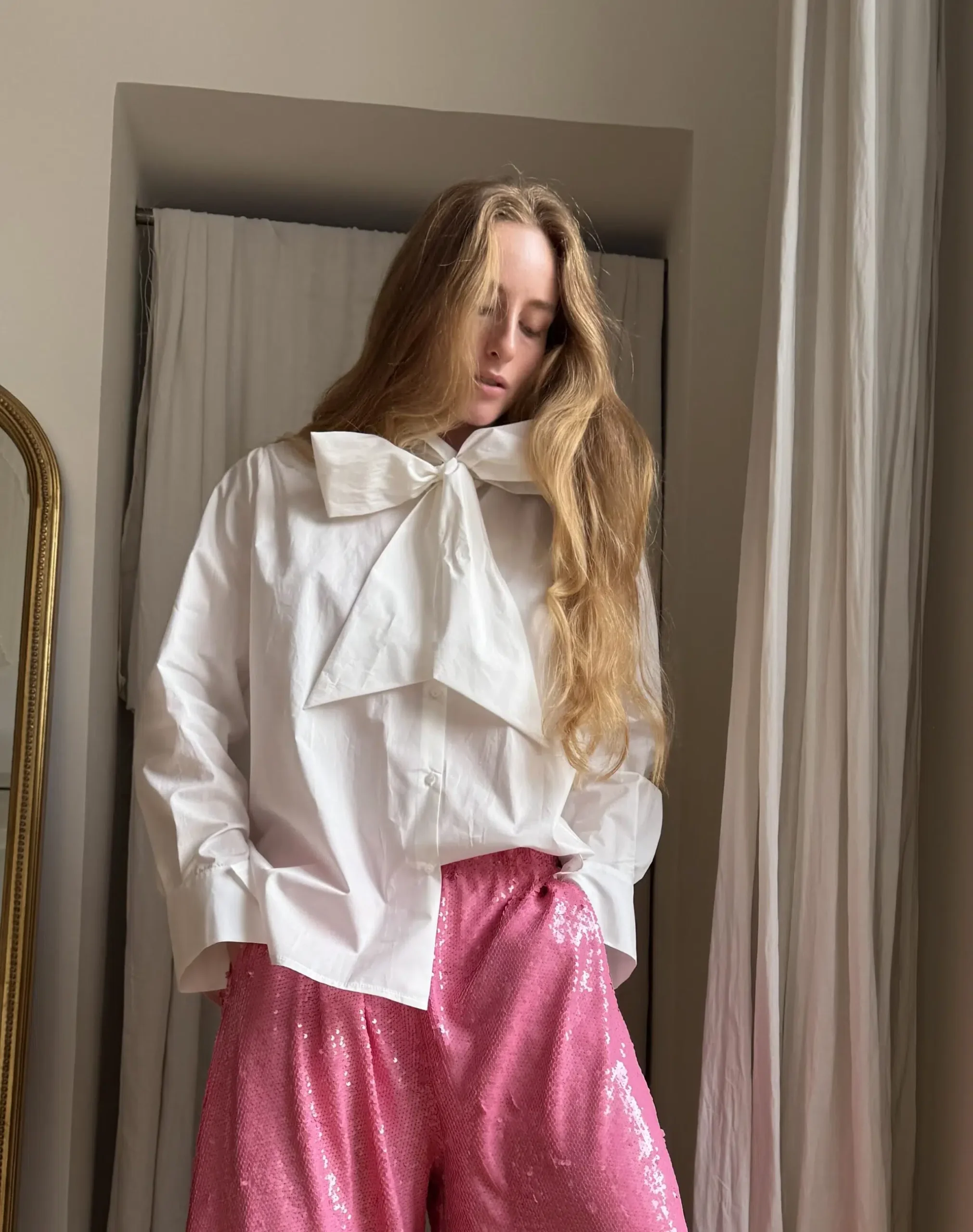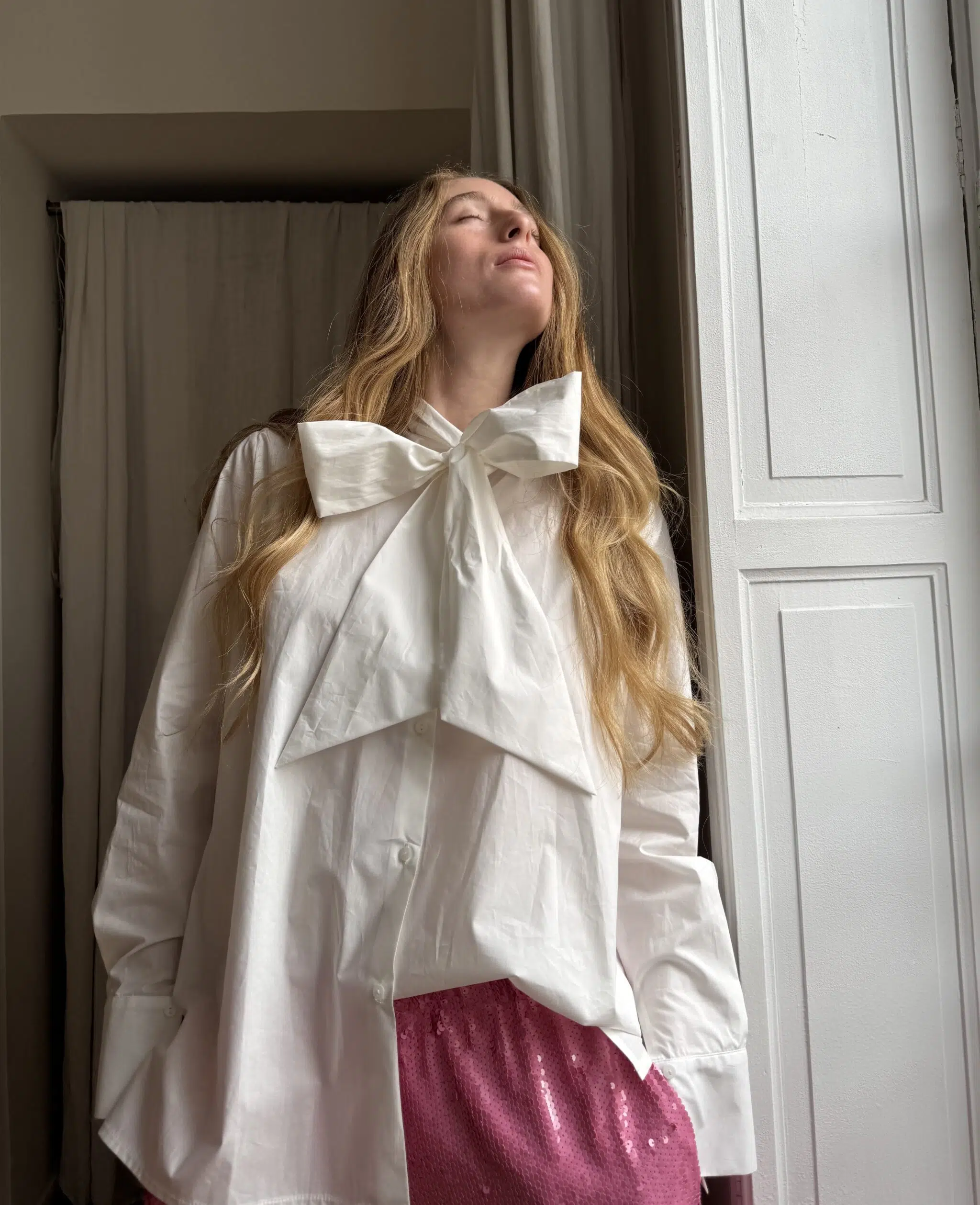 Chemisier « LUCIE » en popeline de coton blanche, entièrement boutonnée, col lavallière, poignets boutonnés. Froncés au dos et aux poignets. Une coupe minimaliste et élégante.