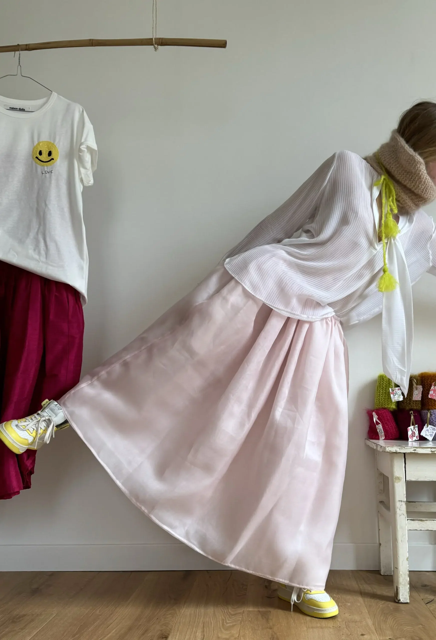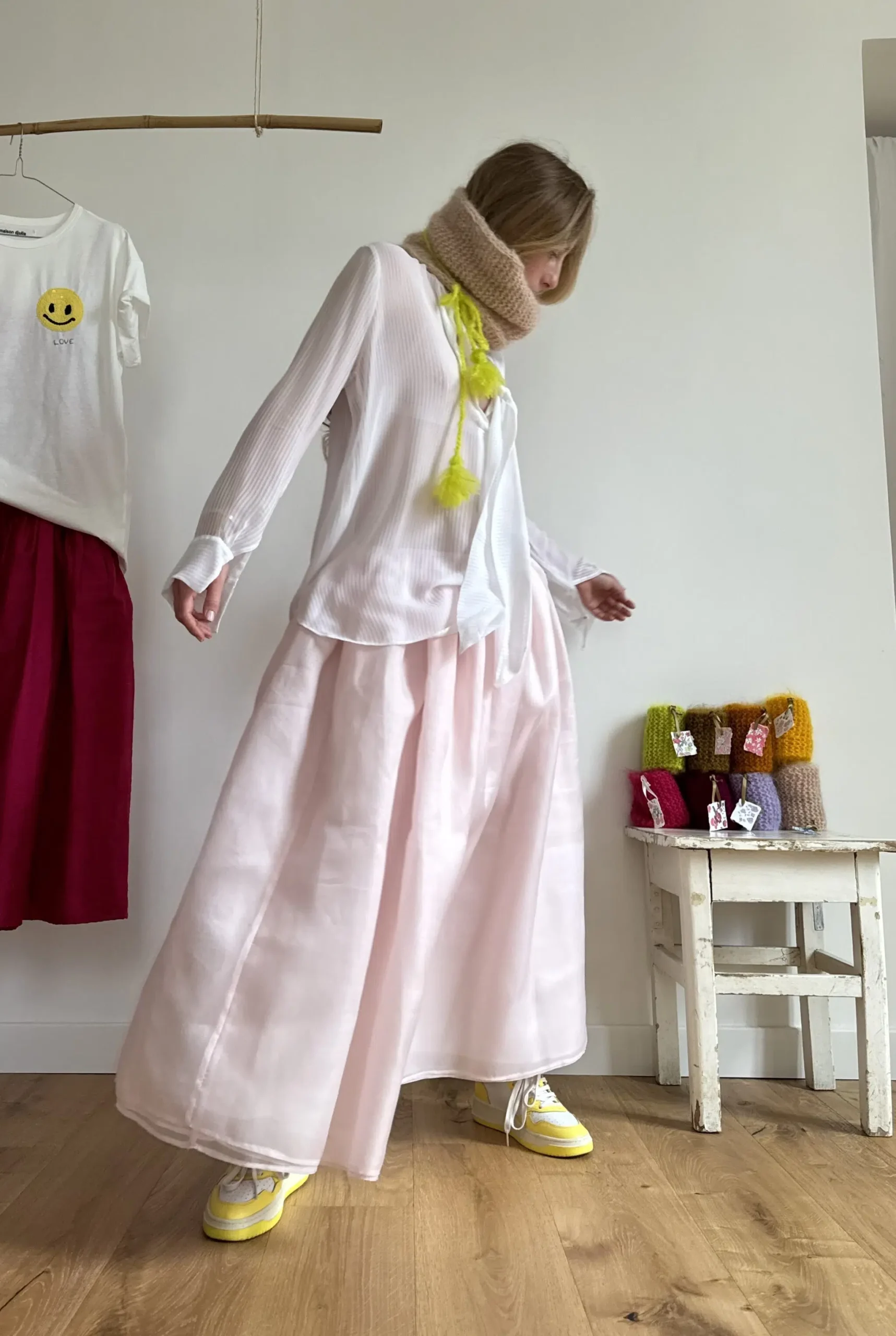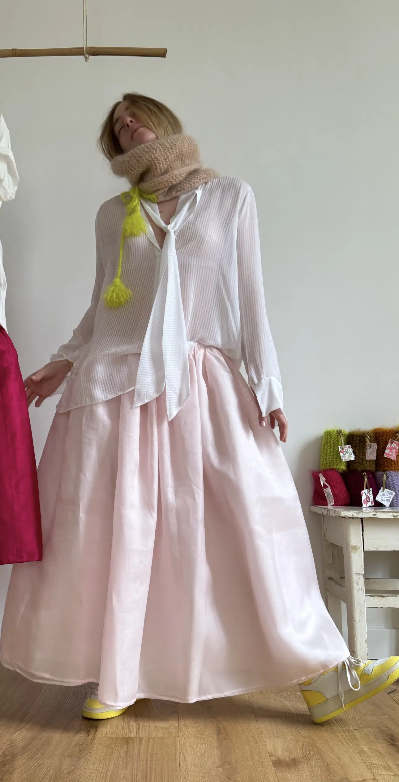 Chemisier « LUCIE » col lavallière en crêpe à rayures. Chemisier transparent. Fronces au dos, poignets à pressions. Édition limitée