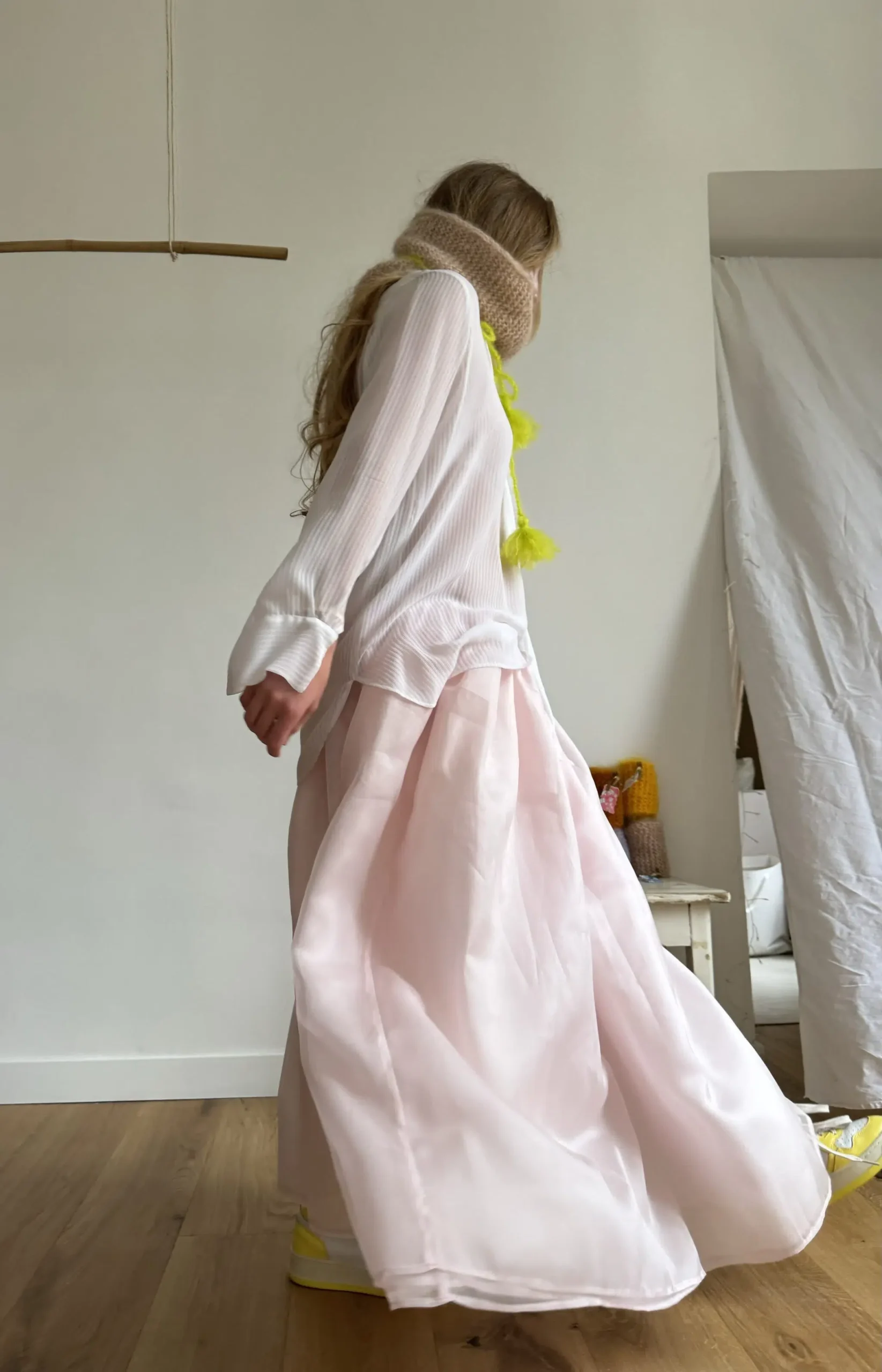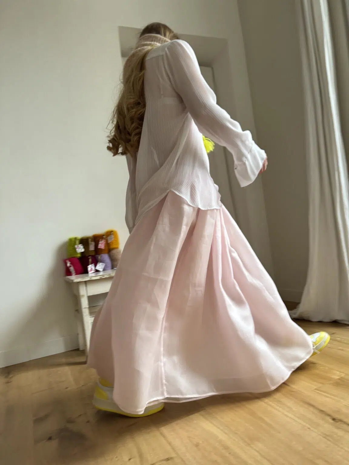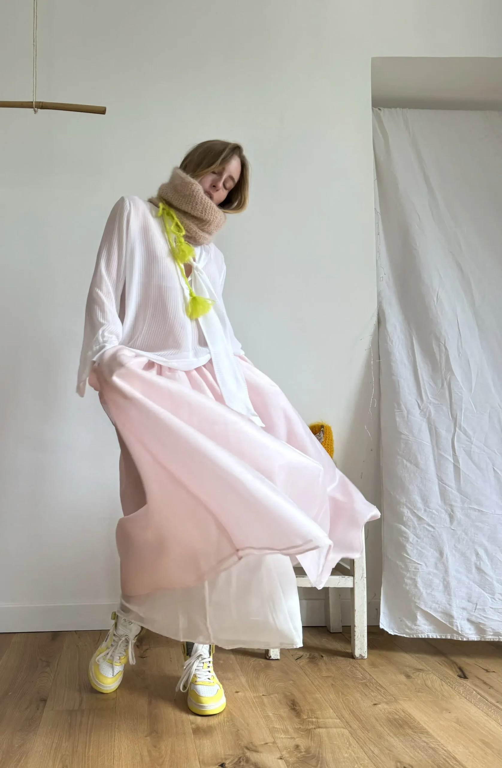Chemisier « LUCIE » col lavallière en crêpe à rayures. Chemisier transparent. Fronces au dos, poignets à pressions. Édition limitée