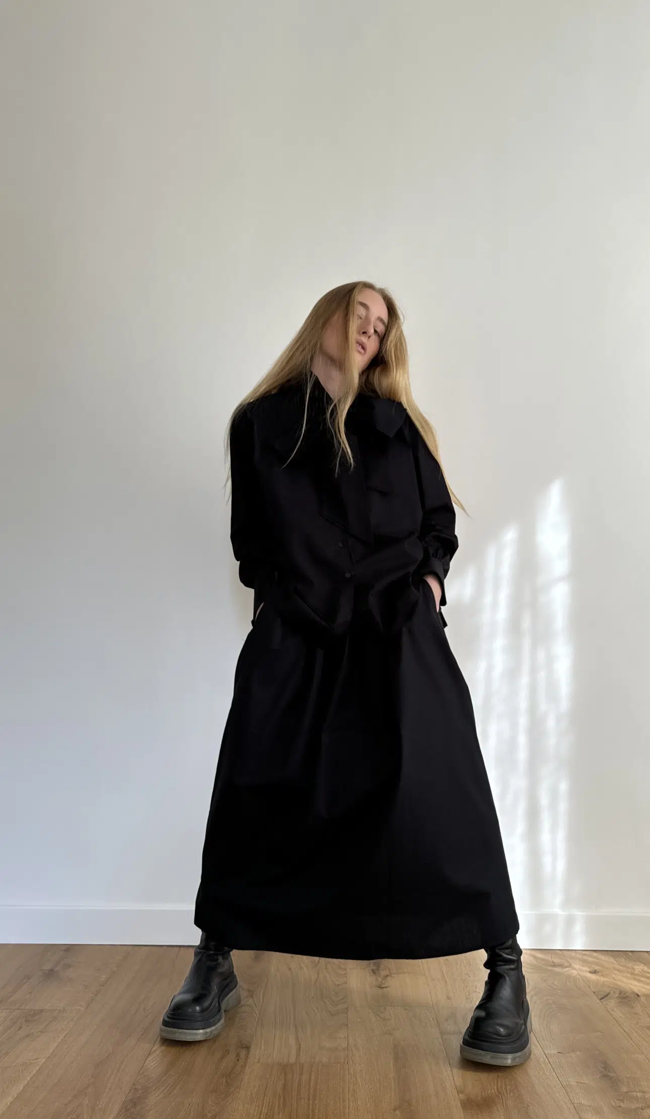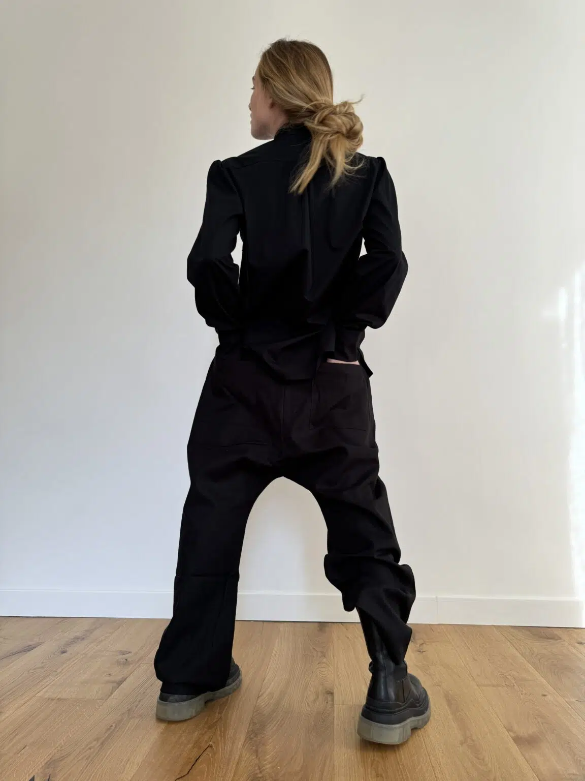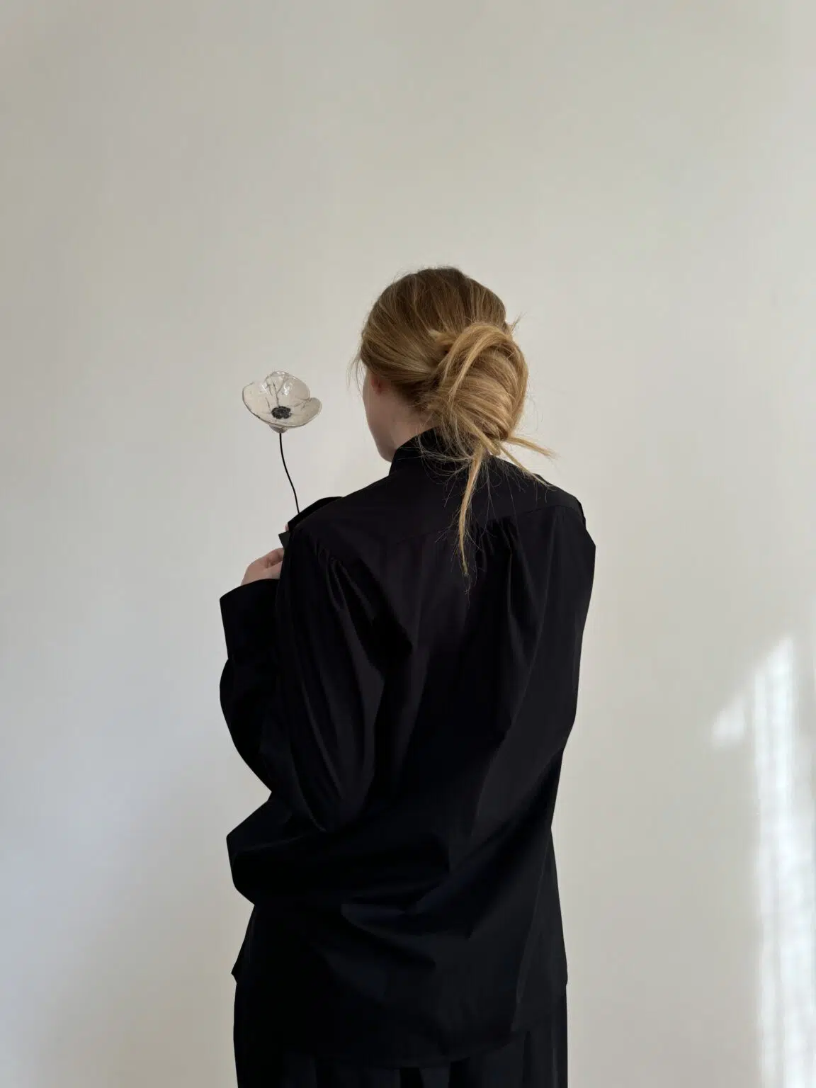 Chemisier « LUCIE » en popeline de coton noire, entièrement boutonnée, col lavallière, poignets boutonnés. Une popeline de coton haute couture. Froncés au dos et aux poignets. Une coupe minimaliste et élégante. Édition très limitée