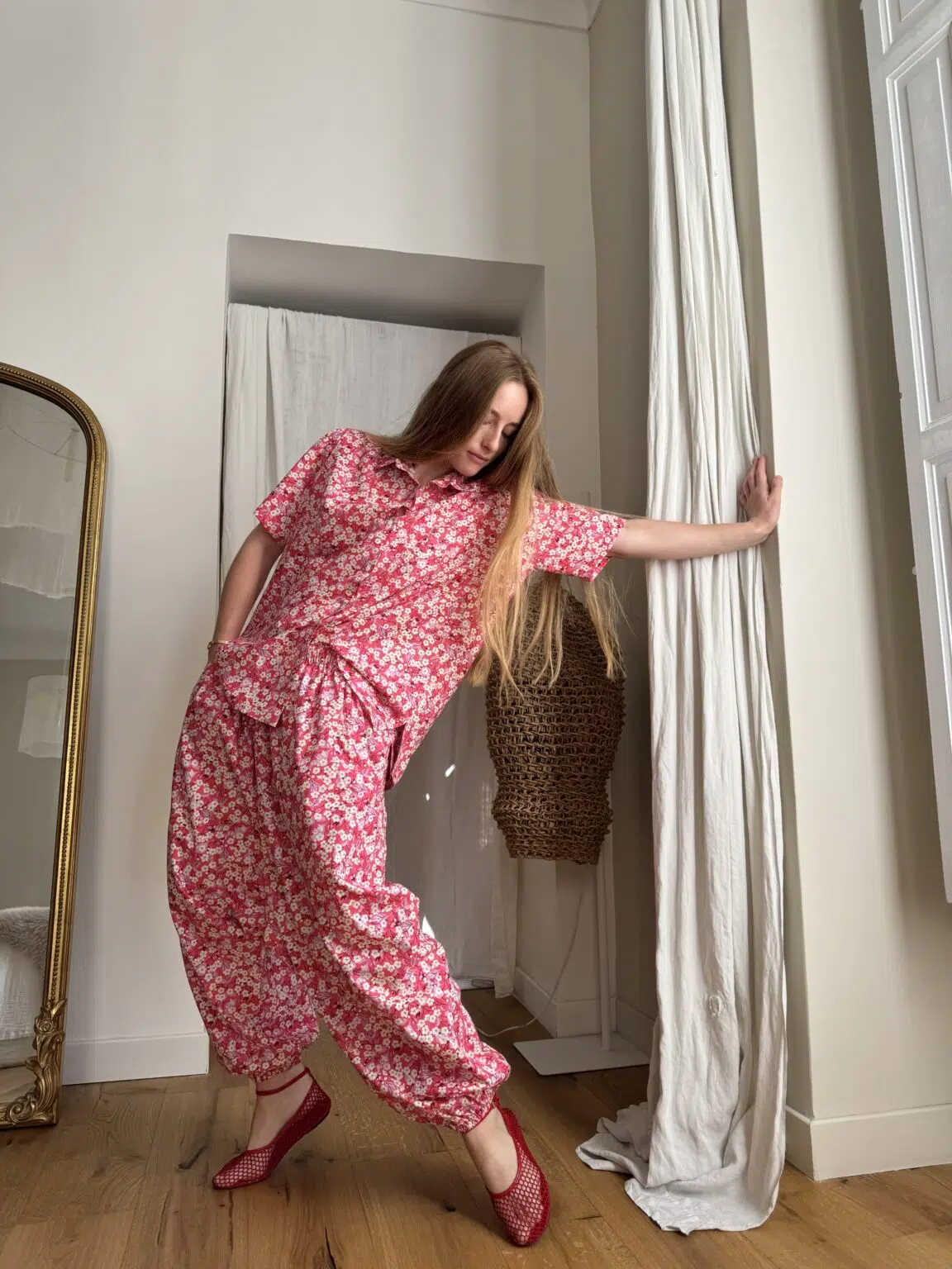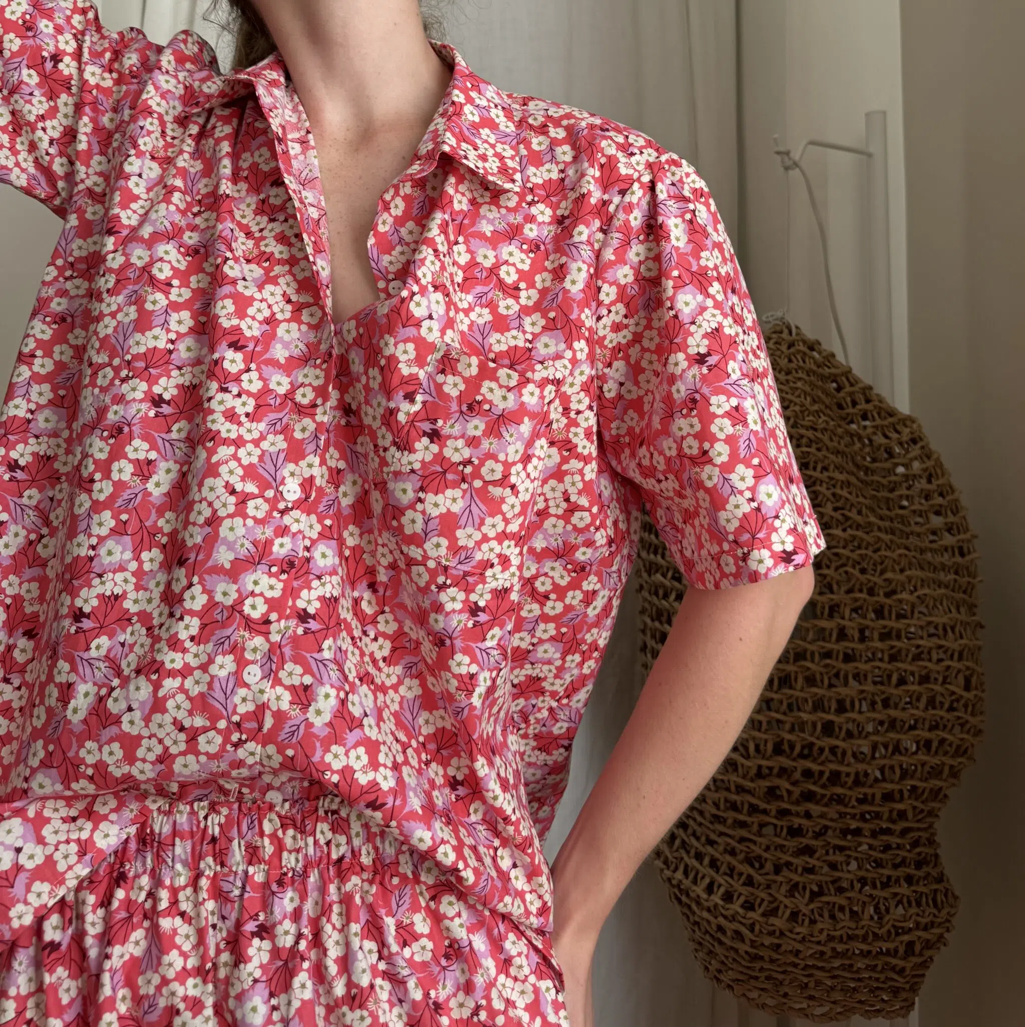 Chemisier « LUCIE » manches courtes en coton fleuri. Chemiser boutonné, col, petite poche, fentes sur les côtés, fronces sur les épaules. PETITE ÉDITION