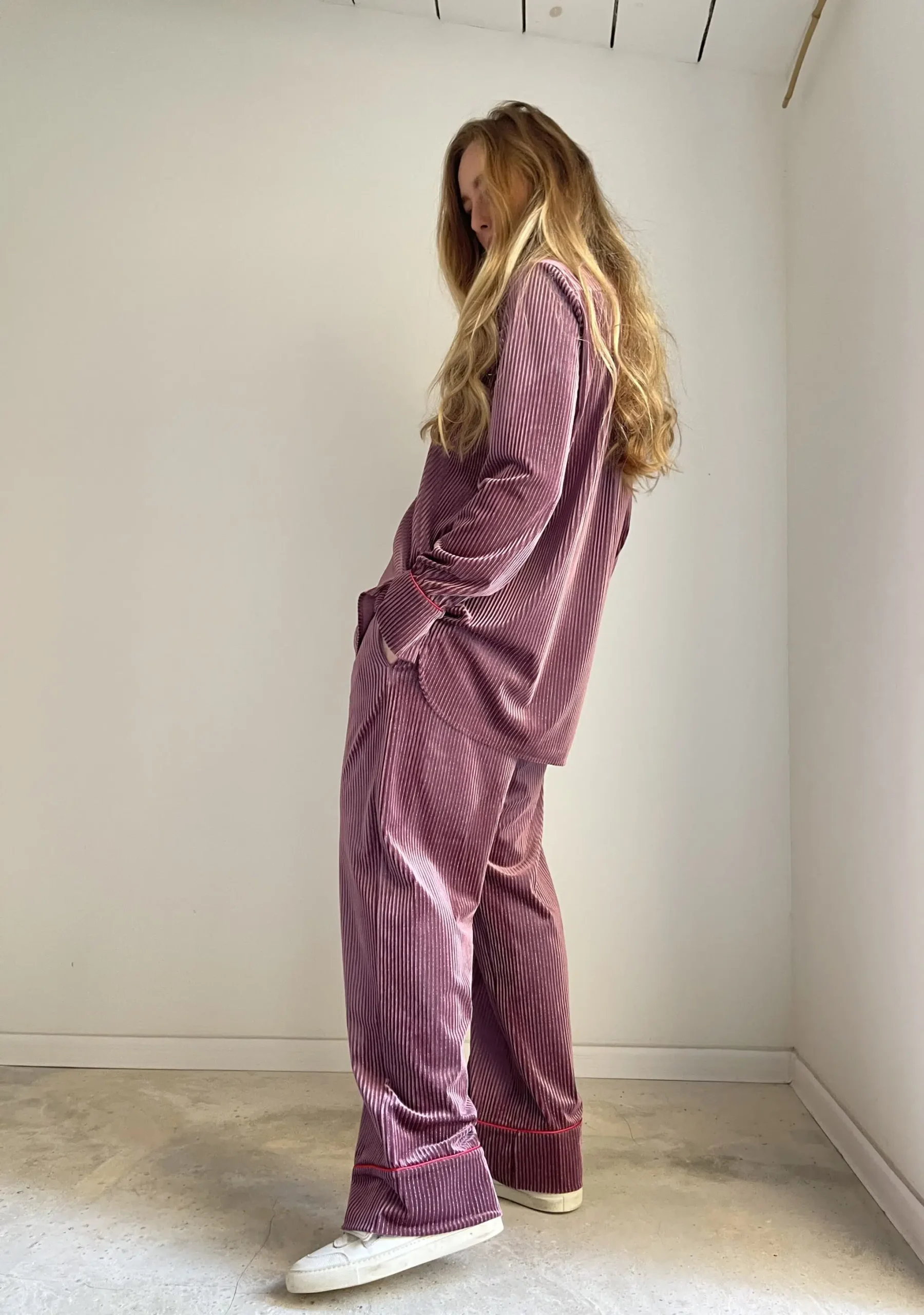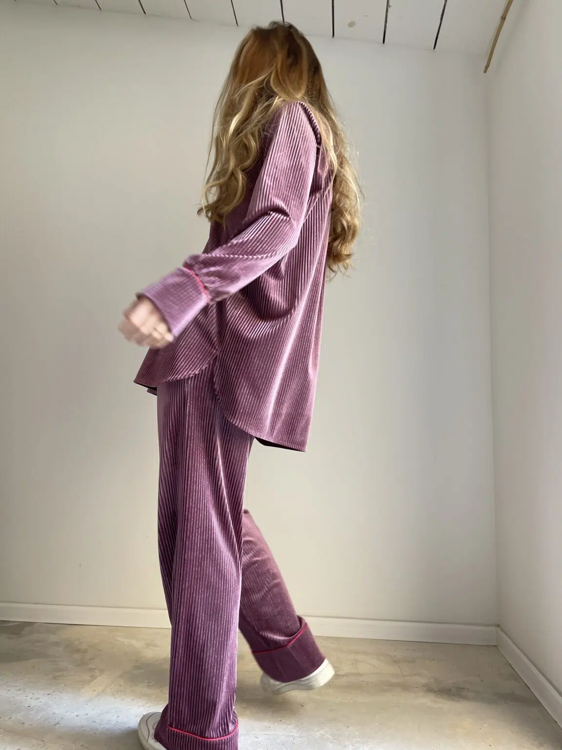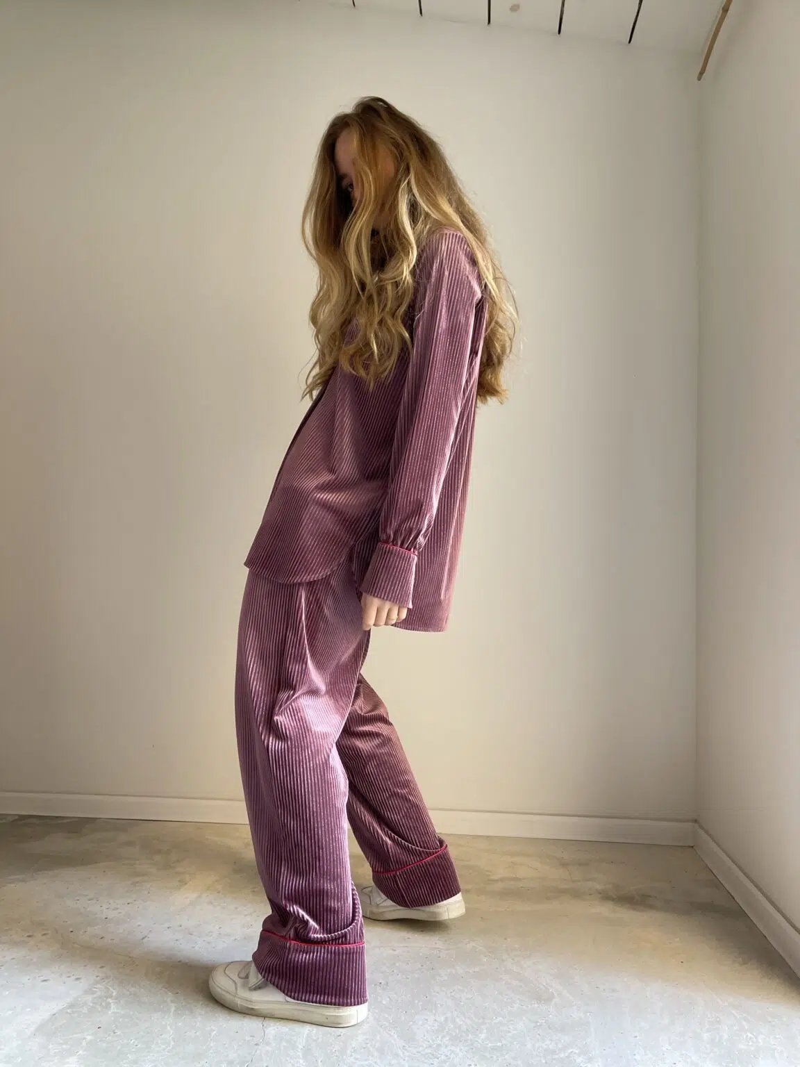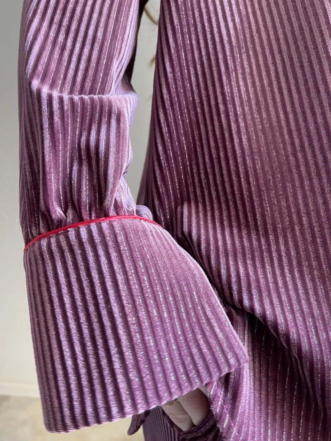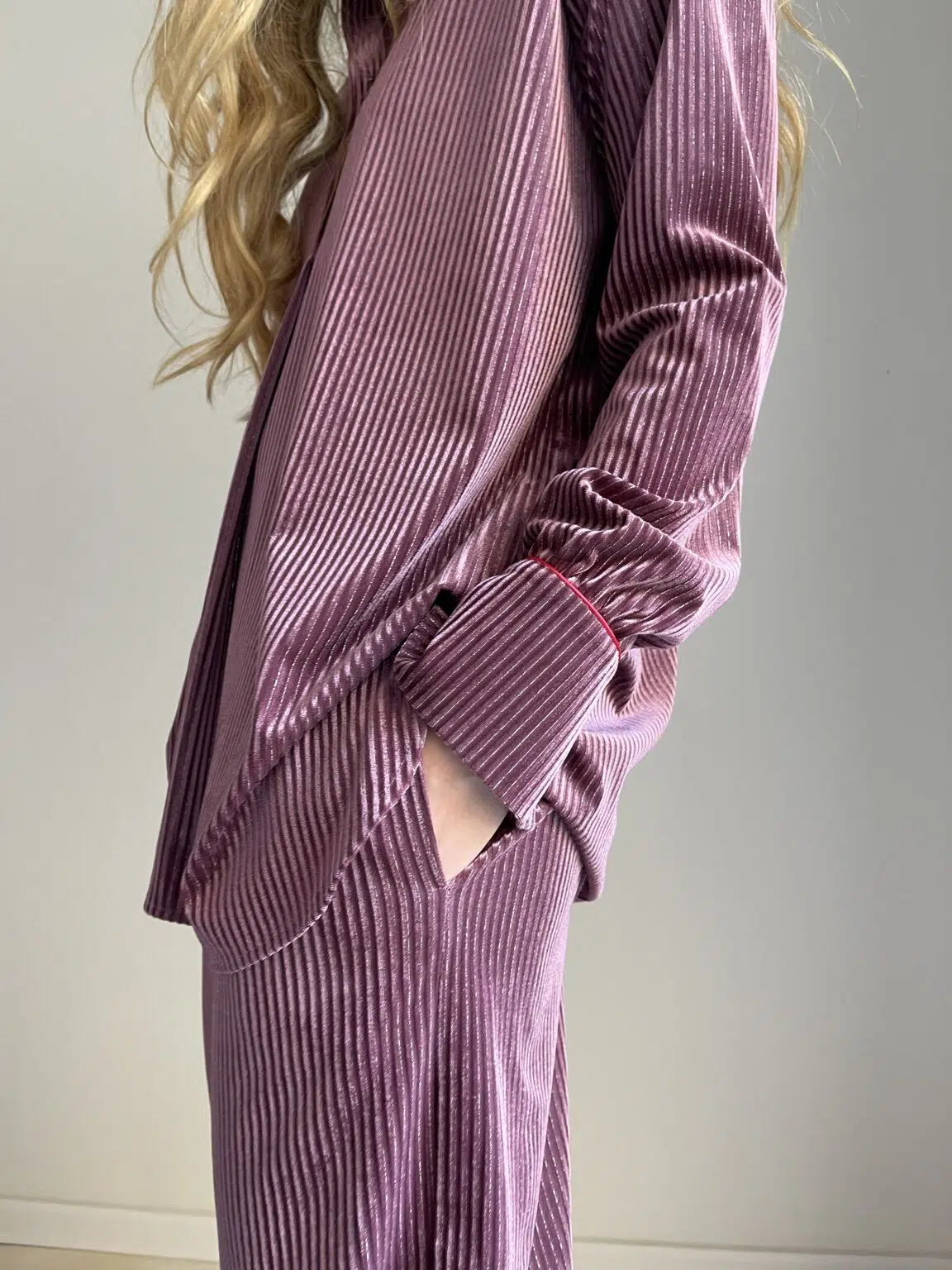 Chemisier en velours fils lurex, col et poignets à pression, poignets soulignés de passe poils rouge. Une coupe loose et minimaliste pour un chemisier unique et élégant.
