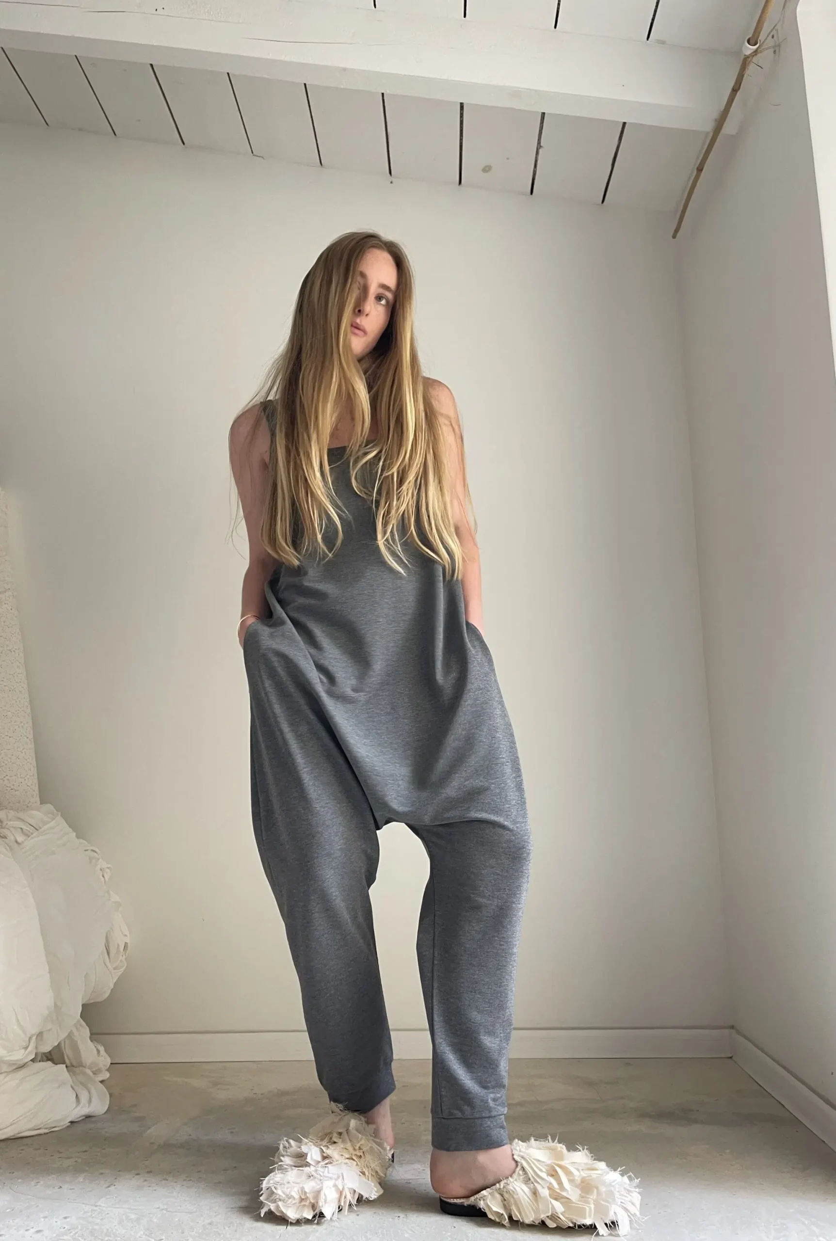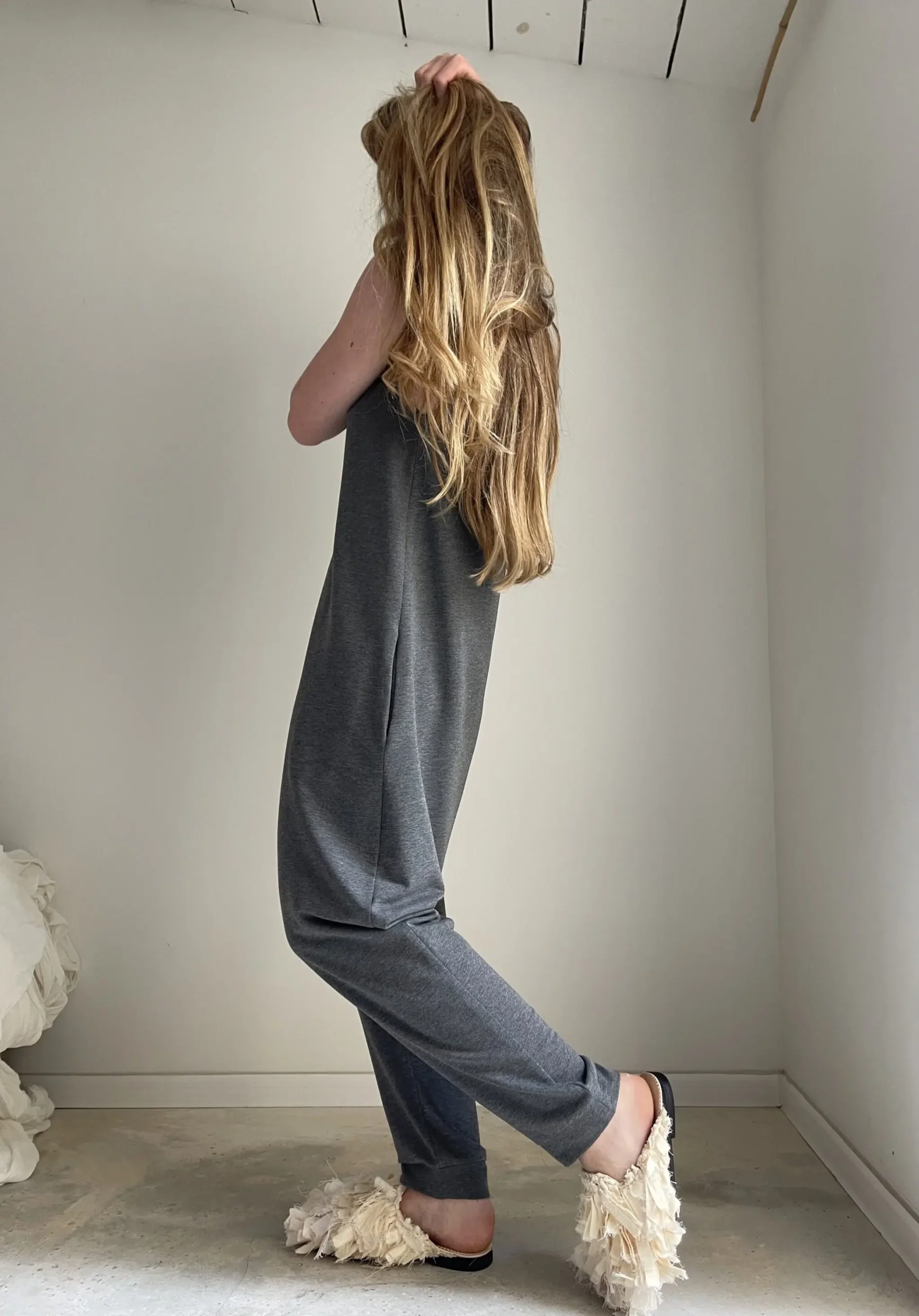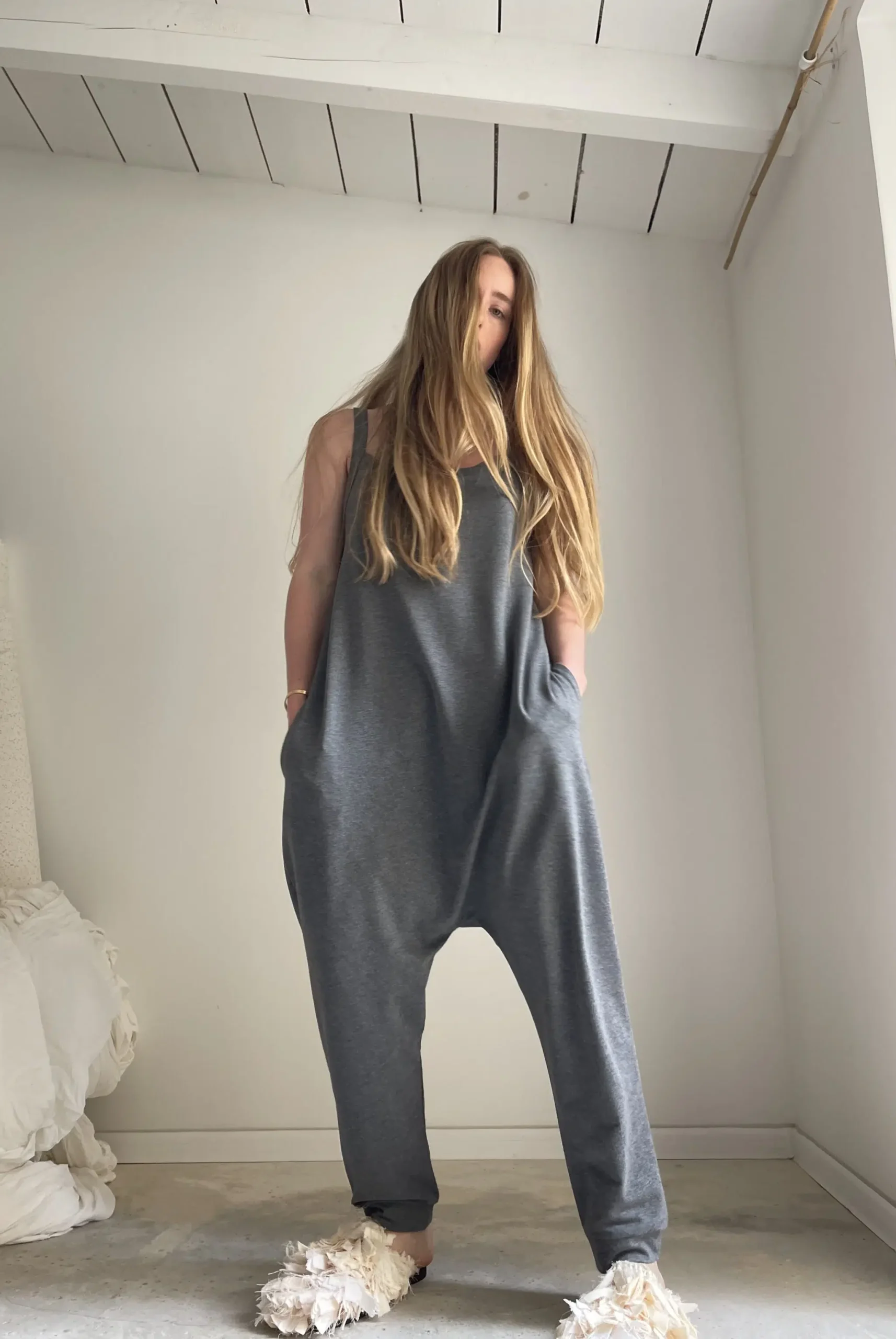 Combinaison « LILOU » en coton gris envers gratté. Poches latérales. Une coupe minimaliste. Une pièce stylée et confortable à porter. Petite édition.