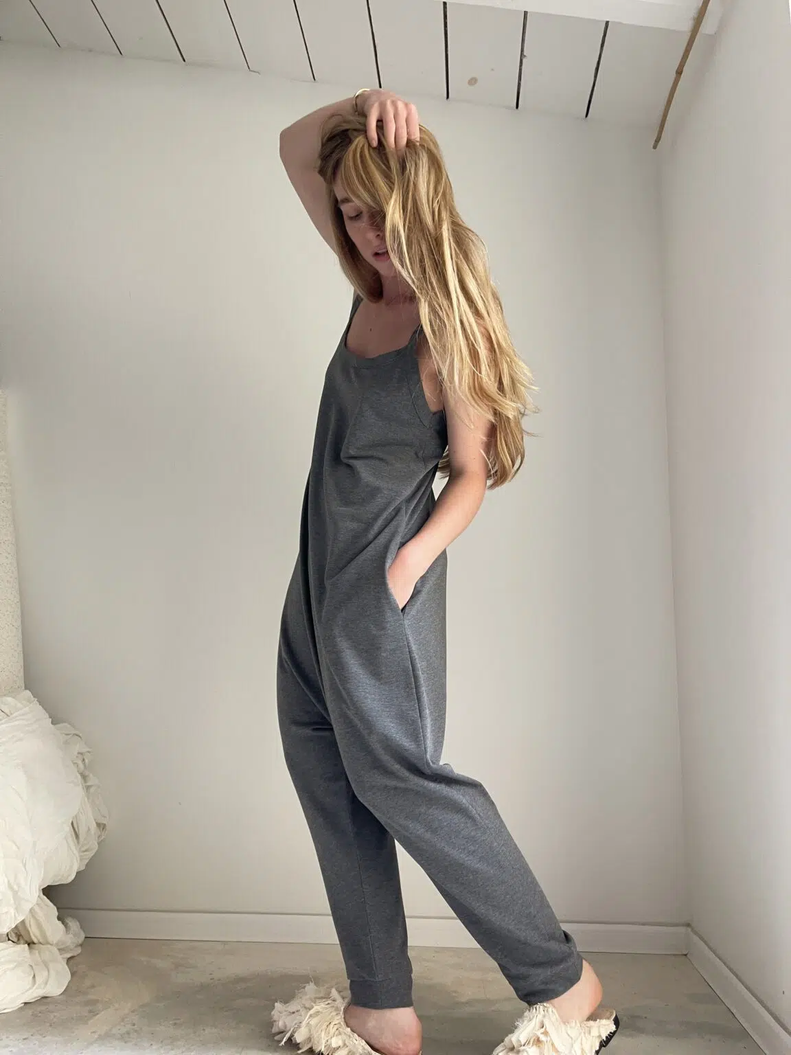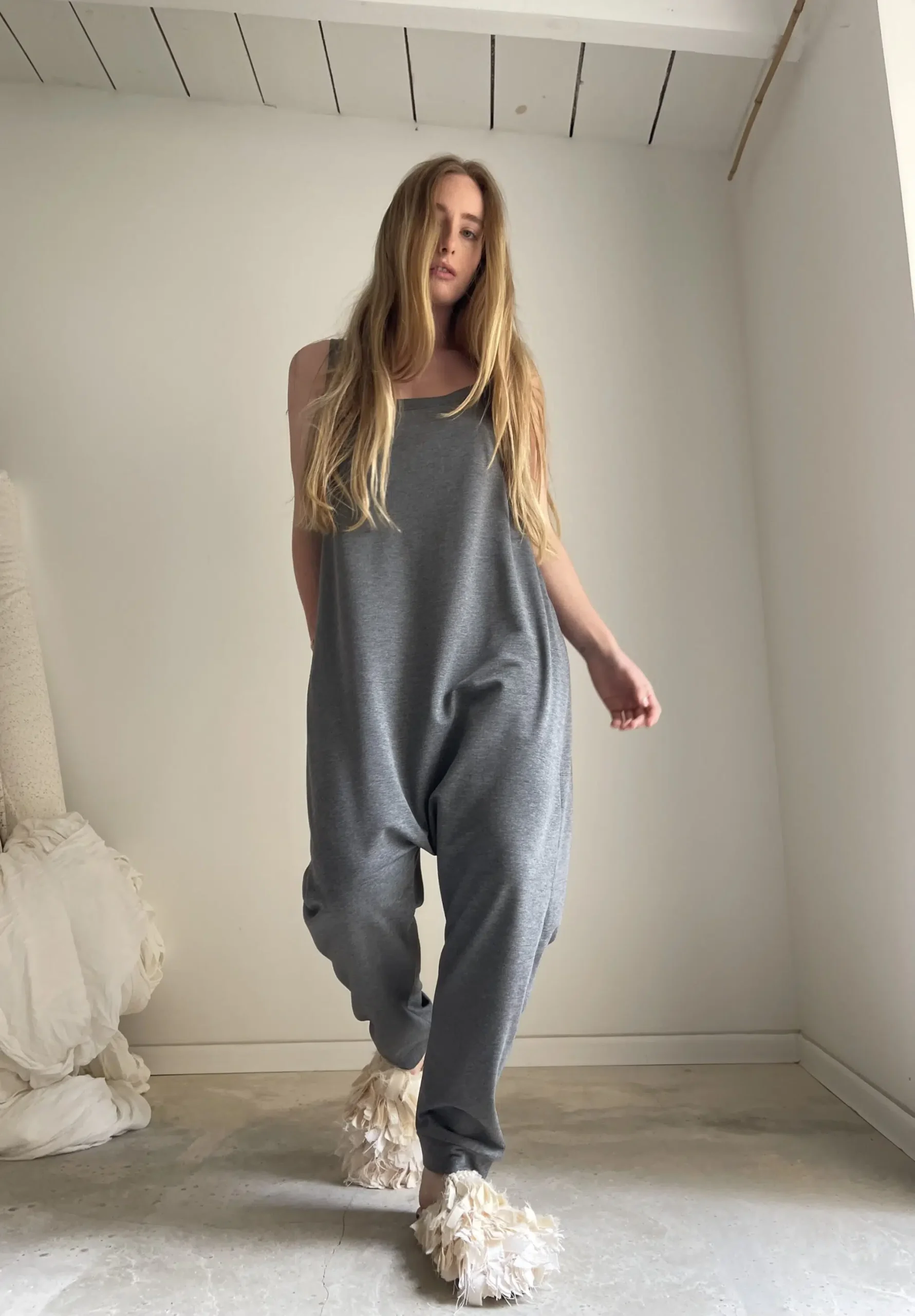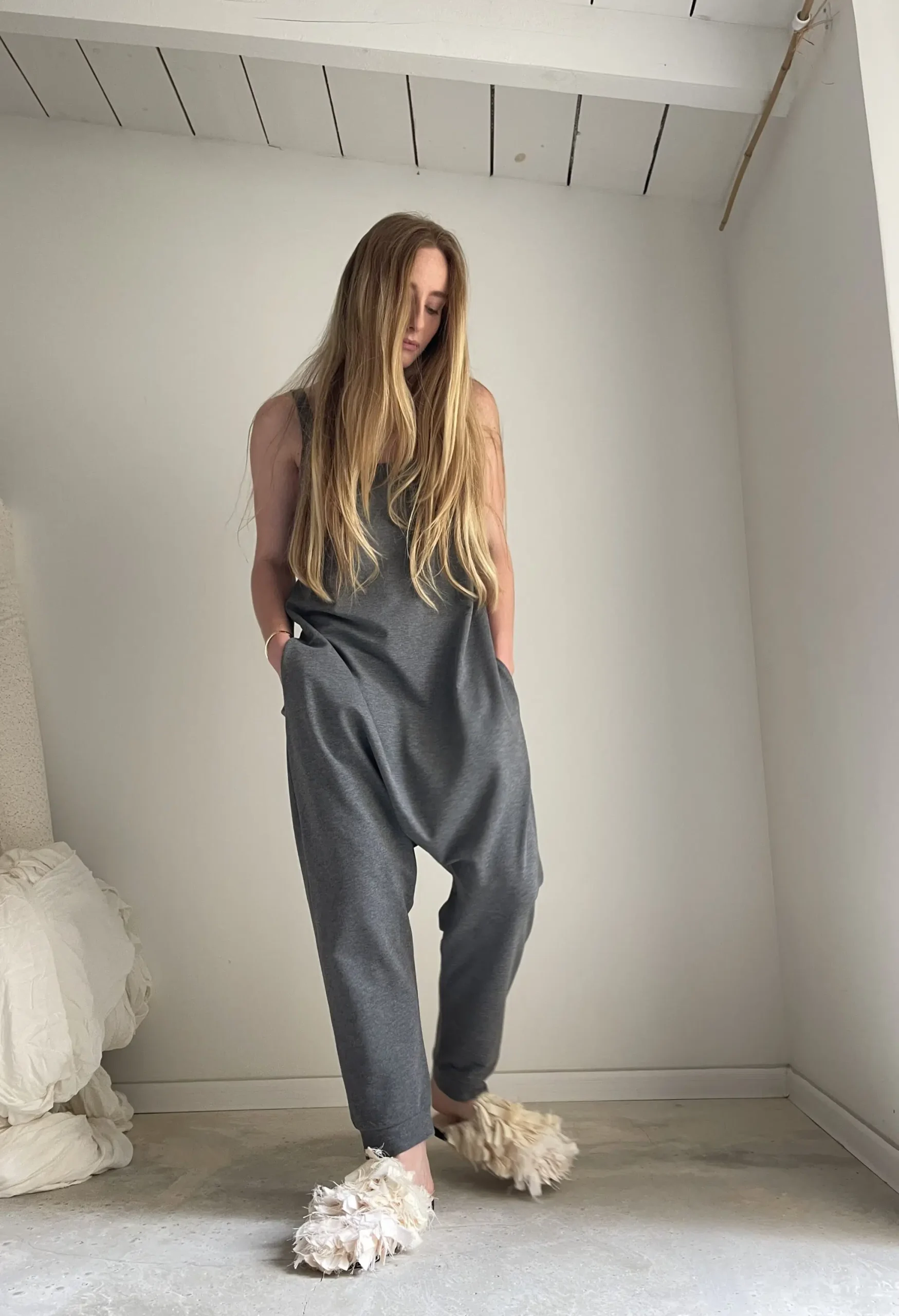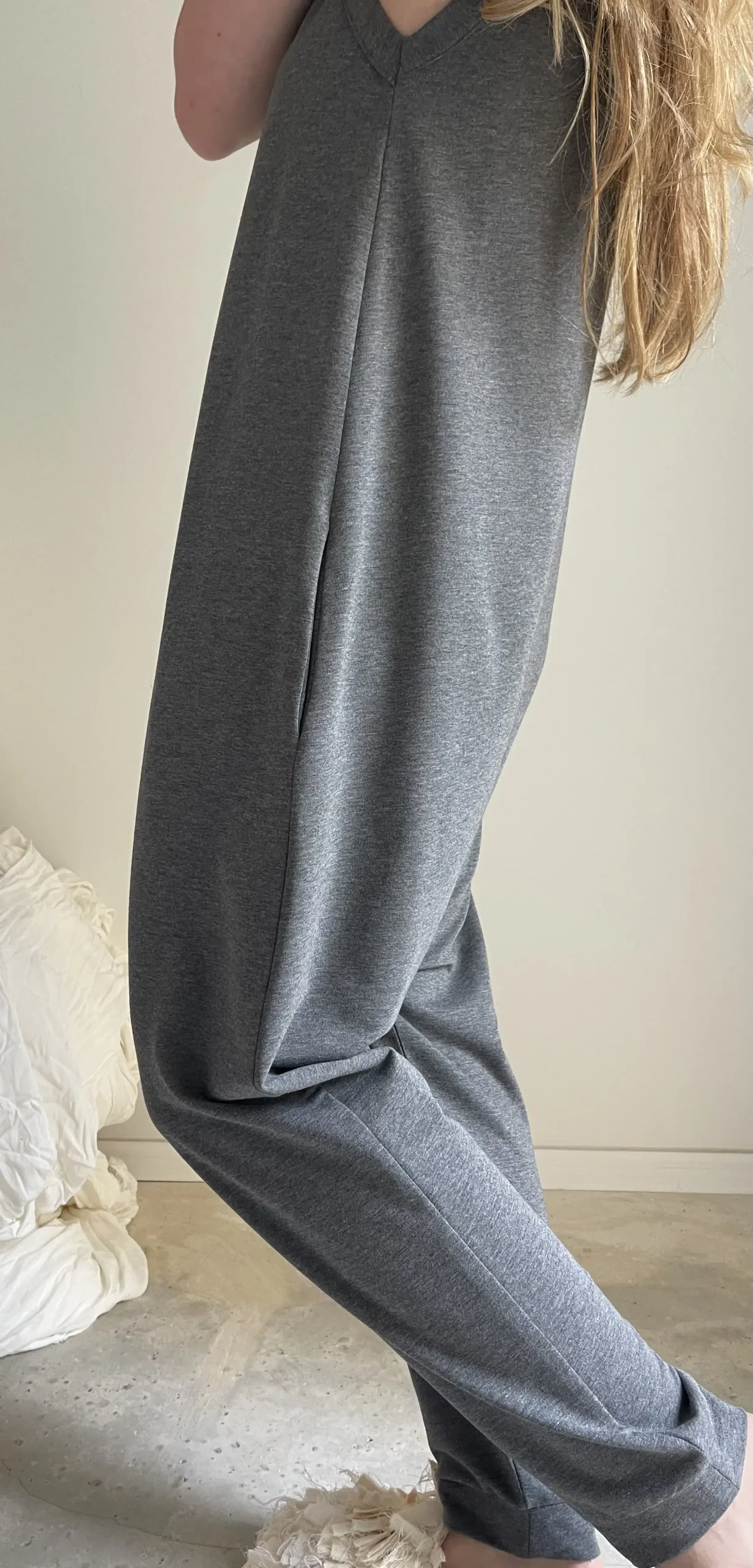 Combinaison « LILOU » en coton gris envers gratté. Poches latérales. Une coupe minimaliste. Une pièce stylée et confortable à porter. Petite édition.