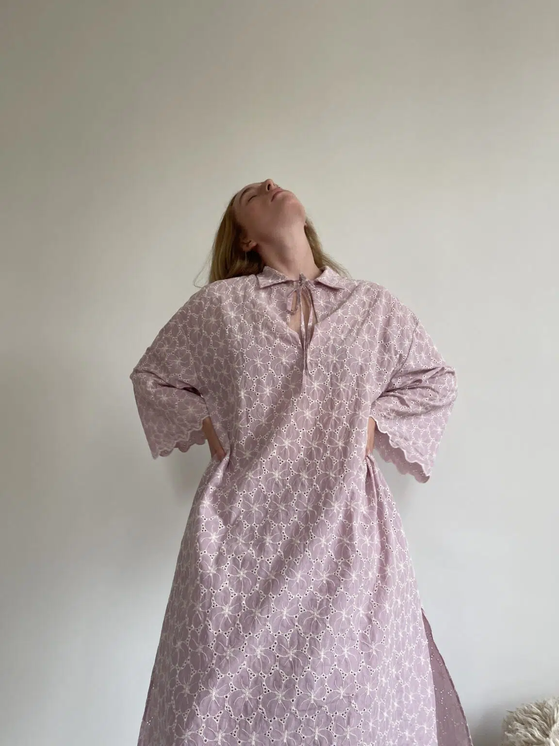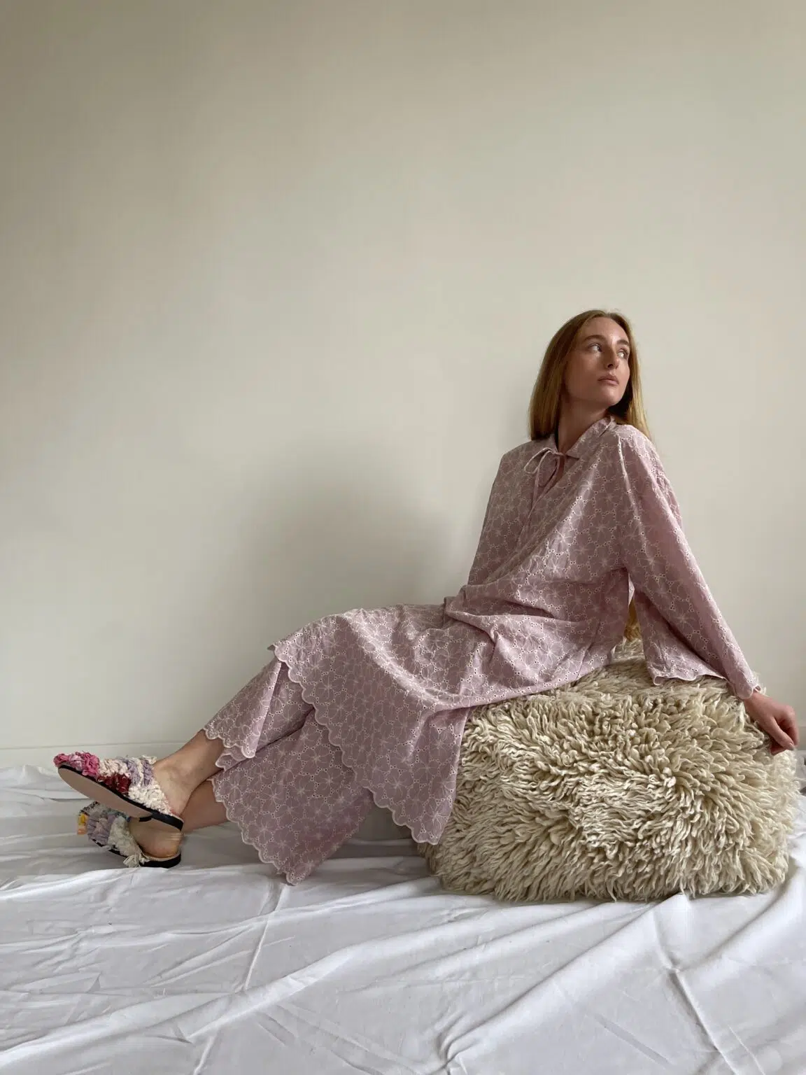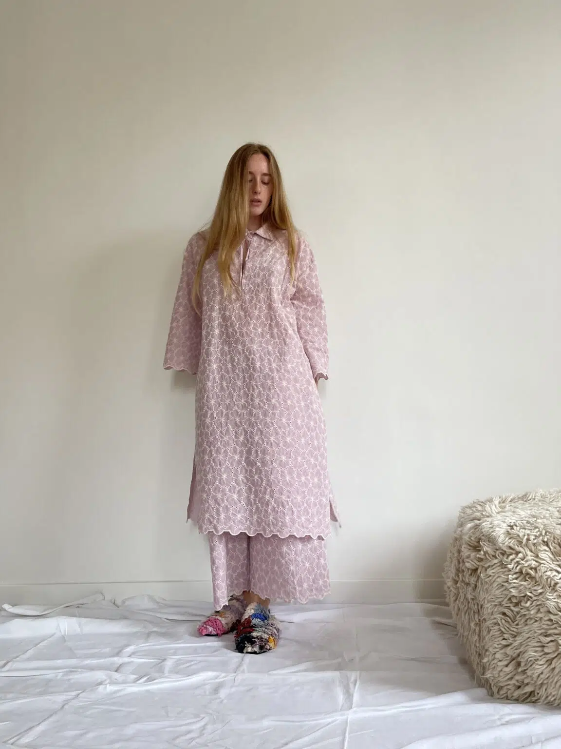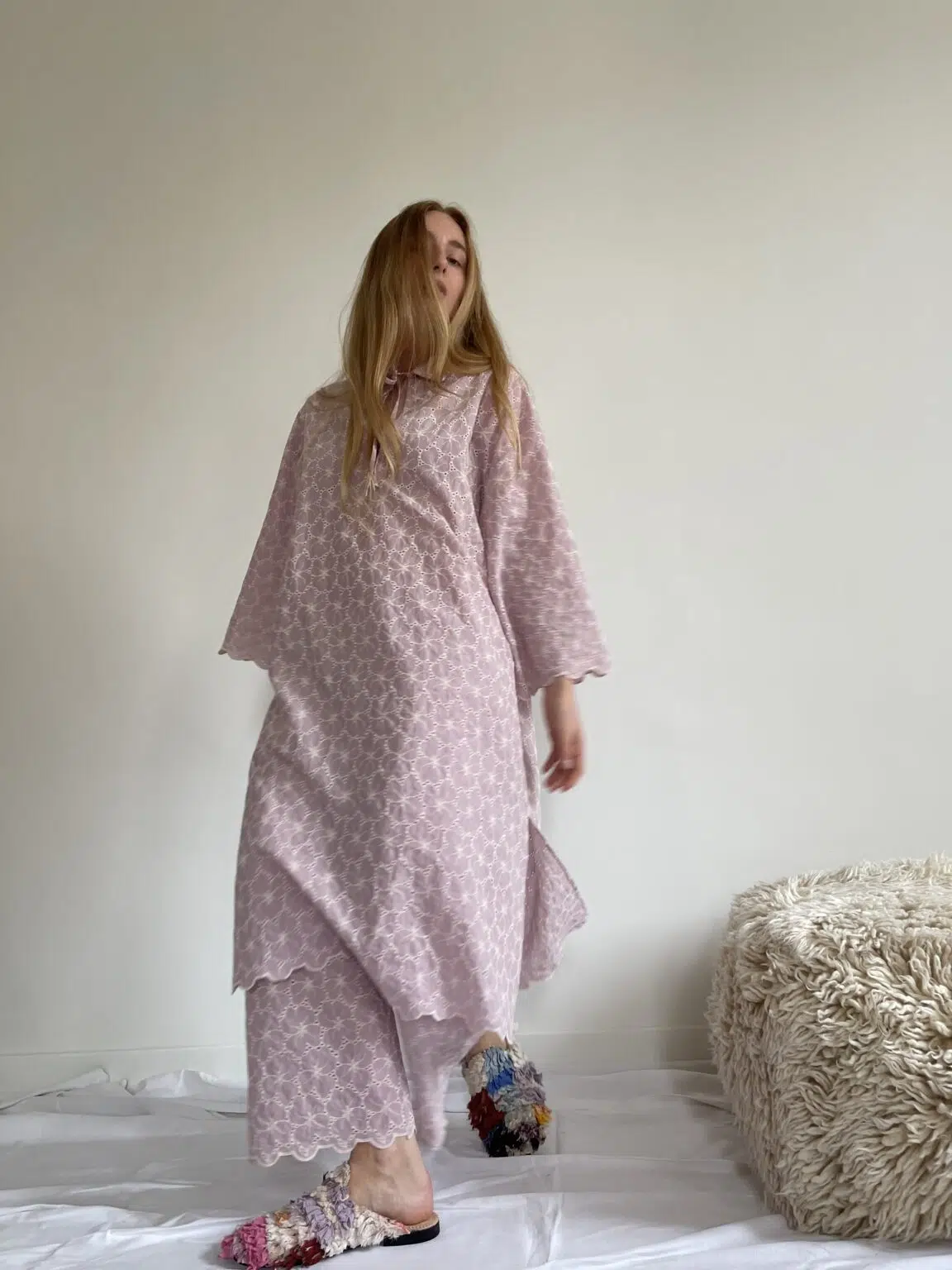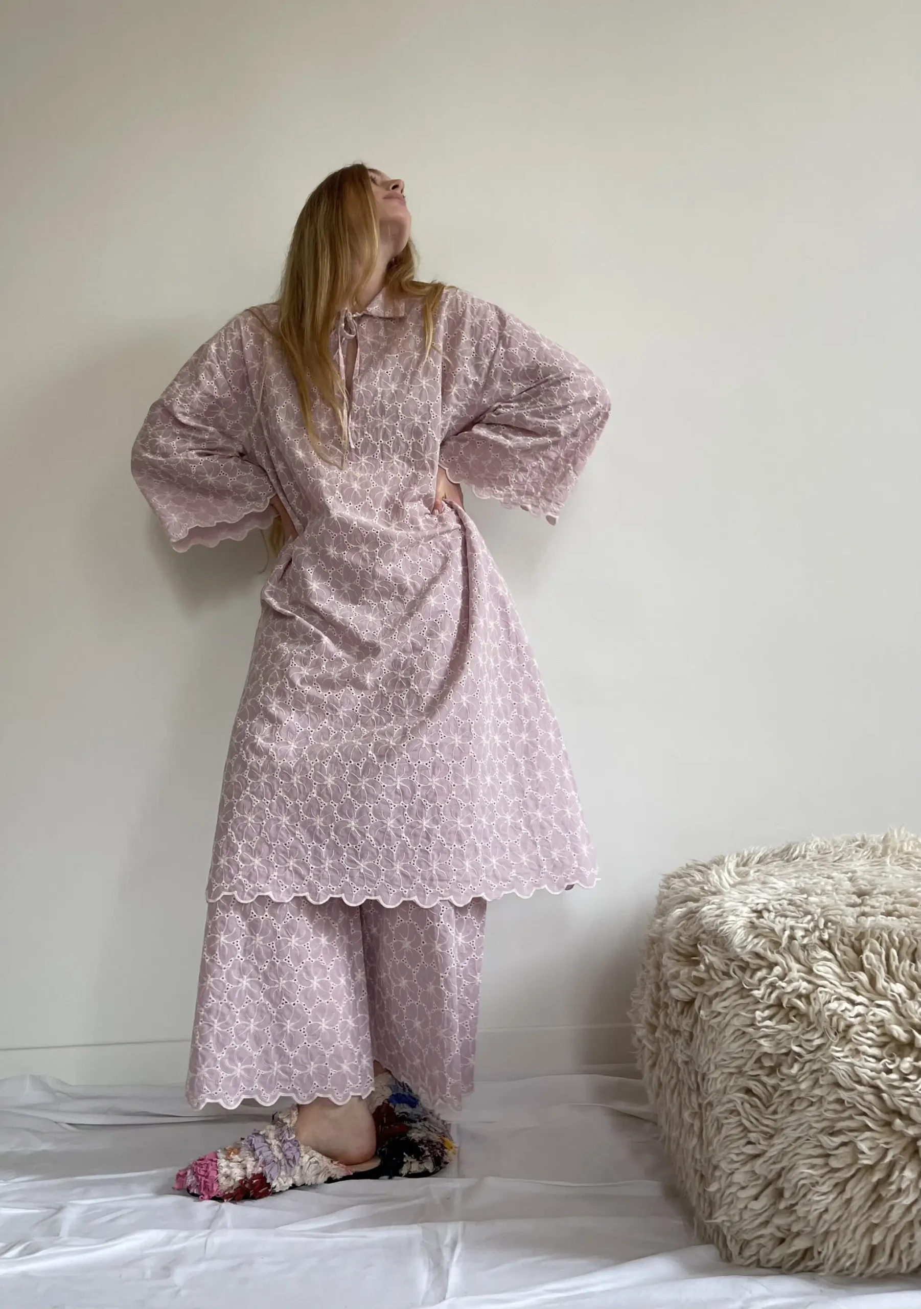 Ensemble « LÉONIE » en broderie anglaise couleur bubblegum pink. Blouse avec petit col et décolleté en goutte d’eau, poches latérales, ouverture sur les côtés en bas de blouse. Pantalon sur taille élastiquée, poches latérales, coupe droite. Un ensemble élégant et stylé.