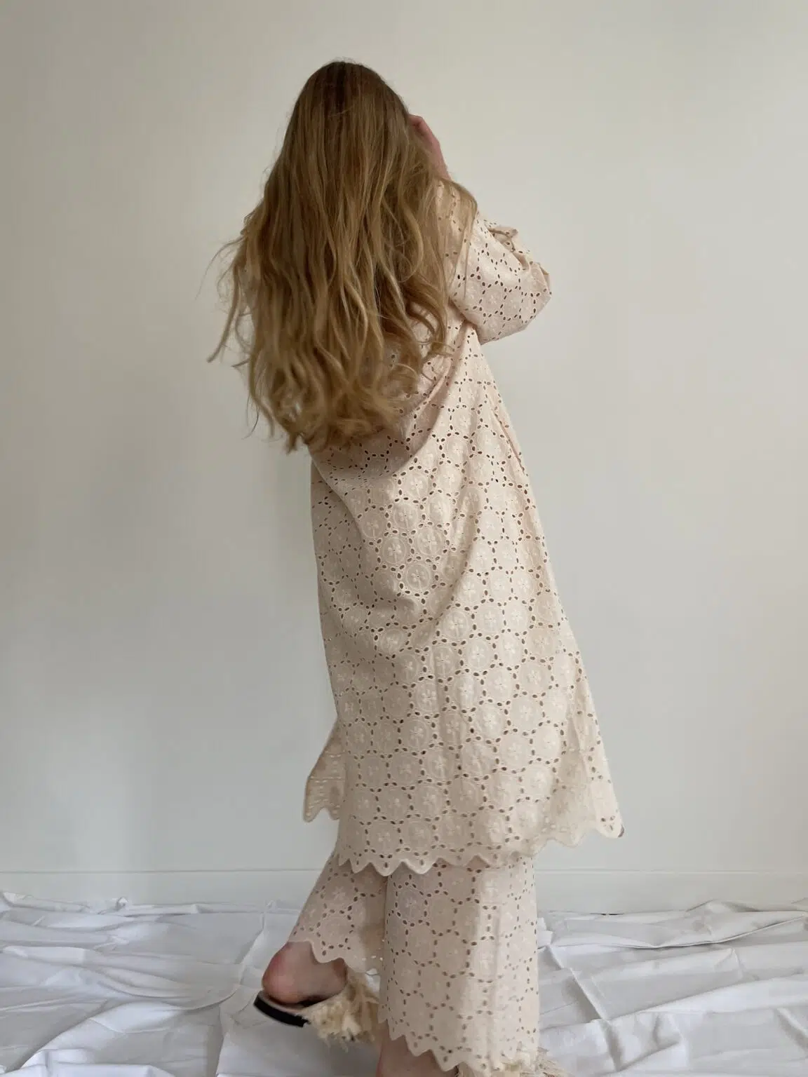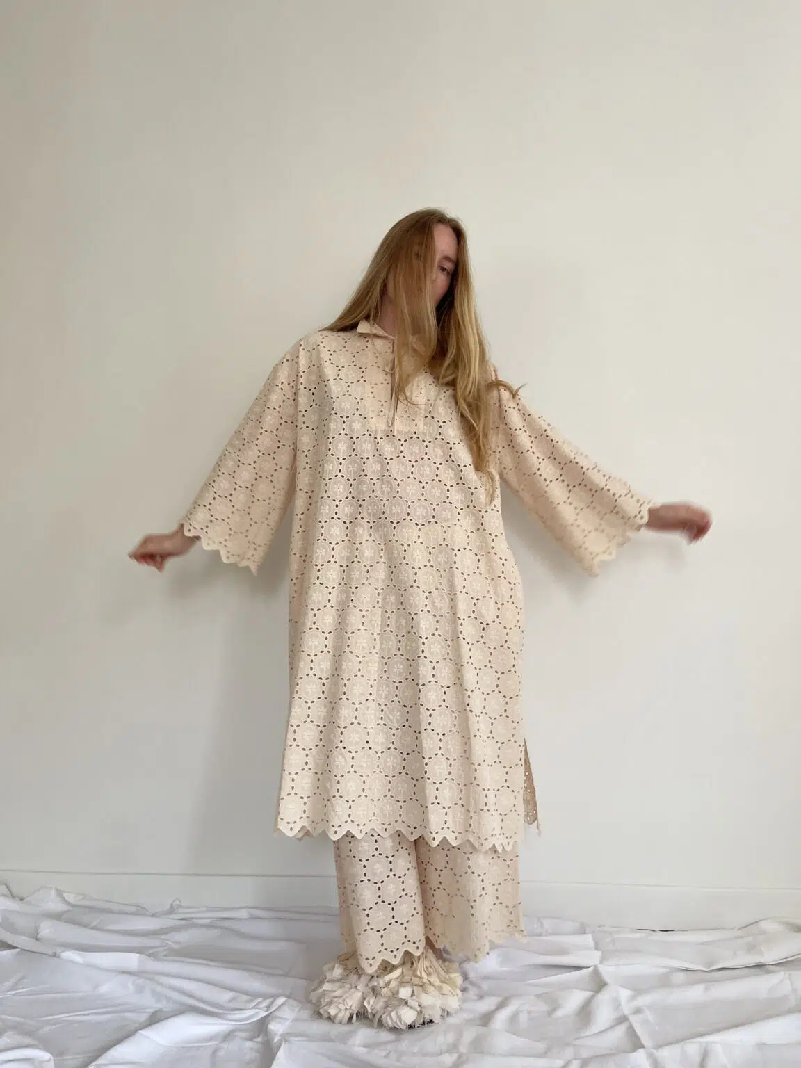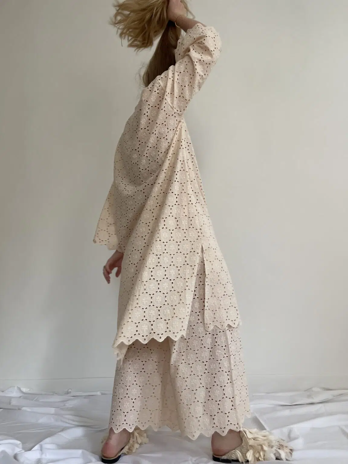 Ensemble « LÉONIE » en broderie anglaise écru. Blouse avec petit col et décolleté en goutte d’eau, poches latérales, ouverture sur les côtés en bas de blouse. Pantalon sur taille élastiquée, poches latérales, coupe droite. Un ensemble élégant et stylé.