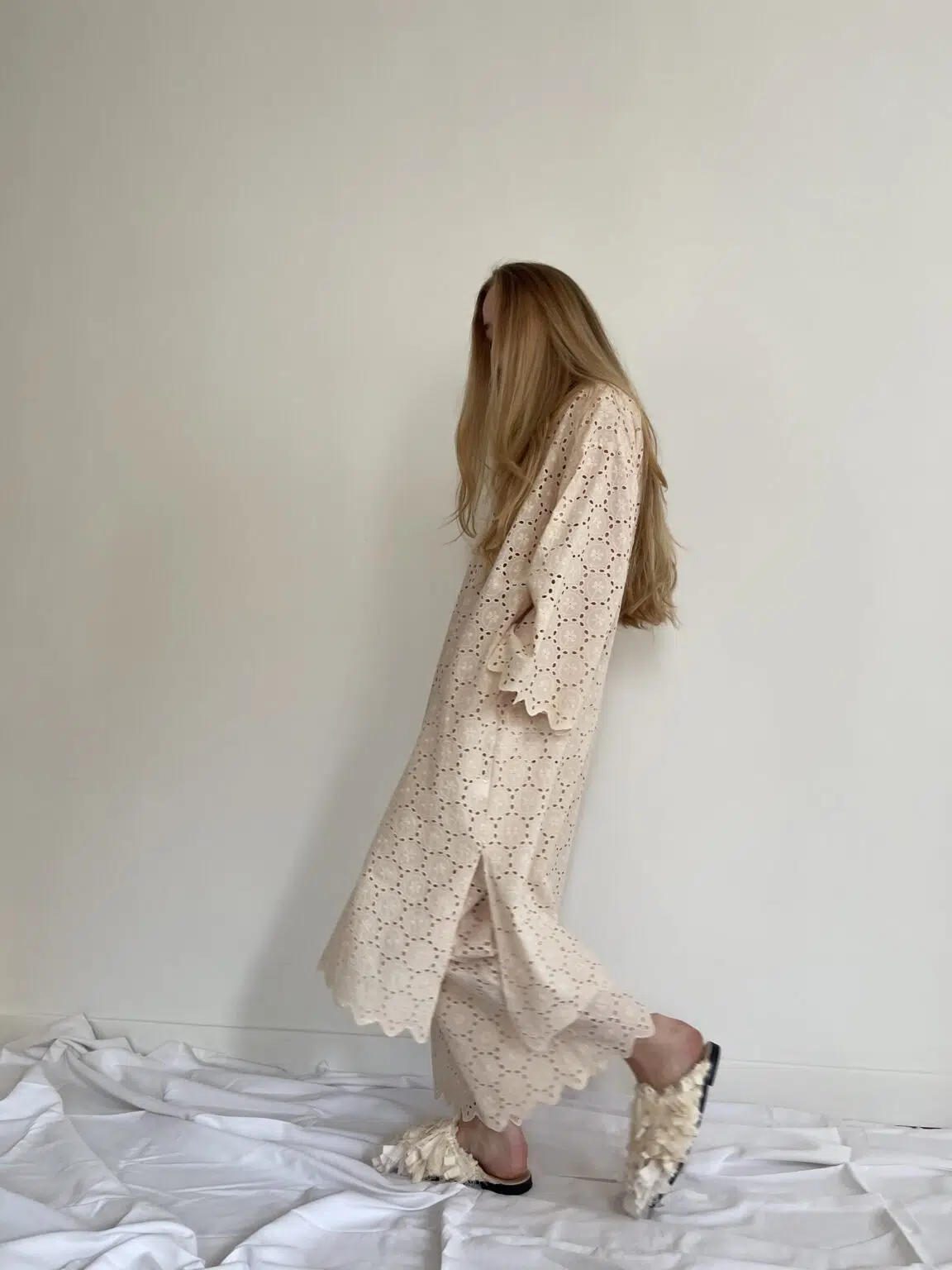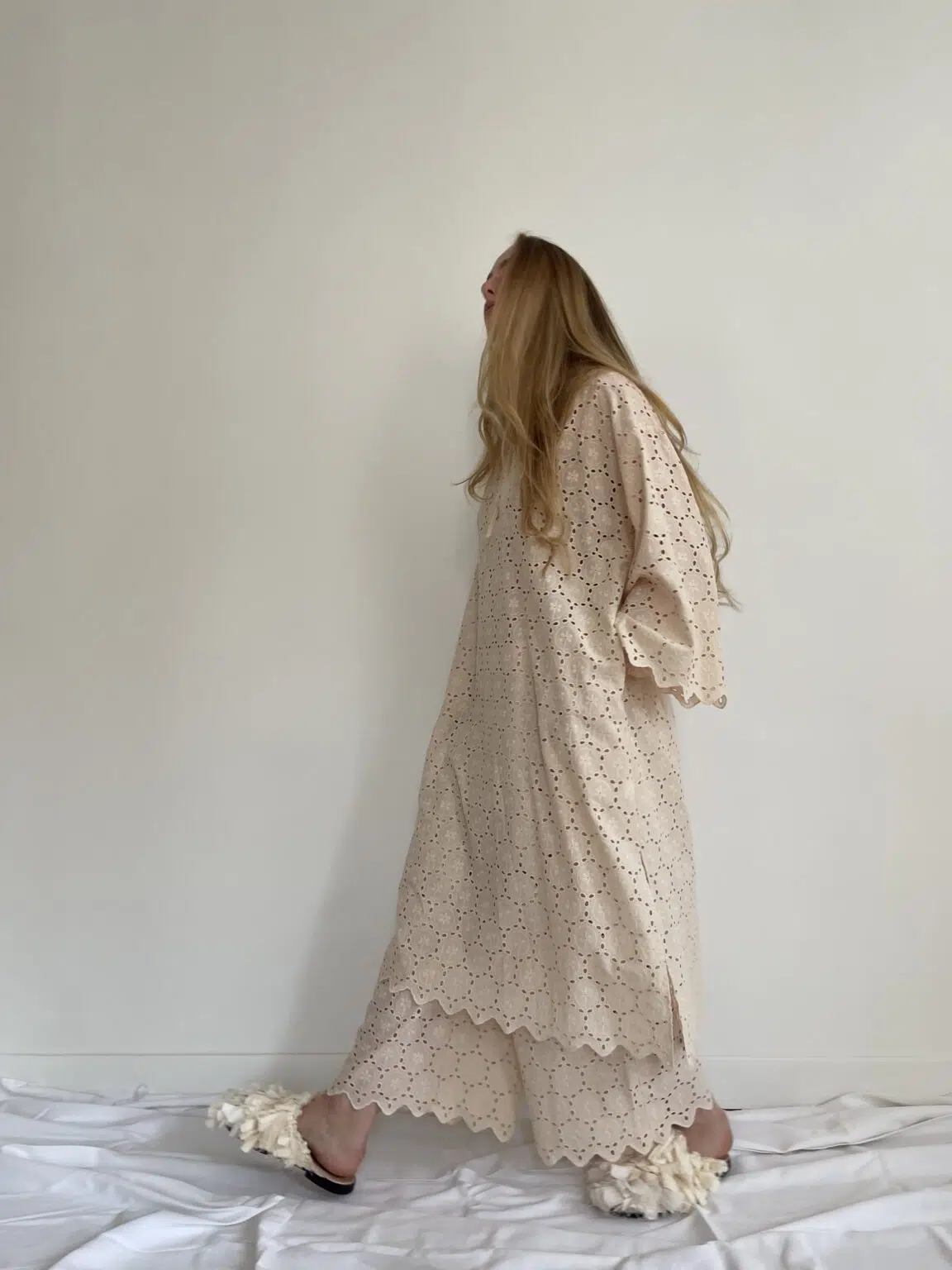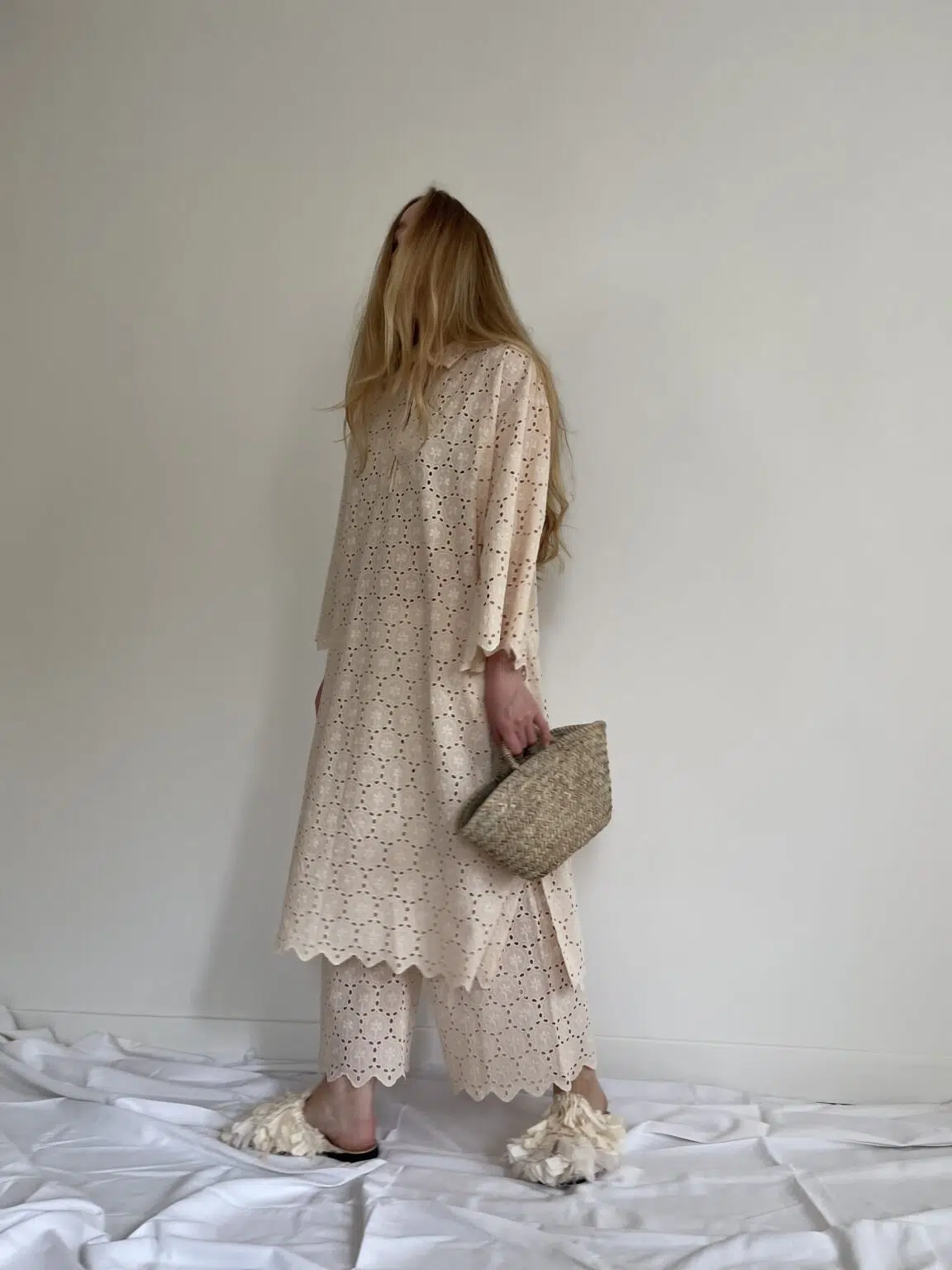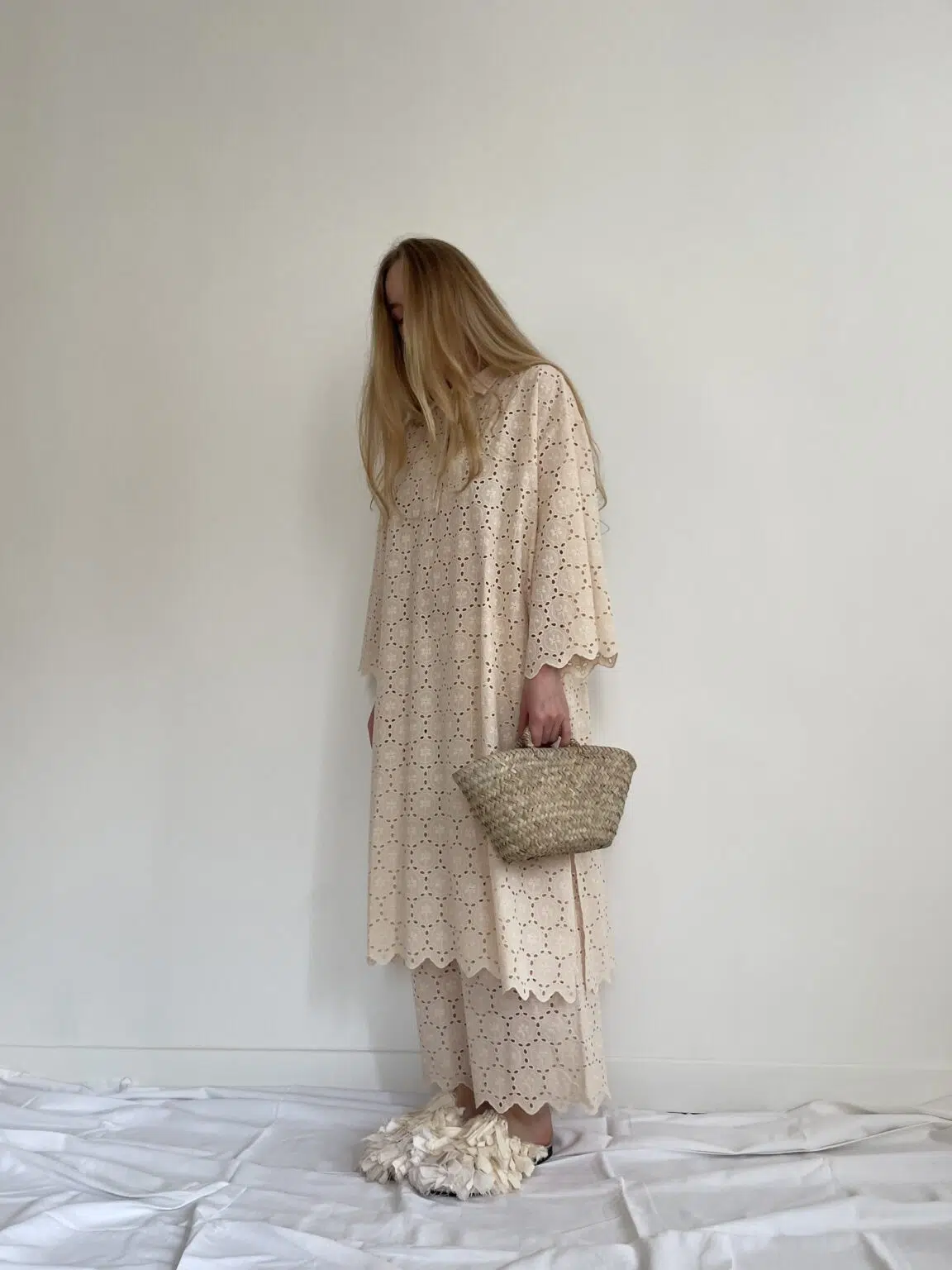 Ensemble « LÉONIE » en broderie anglaise écru. Blouse avec petit col et décolleté en goutte d’eau, poches latérales, ouverture sur les côtés en bas de blouse. Pantalon sur taille élastiquée, poches latérales, coupe droite. Un ensemble élégant et stylé.