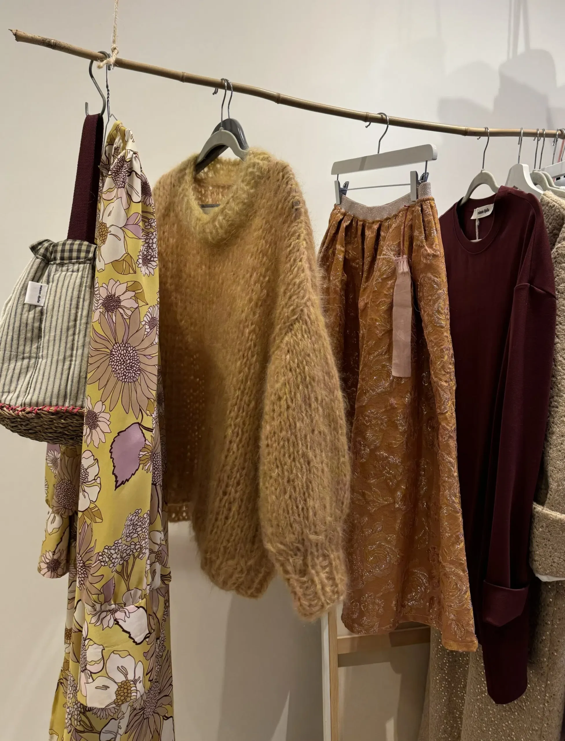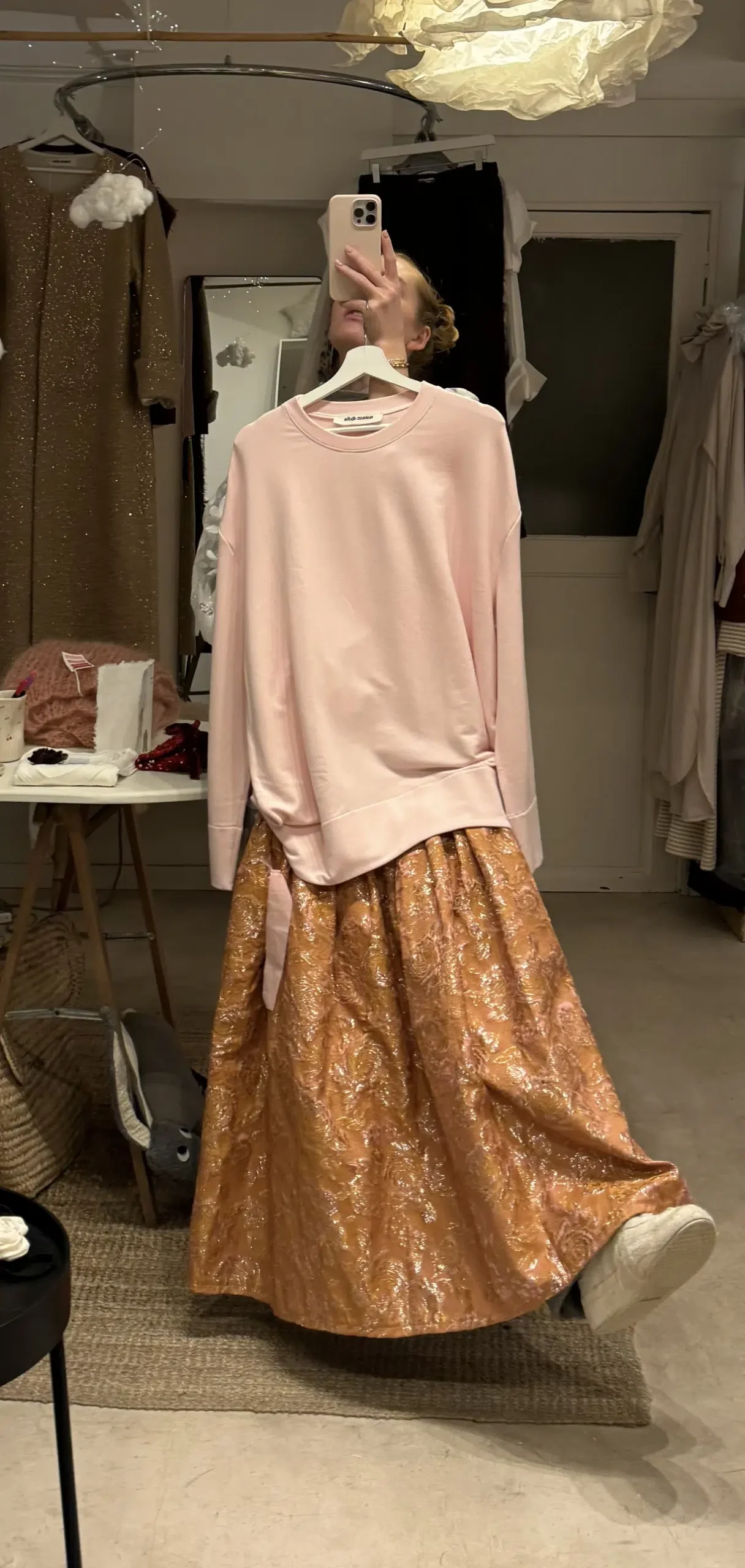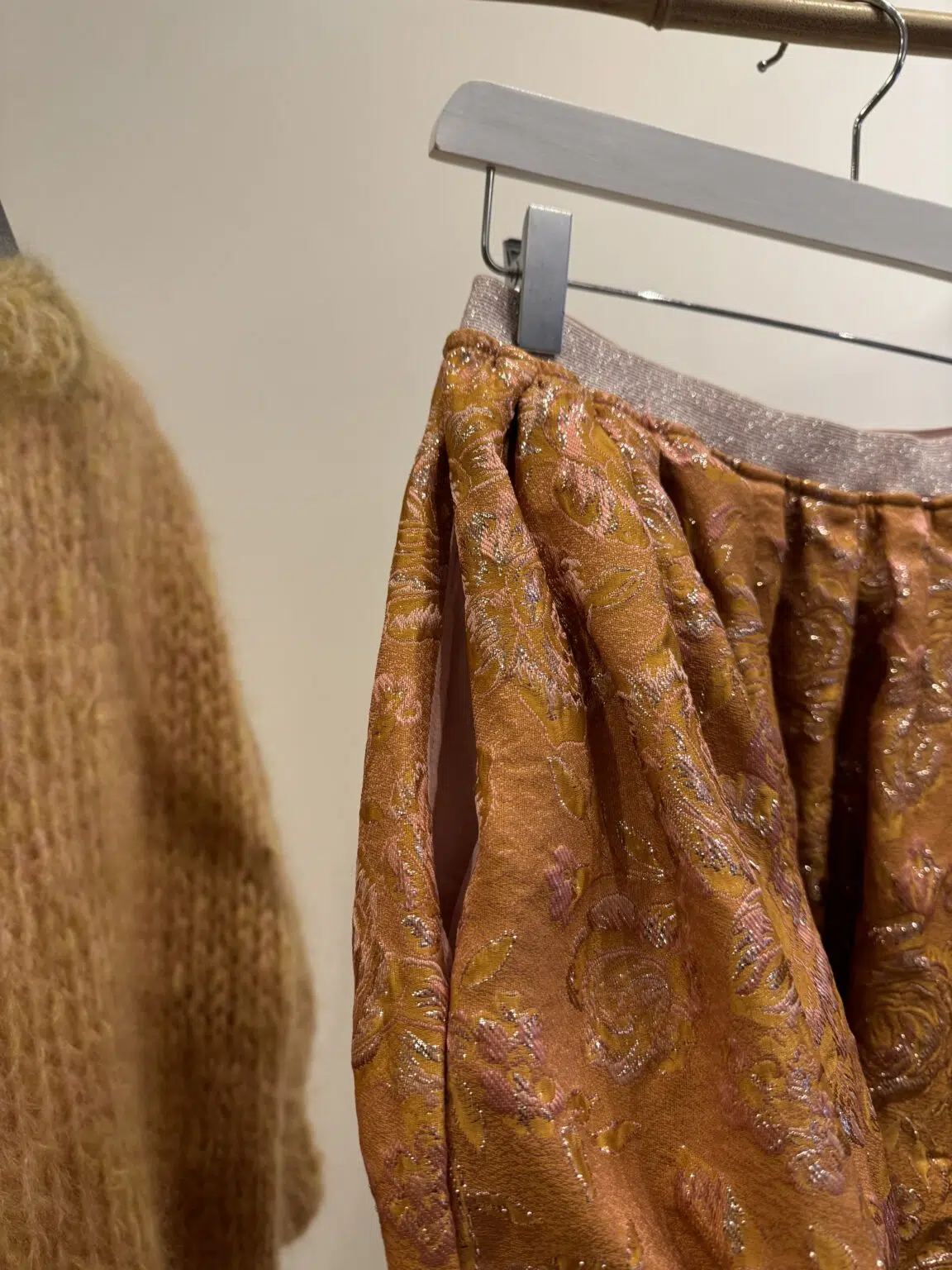 Jupe « AMBRE » en brocart de soie, fleurs coloris rose & orange. Taille sur élastique rose irisé apparent, poches latérales doublées en coton rose pâle. PIÈCE UNIQUE.