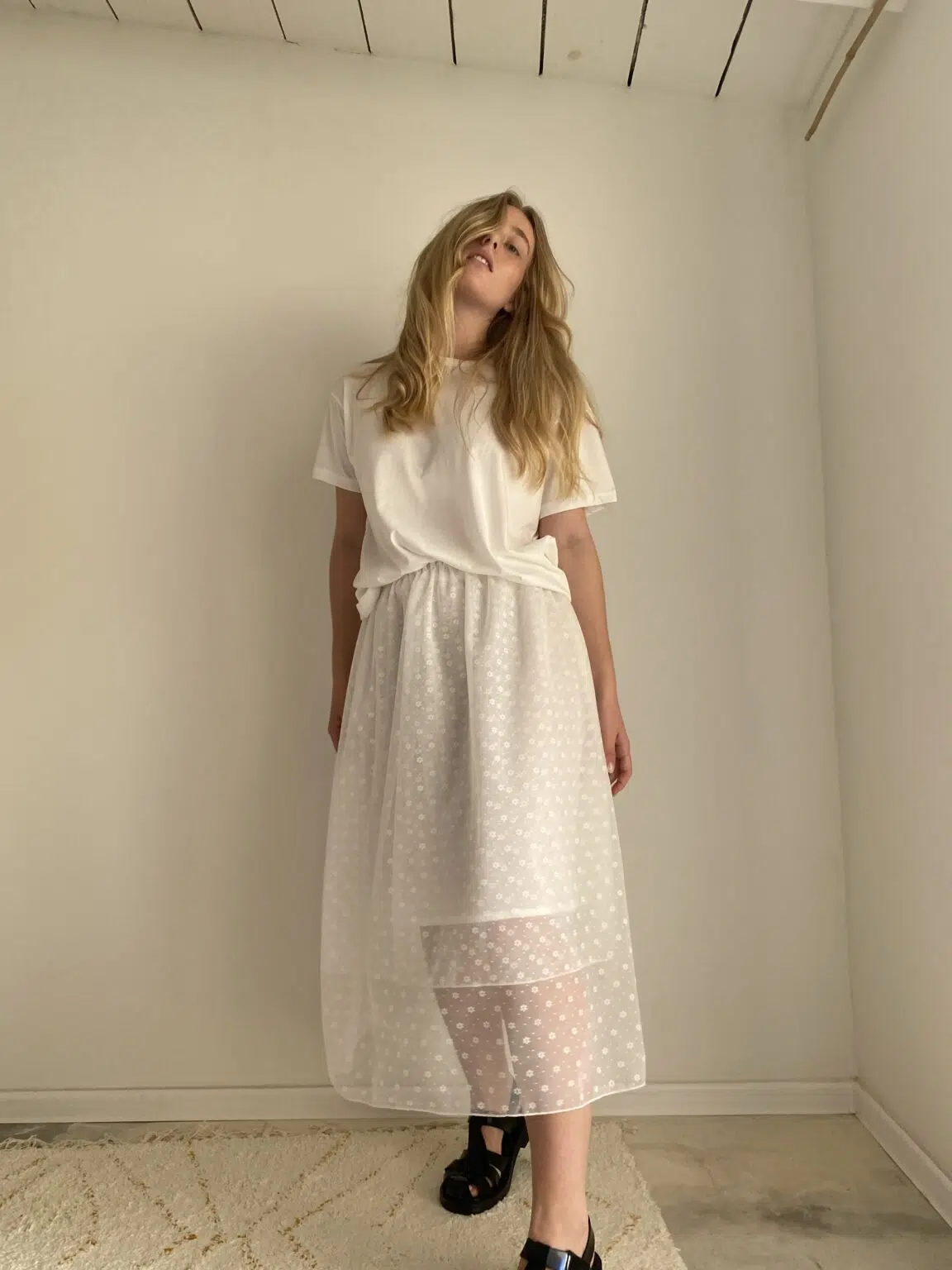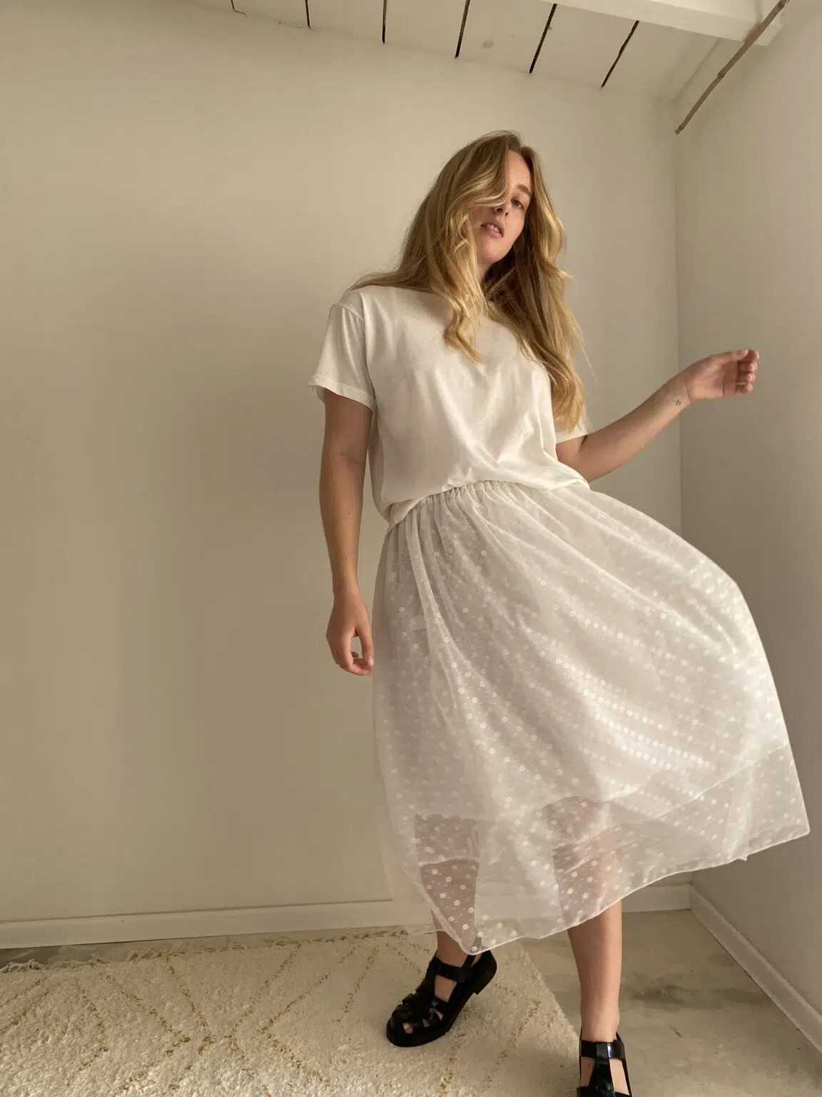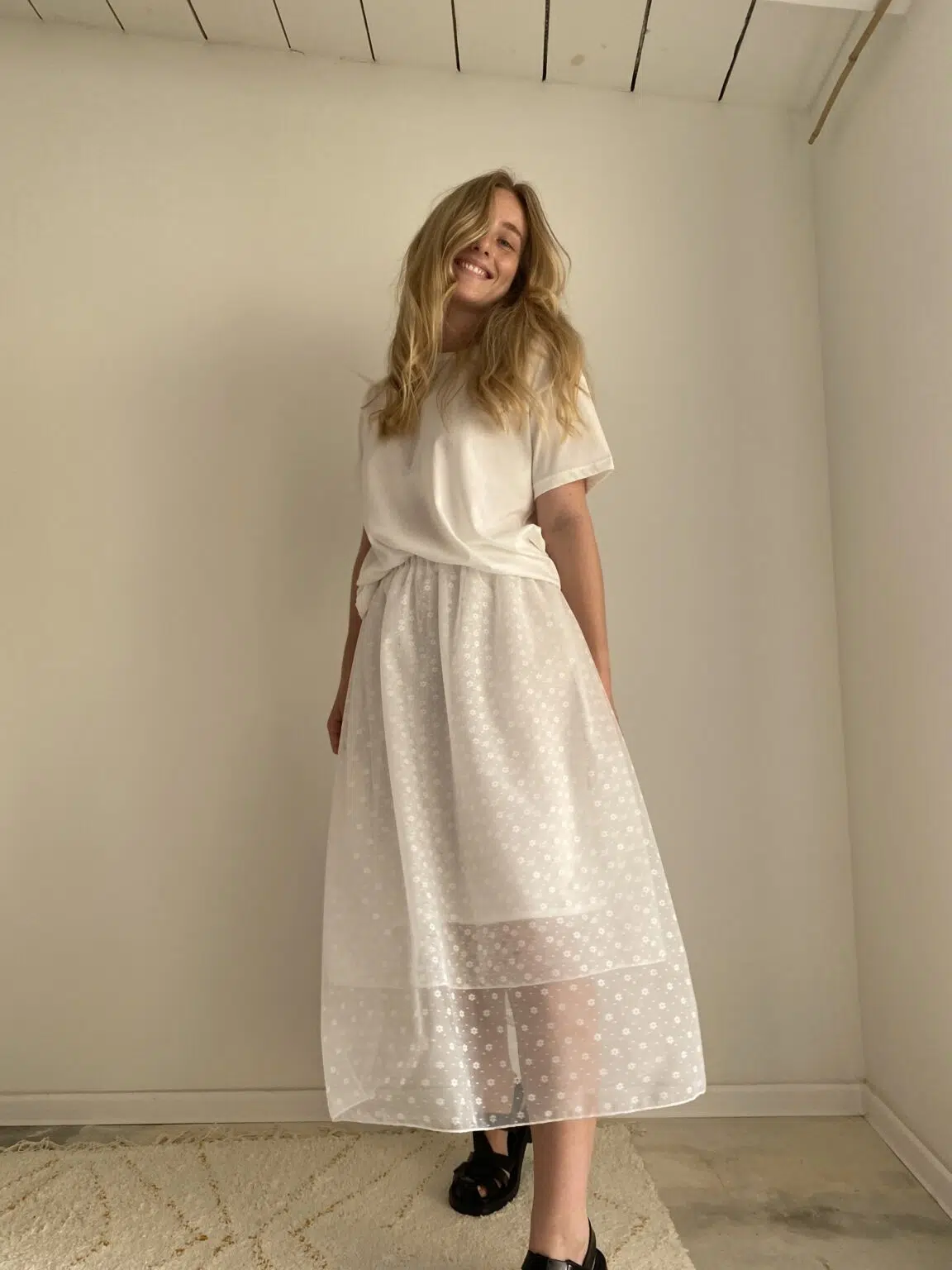 Jupe en tulle fleuri, style jupon, élastiquée à la taille, doublure en coton et soie, légèrement transparente.