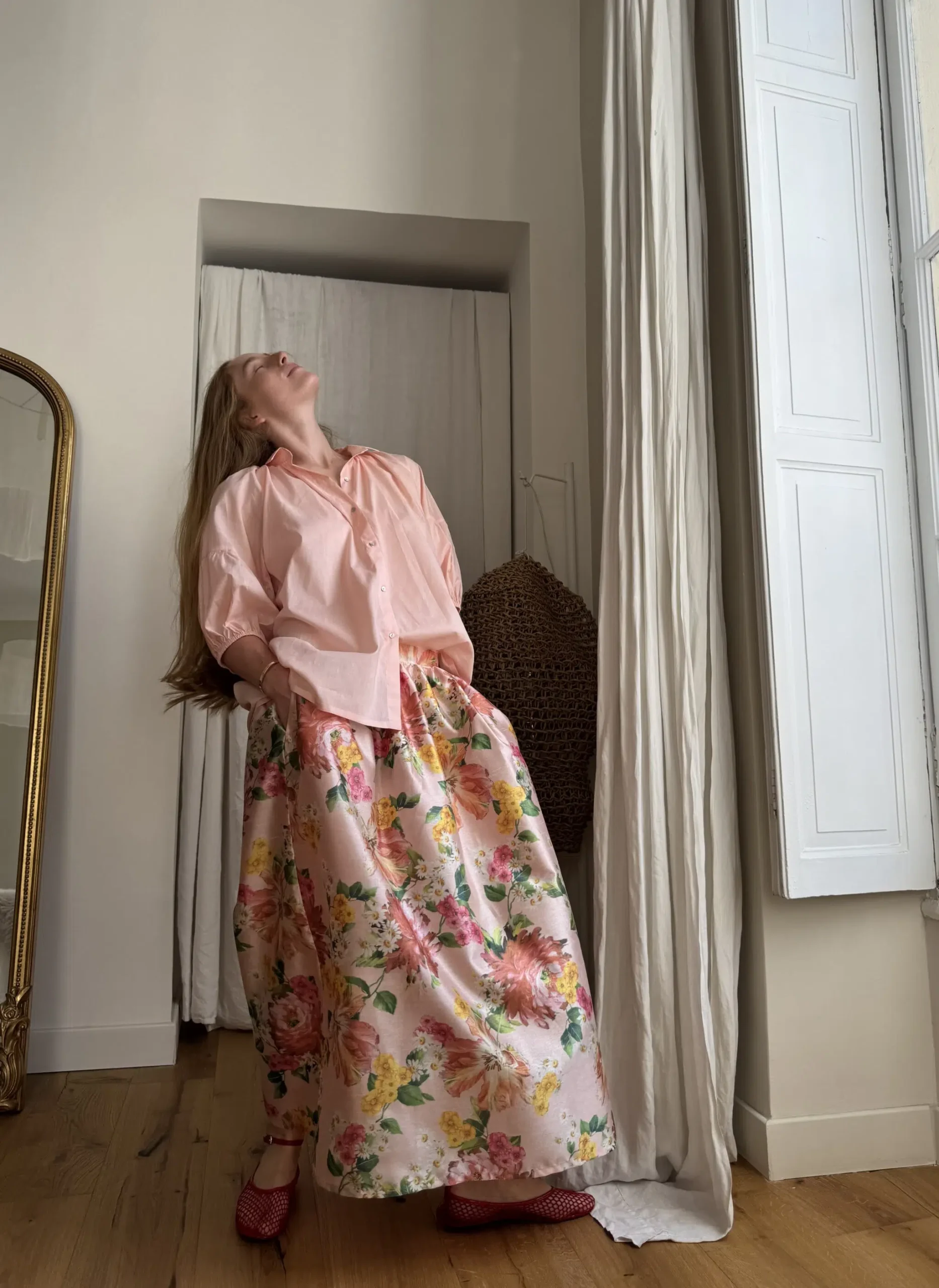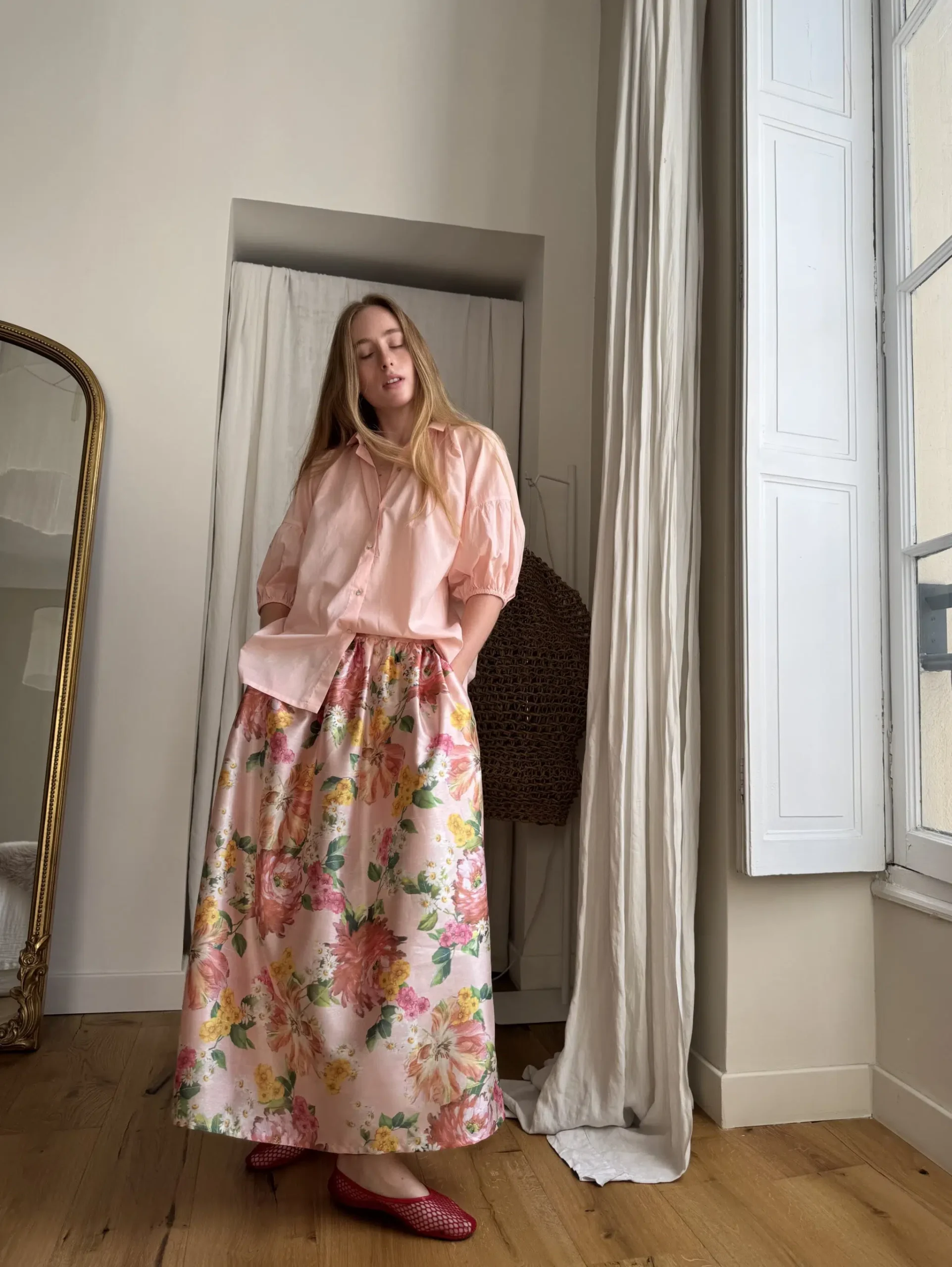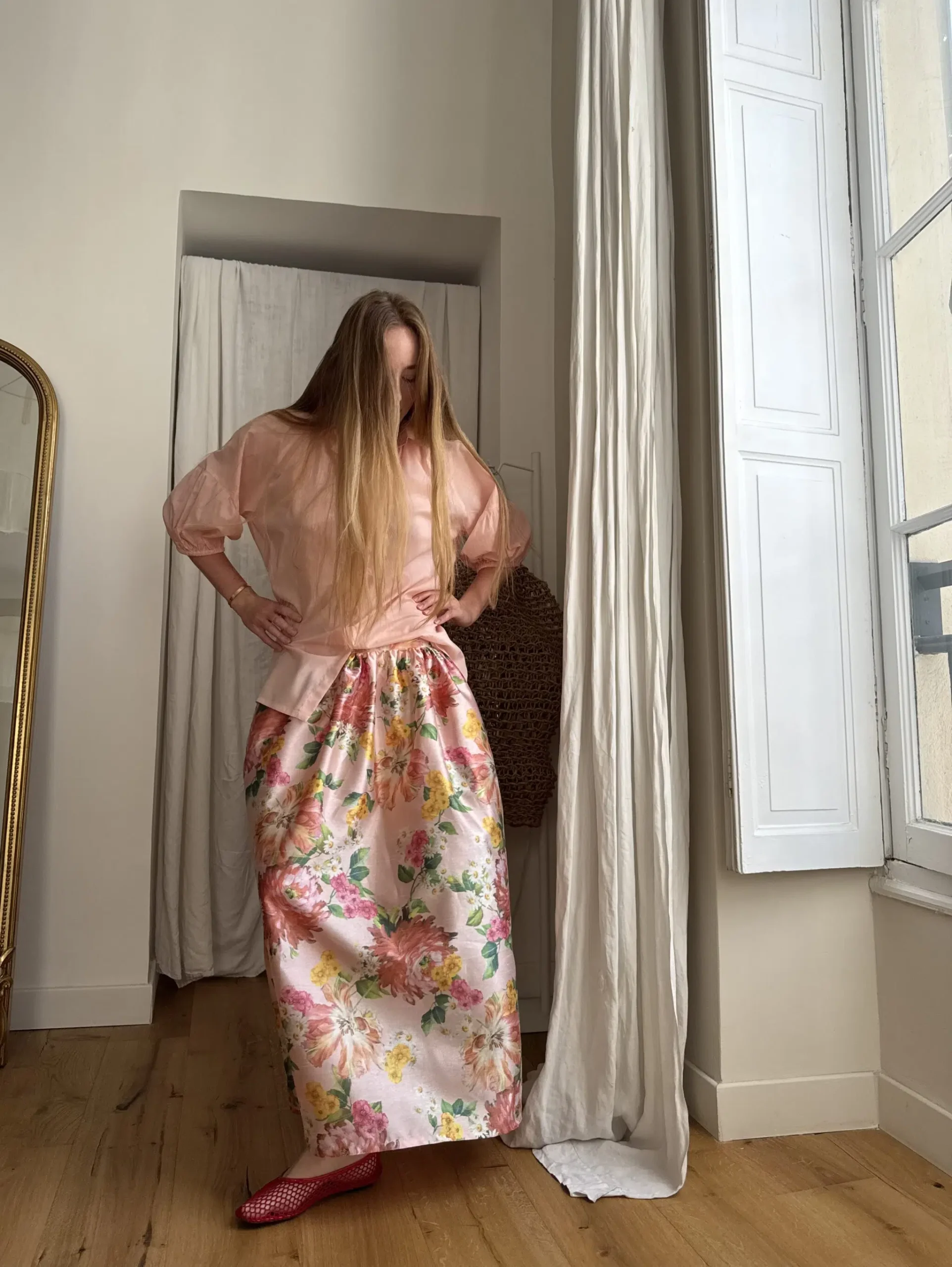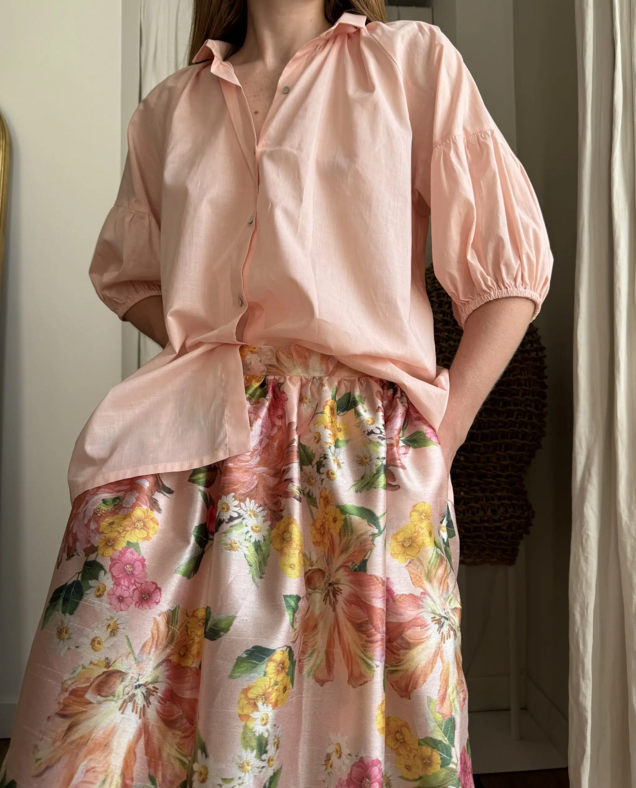Jupe « AMBRE » fleurie. Taille sur élastique au dos & biais sur le devant. Fronces, poches latérales. PETITE ÉDITION.