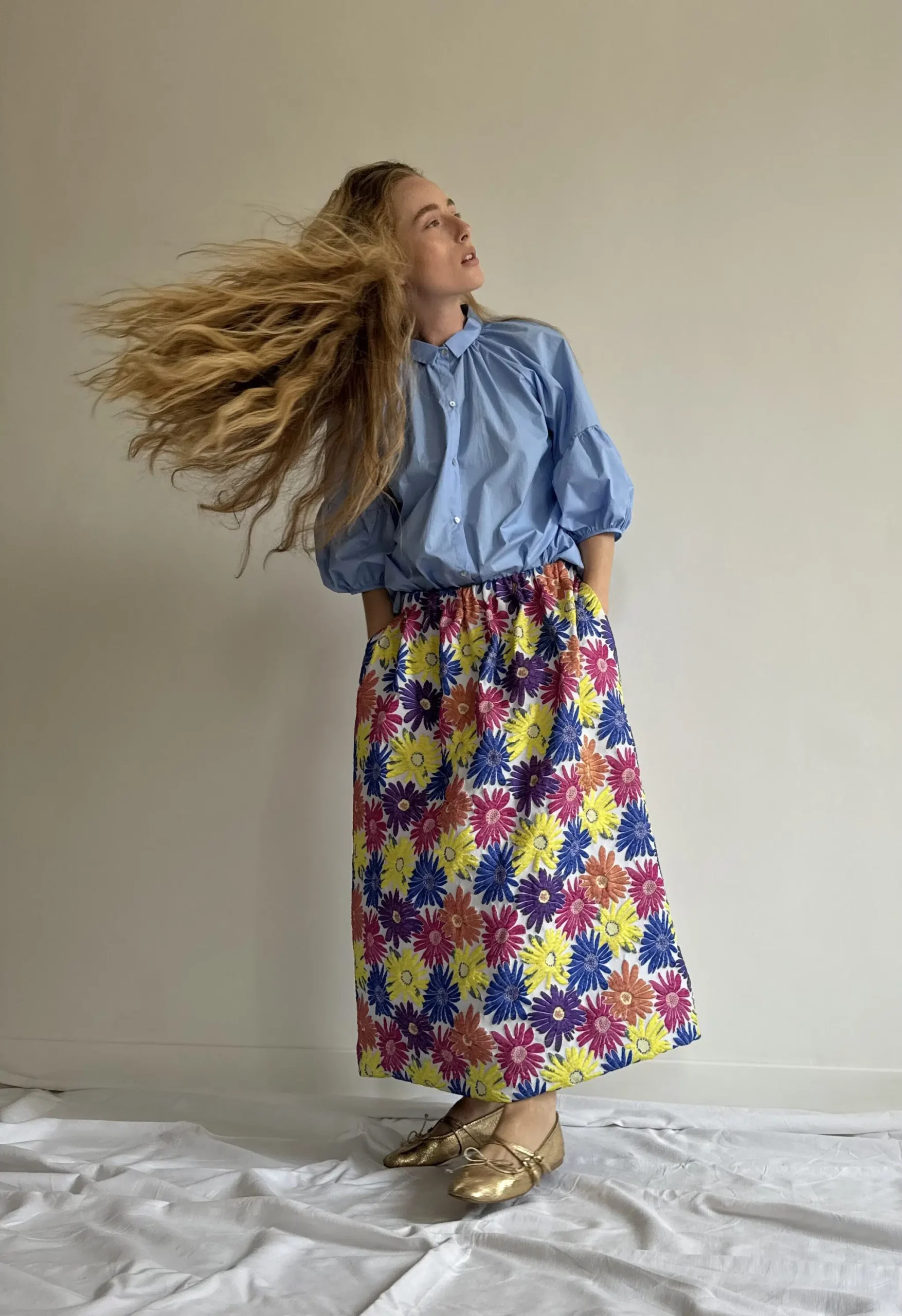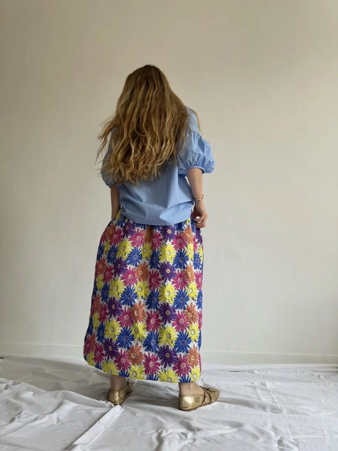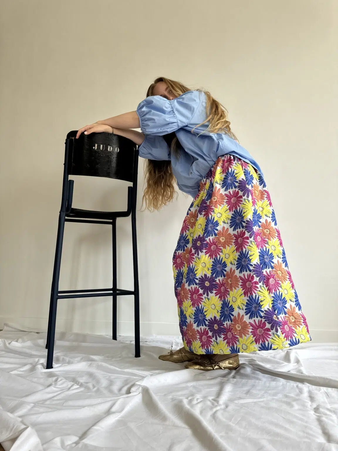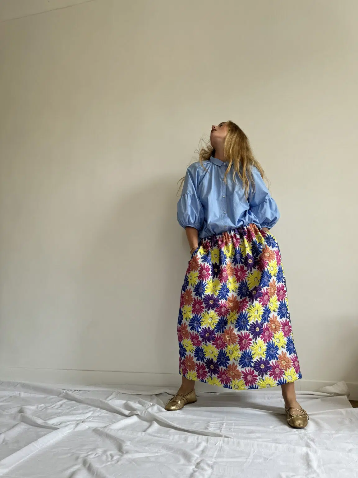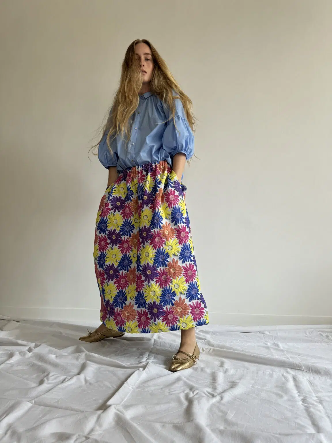 Jupe « AMBRE » dans un sublime jacquard fleuri. Taille sur élastique, fronces, poches. Une jupe élégante et minimaliste.