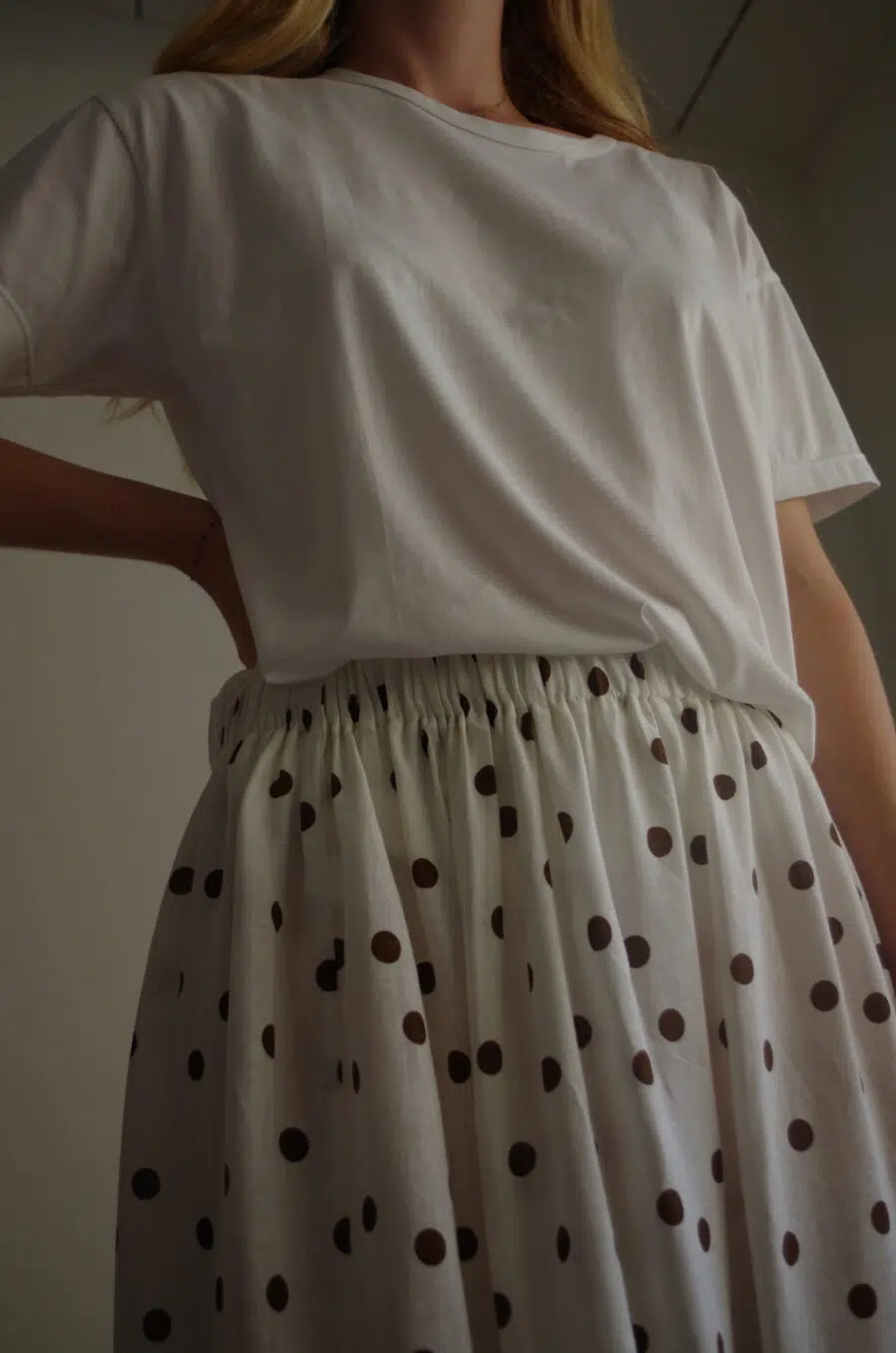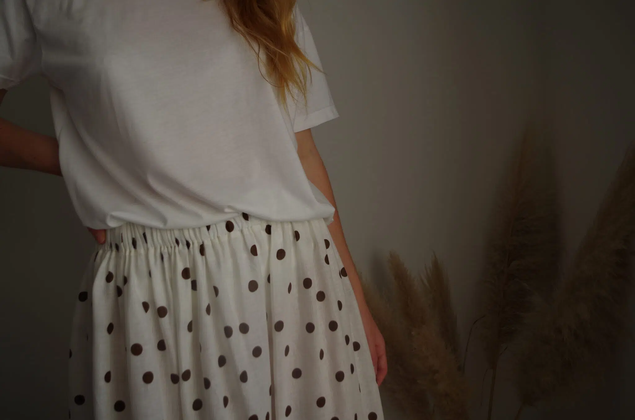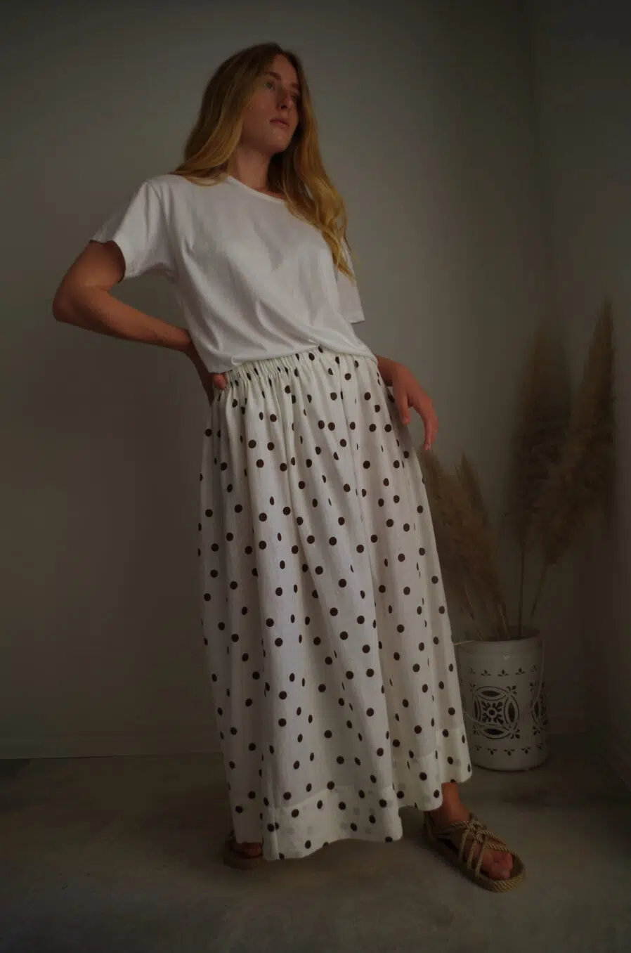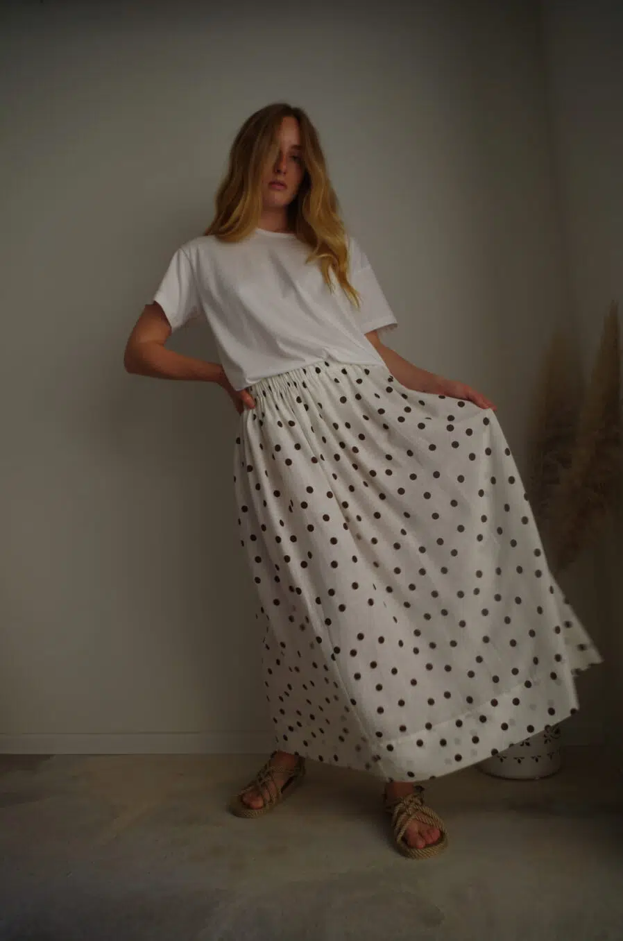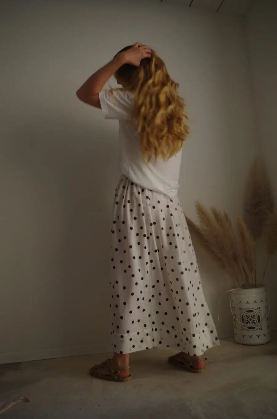 Jupe midi, ample, longueur cheville, fendue à l’arrière, élastique à la taille. Légèrement transparente, sous jupe disponible sur le site.