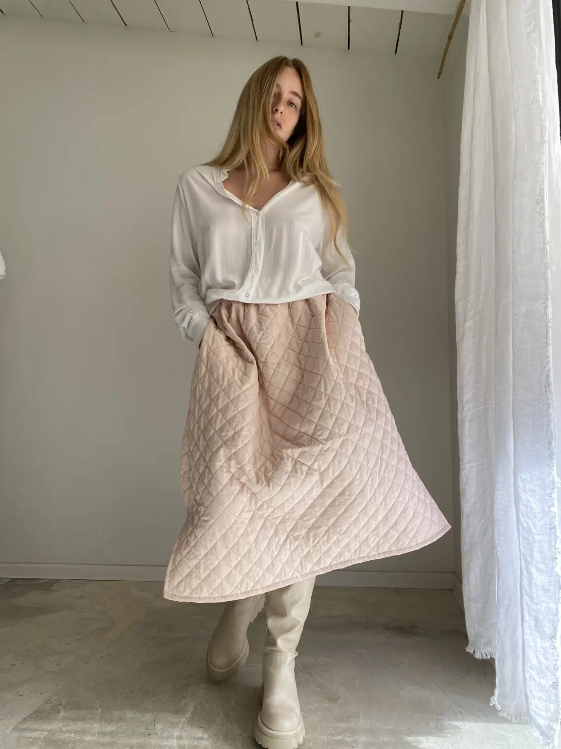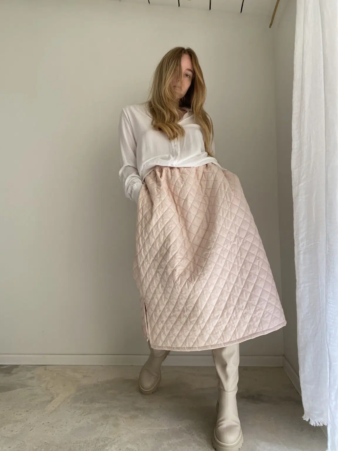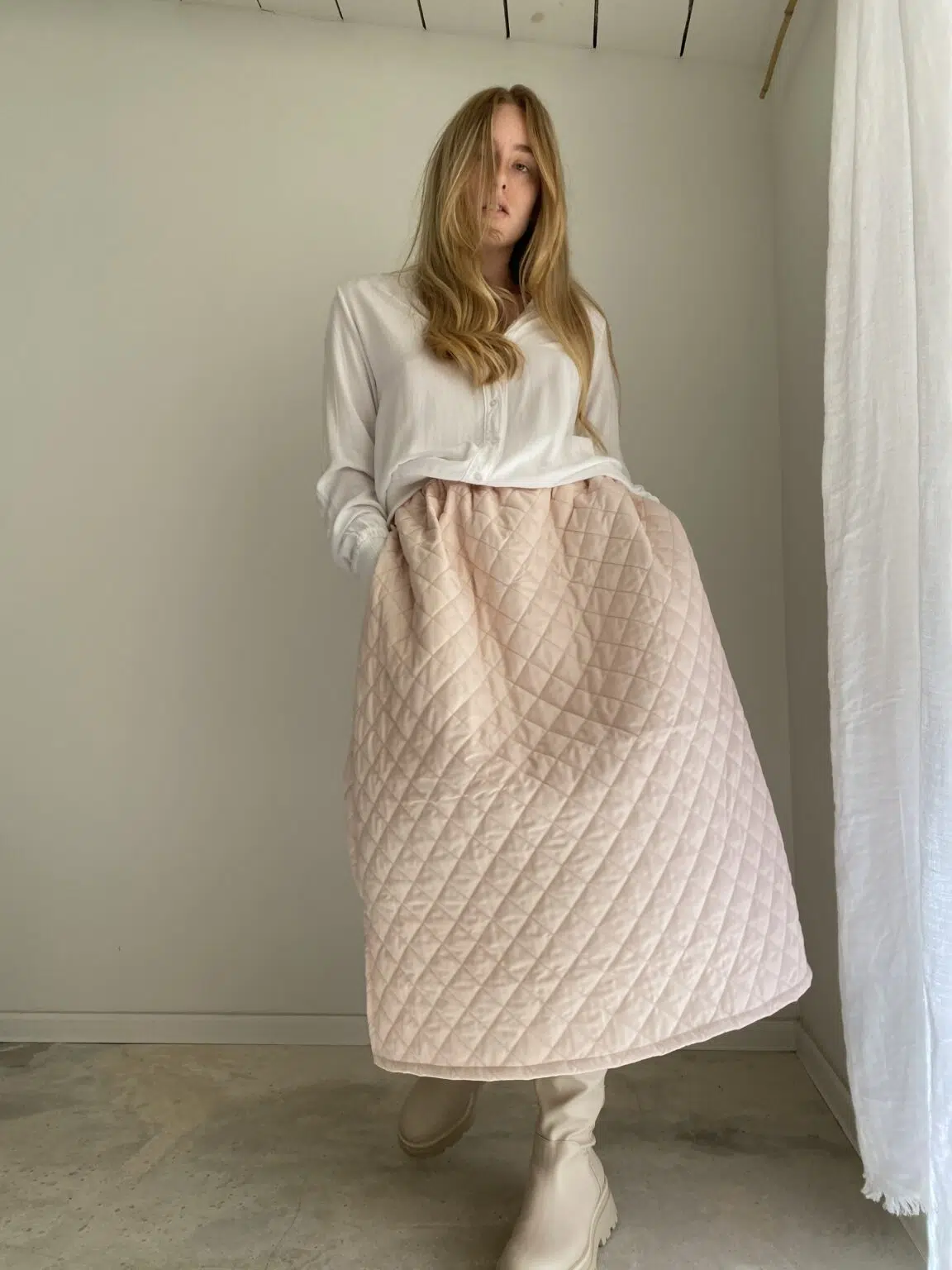 Jupe longue matelassée rose poudrée, élastique à la taille, poches latérales, bouffantes, légère et surtout UNIQUE ! LA pièce tendance !
