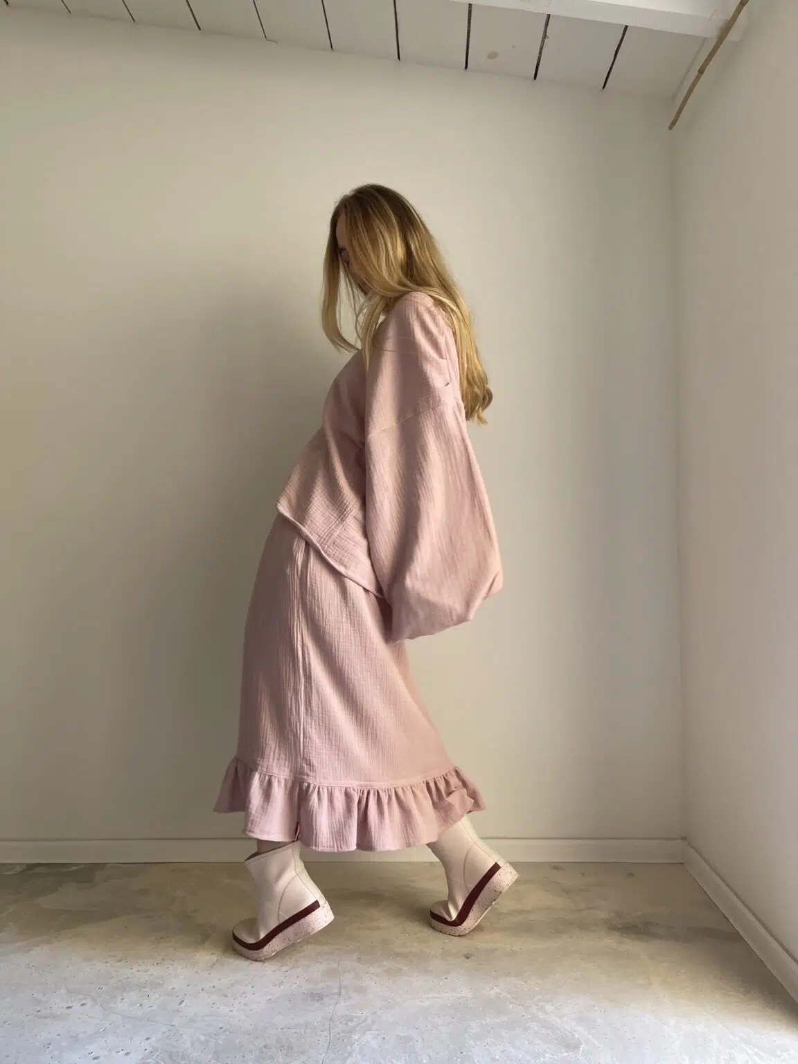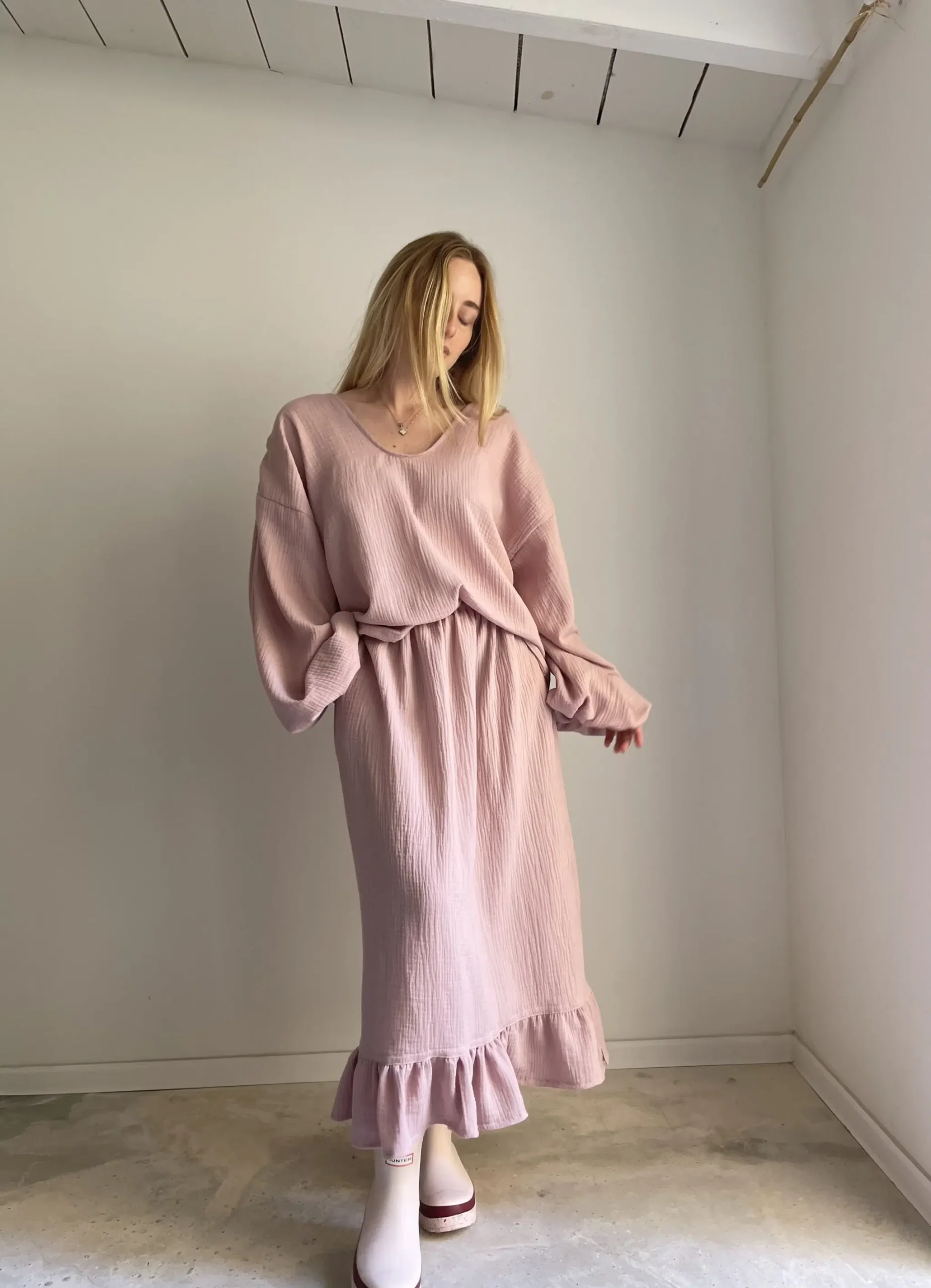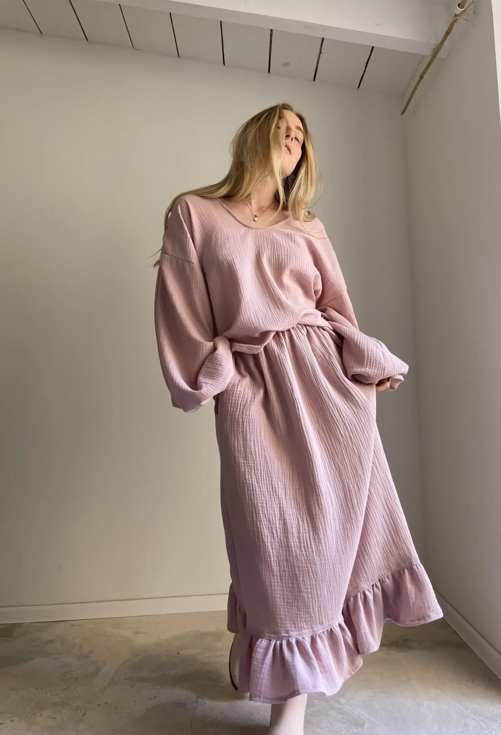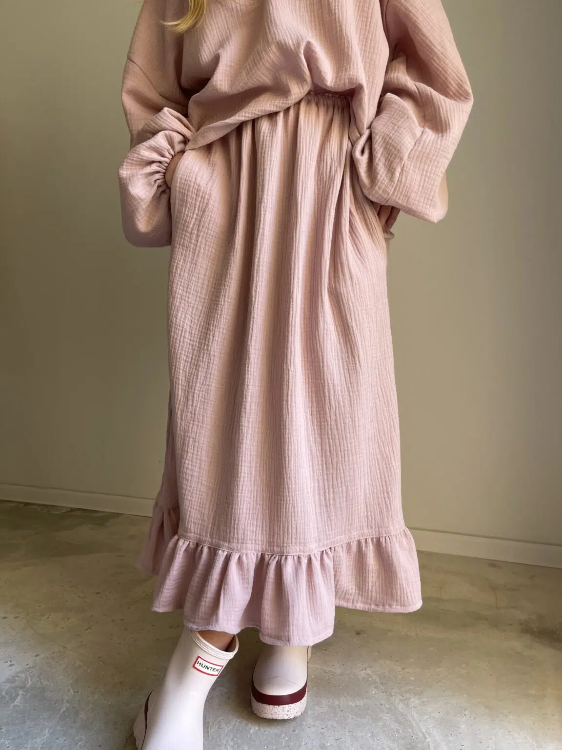 Jupe en gaze de coton rose poudré, élastiquée à la taille, poches latérales, volants. Si facile et agréable à porter. PIÈCE UNIQUE !