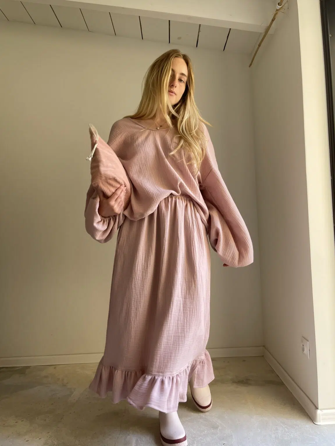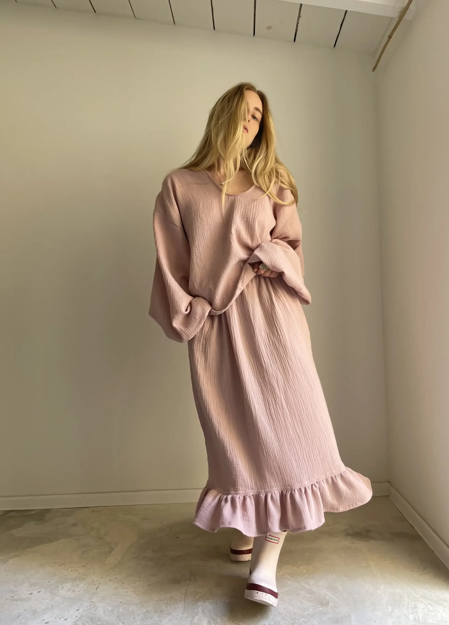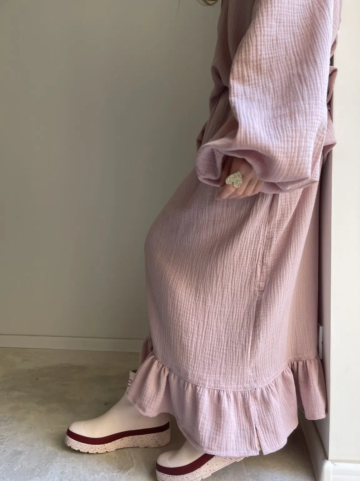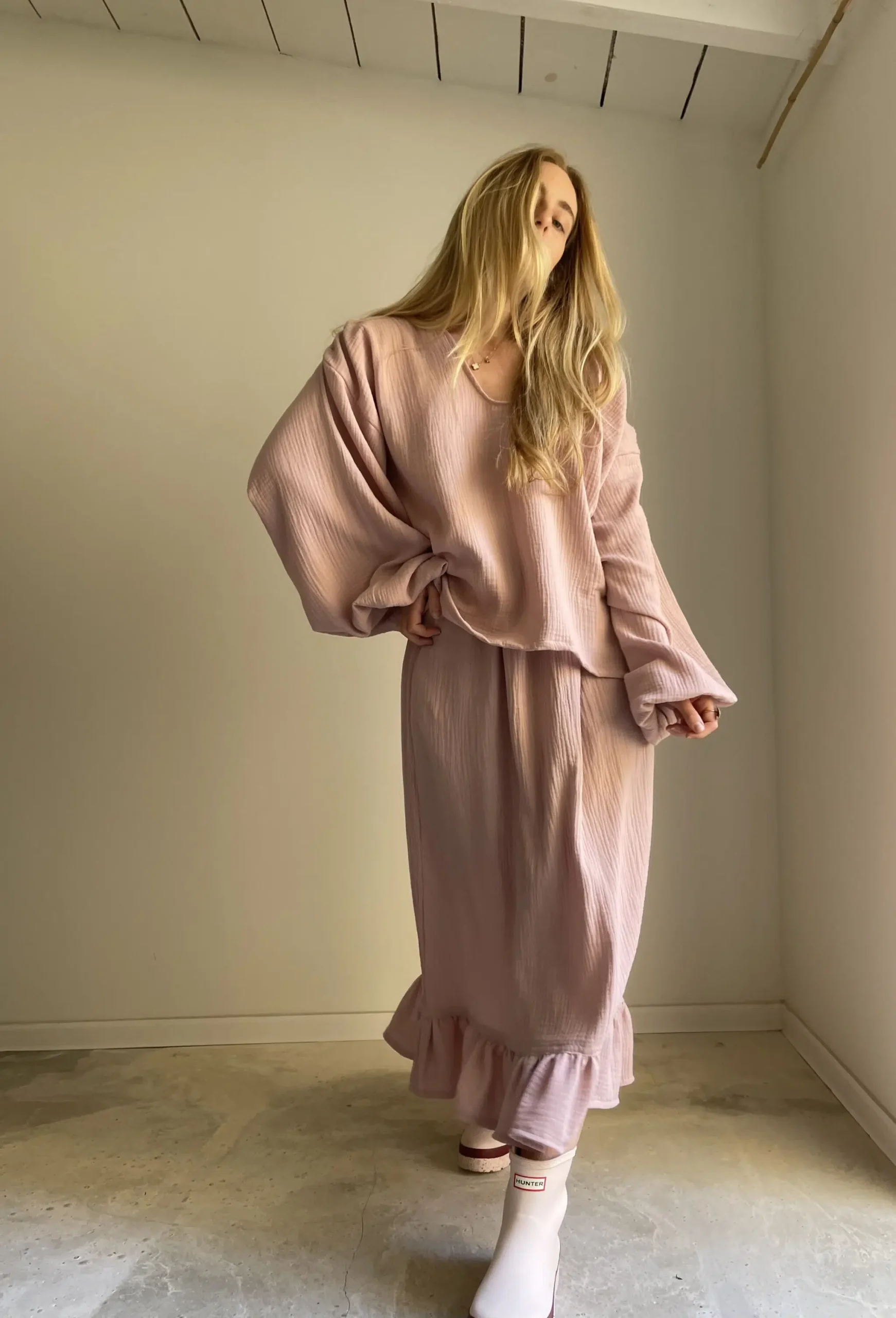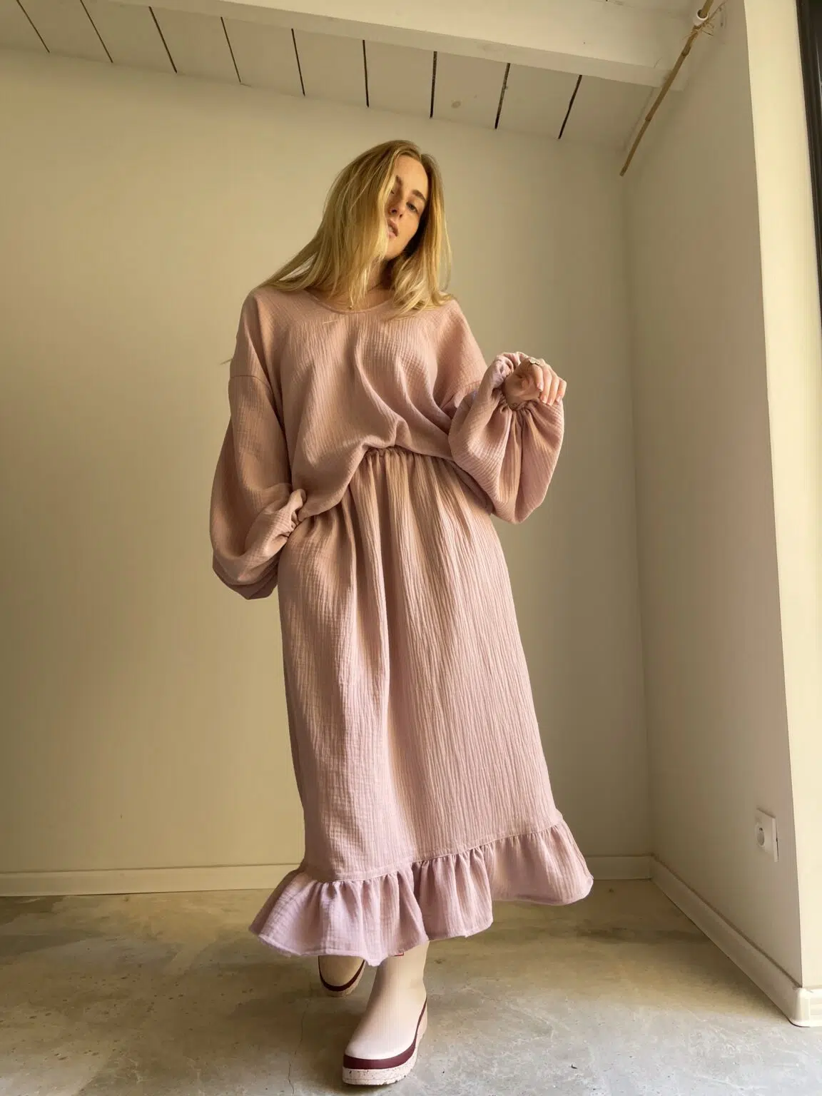 Jupe en gaze de coton rose poudré, élastiquée à la taille, poches latérales, volants. Si facile et agréable à porter. PIÈCE UNIQUE !
